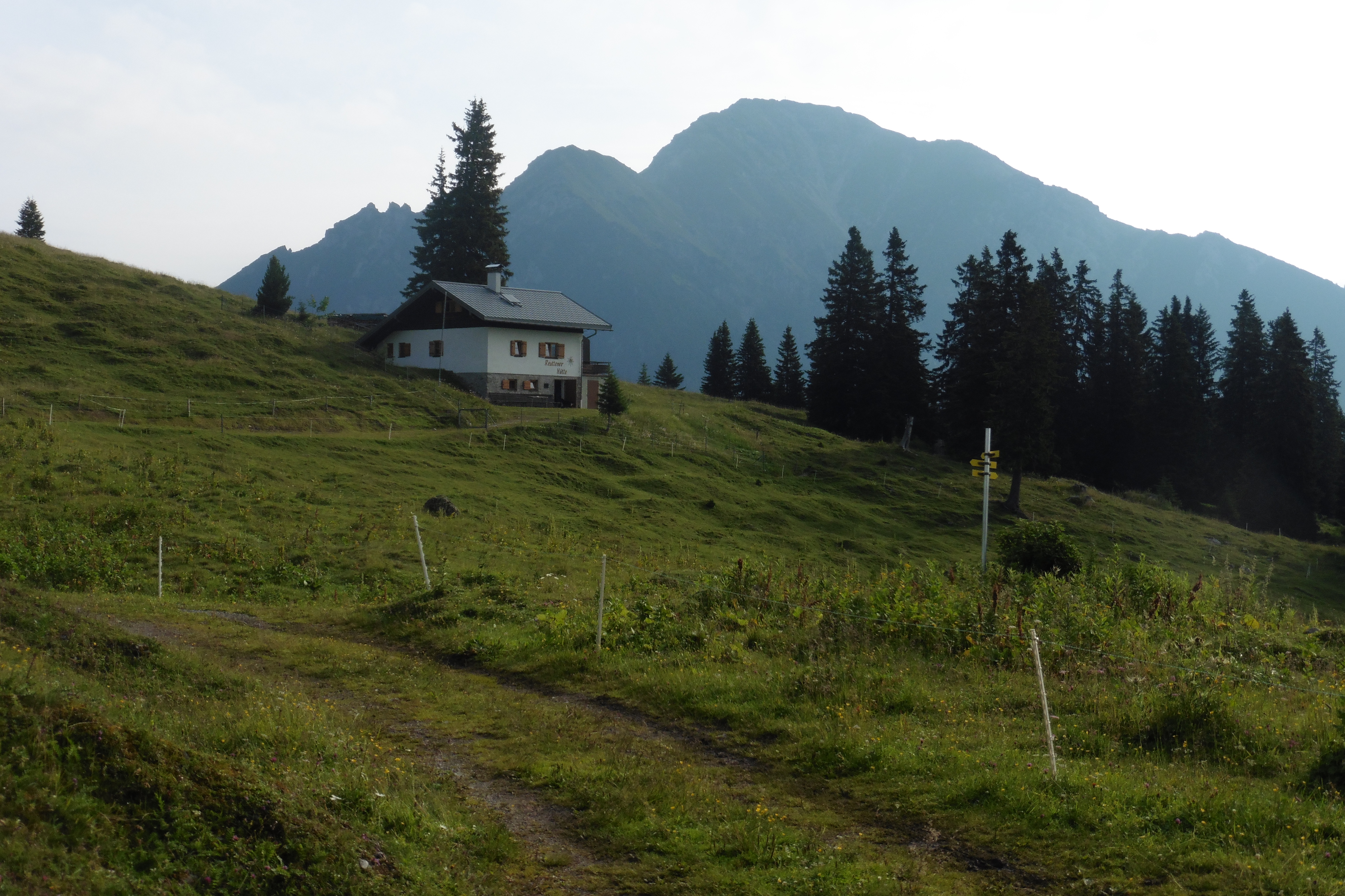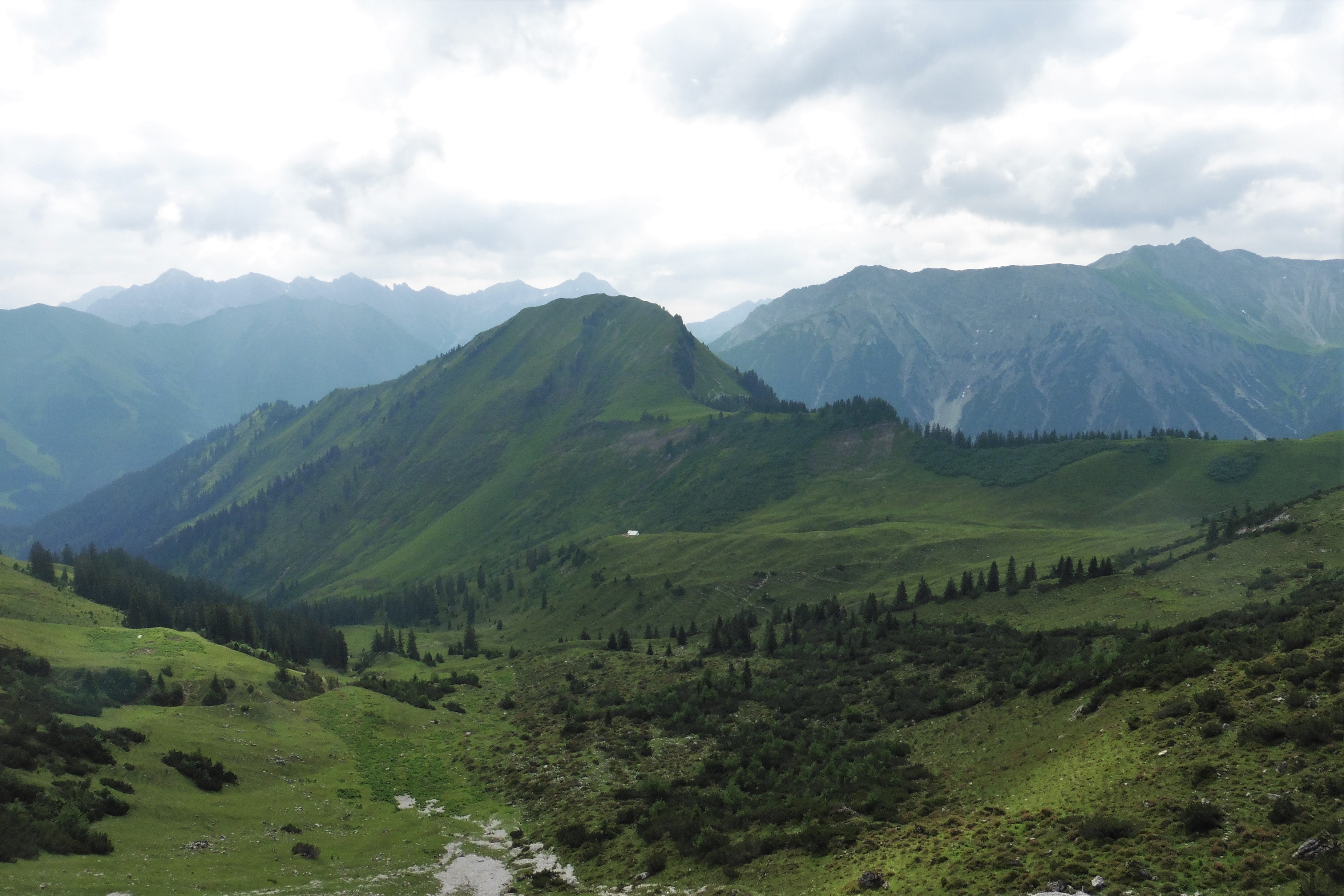 Bild 5: unter der Kelmer Spitze leuchtet das Dach der Raaz-Galtalpe; über diese führt der weitere Abstieg;
