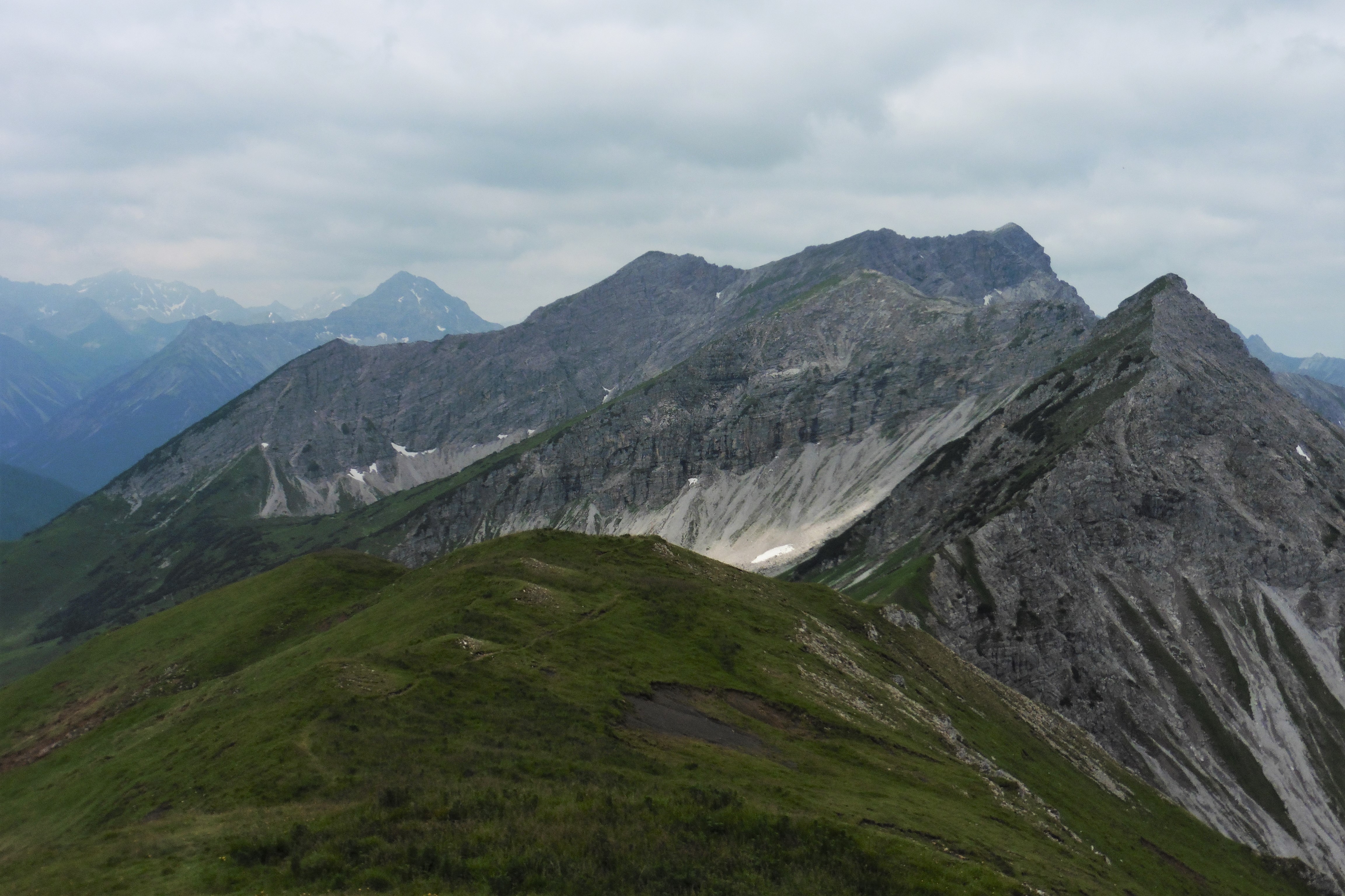 Bild 3: Abstieg vom Gipfel; rechts die Steinkarspitze, in der Mitte die Knittelkarspitze und links die Namloser Wetterspitze;