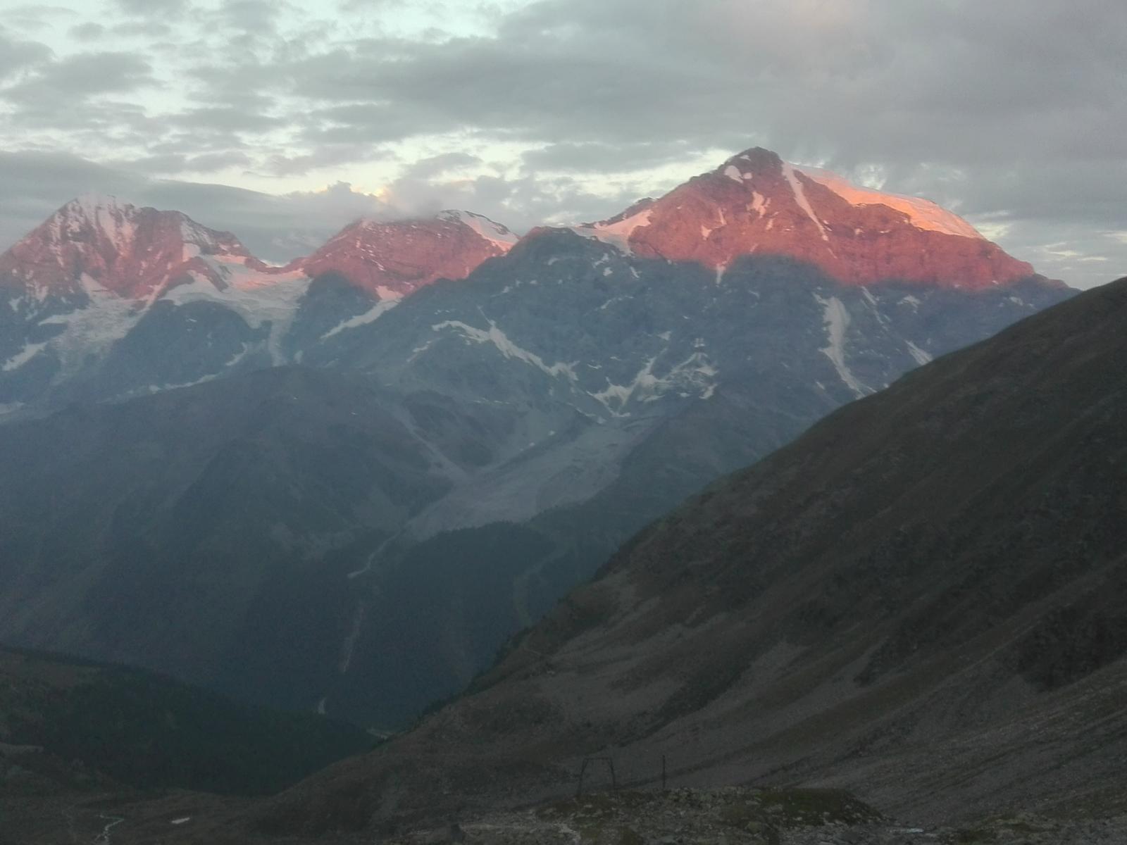 Sonstiges: Es bietet sich an, nach dem Hohen Angelus noch die Vertainspitze (3545m) zu besteigen und von dort wieder direkt nach Sulden abzusteigen. Dazu steigt man vom Hohen Angelus in Blockgelände auf Wegspuren über den Westgrat bis in die Angelusscharte (3337m) ab (der von der Hütte direkt dorthin führende Weg ist laut Wirt nicht mehr empfehlenswert). Von der Scharte weglos durch blockigen Schutt etwa 50 Hm nach Süden auf den Laaser Ferner und diesen flach nach Süden zum Rosimjoch queren (der früher offenbar übliche Weg, der nur den ersten Gratturm im Ostgrat der Vertainspitze südlich quert und dann gleich auf den Ostgrat führte, ist laut Wirt ebenfalls nicht mehr empfehlenswert. Es schaut auch nach steiler "Schuttwüste" aus. Der Weg über das Rosimjoch dürfte angesichts dieses Schutts auch nicht länger dauern). Zur Zeit ist diese Wegstrecke etwa zur Hälfte (im flachen Teil) blank, unterhalb des Rosimjoch liegt noch Firnschnee bis zum Joch hinauf. Spalten waren auch keine zu sehen. Wir brauchten keine Steigeisen. Vom Rosimjoch dann Abstecher auf markiertem Weg Nr. 11 zum Gipfel der Vertainspitze. Soweit kamen wir aber nicht, denn kaum waren wir im Rosimjoch, donnerte es bereits um 10.30 gegenüber und wir stiegen direkt auf Weg Nr. 11 nach Sulden ab und gerieten dabei gleich in einen etwa 30-minütigen Graupelschauer. Kaum waren wir weiter unten, klarte es wieder auf. Am späten nachmittag erneut Gewitter.