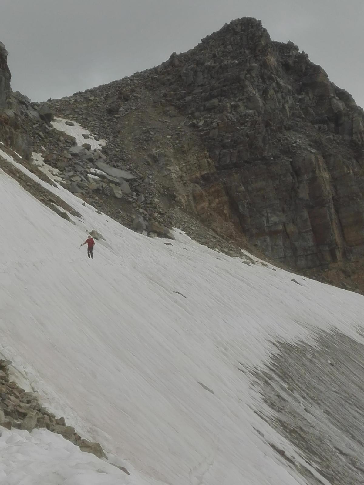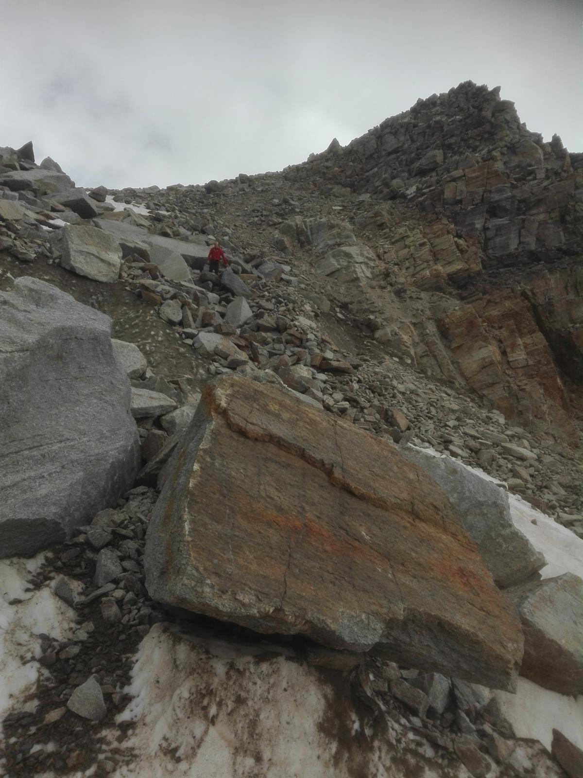 Tourenverhältnisse: Gewittrig. Von der Hütte auf dem Reinstadler Weg (gelbe Markierung) erst in die Schuttwüste des hinteren Zaytal hinein und dann über den NNW-Grat, zum Schluß über den obersten Westgrat immer in Blockgelände zum Gipfel (800 Hm). Am NNW-Grat Stellen I- I+, kurze Stellen mit Stahlseil gesichert. Die Tour ist momentan ohne Schneeberührung durchführbar.