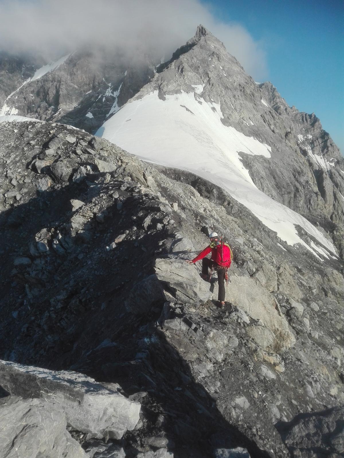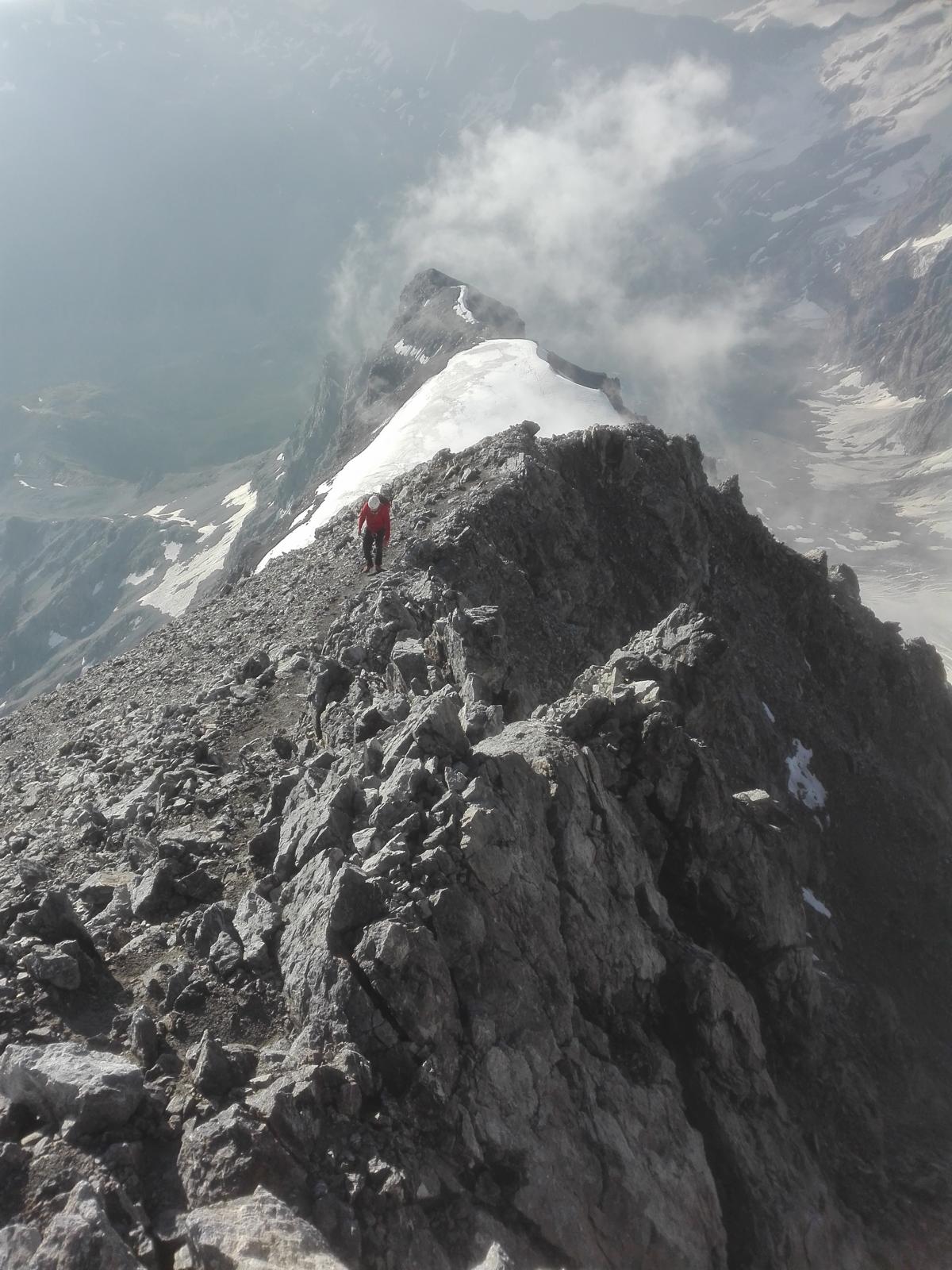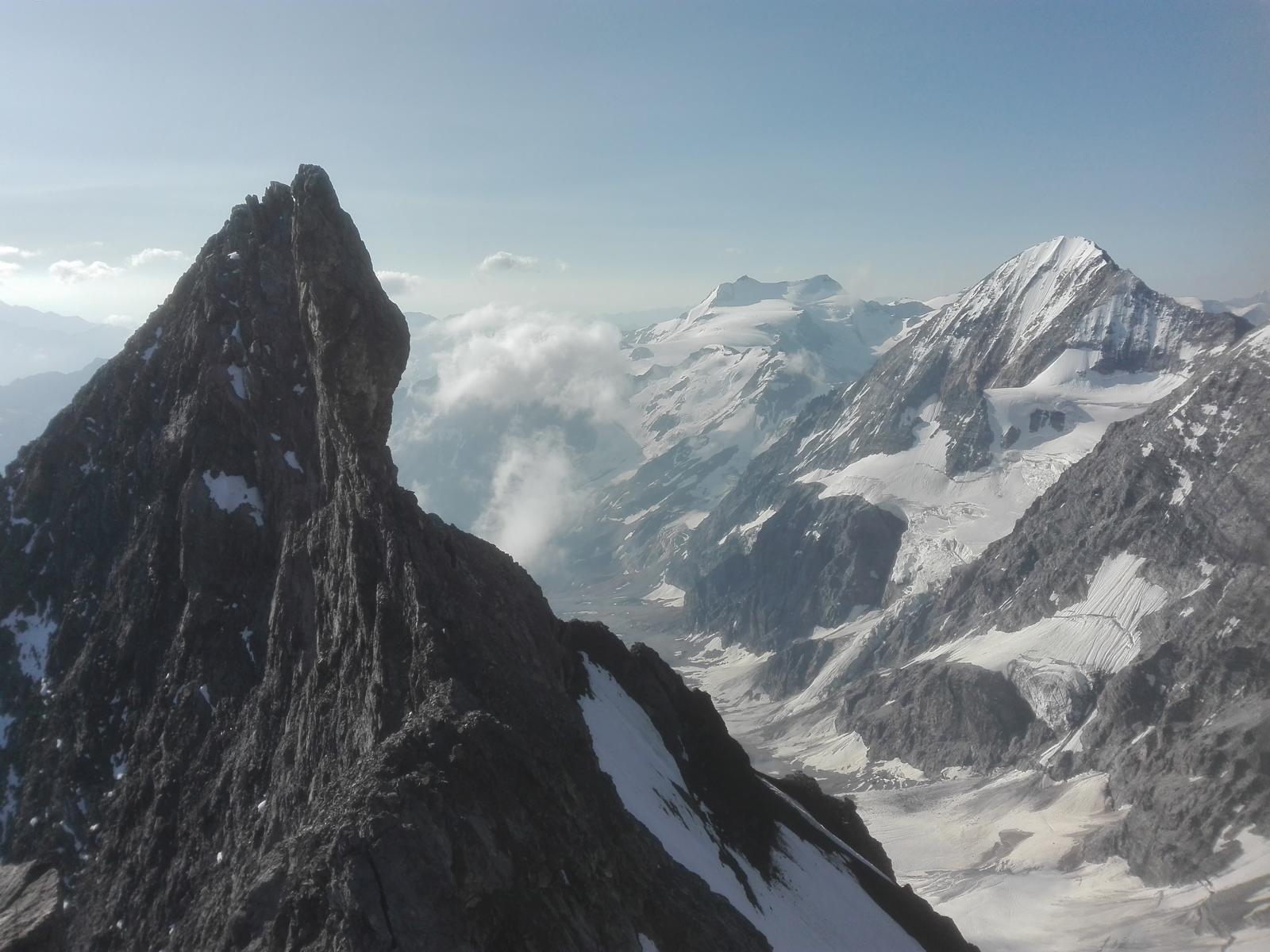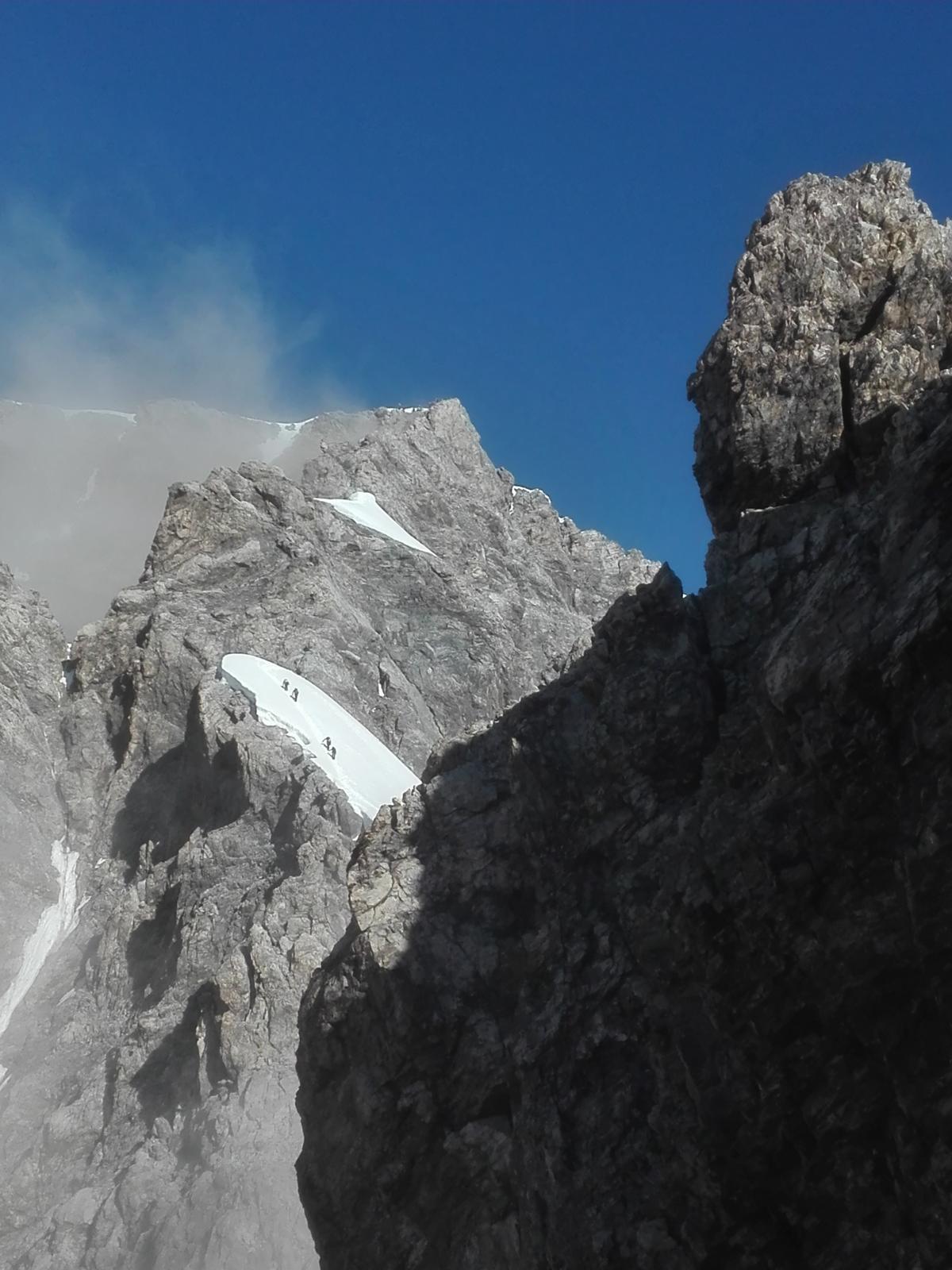 Tourenverhältnisse: Sehr gut. Wie in tourentipp.de beschrieben am Vortag auf die Hintergrathütte und über den Hintergrat zum Gipfel. Die Beschreibung entspricht auch heute noch der Realität. Erwähnenswert ist, dass die Querung des Signalkopfes nur ganz wenige (höchstens fünf) Meter unterhalb desselben beginnt, dort ist auch eine Stange angebracht. Sobald man nach Umgehung des Signalkopfes wieder auf dem Grat ist, kommt bereits nach wenigen Metern die Schlüsselstelle. Diese ist heute genauso abdrängend und im Zweifel noch abgeschmierter als im Zeitpunkt der Beschreibung, dafür steckt nun ein Bohrhaken und ist das Drahtseil durch eine solide Kette ersetzt worden. Die Stelle ist rund vier Meter hoch, dann wird es wieder leichter. Nicht erwähnt ist, dass es nach der zweiten IVer-Stelle nach dem zweiten, teilweise steilen, Firnfeld noch ein kurzes drittes, deutlich flacheres als das zweite, gibt. Alle drei Firnabschnitte waren gut gespurt und hätten an diesem Tag sogar ohne Steigeisen begangen werden können. Ansonsten war der Grat komplett schneefrei und auch im Kar unterhalb des Unteren Knott lag nur noch ein Schneefeld auf dem Weg (welches früh morgens das härteste von allen war). Den totalen Kontrast zum Hintergrat bildet dann der Normalweg. Weite und über längere Strecken steile Gletscherflächen, aber mit breit ausgetretener Spur. Ins Bärenloch hinab dürfte es gut 40 Grad steil sein und hier kommt an manchen Stellen bereits Blankeis raus. Nach diesem letzten steilen Gletscherstück quert man nach rechts waagrecht (Stahlseil) zum Grat raus. Es folgt eine Abseilstelle (kann man sicher auch in der Nähe abklettern, ist ja auch der Aufstiegsweg) und ein steiles Gratstück, das mit einer langen Kette gesichert ist. Anschließend geht es etwas verwickelt weiter und wer den Weg nicht vom Aufstieg kennt, muss sehr aufpassen, keinen Verhauer einzubauen, insbesondere im Bereich unterhalb der Tabarettaspitze (man achte darauf, wie in der Beschreibung angegeben, leicht ansteigend eine letzte Scharte zu erreichen!, Wegspuren und auch Steinmänner verleiten einen hier, abzusteigen).