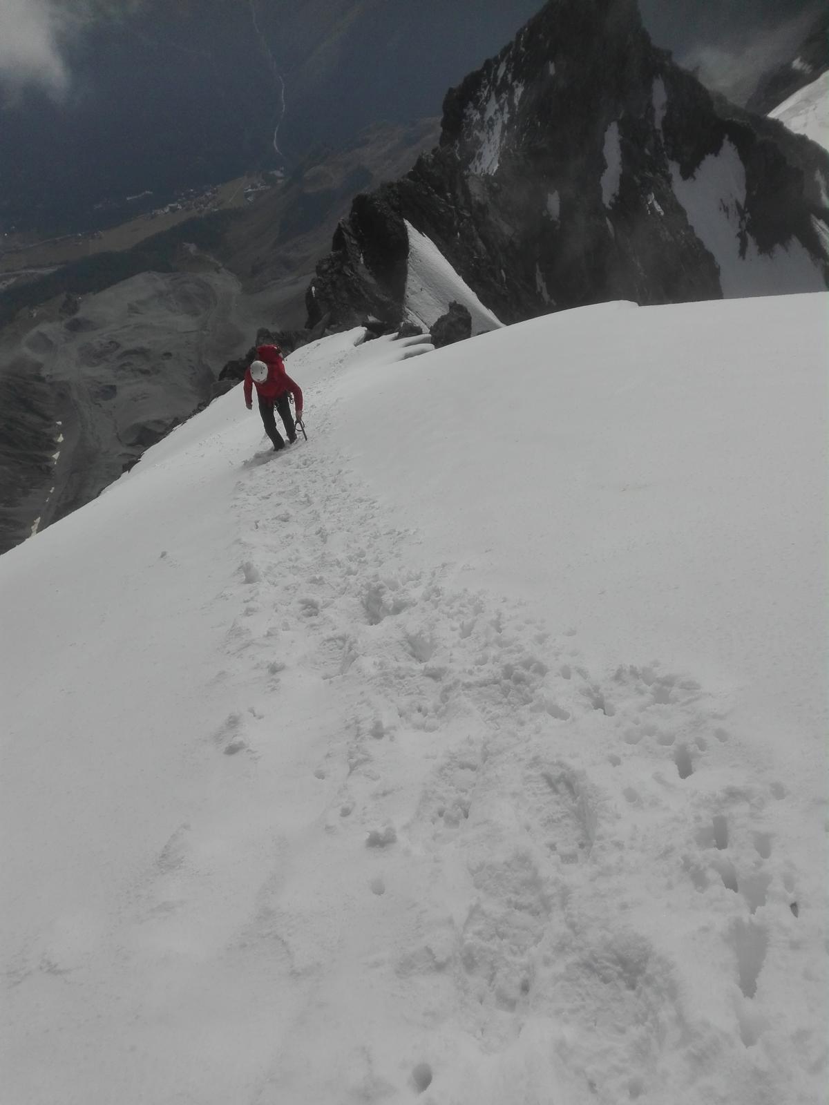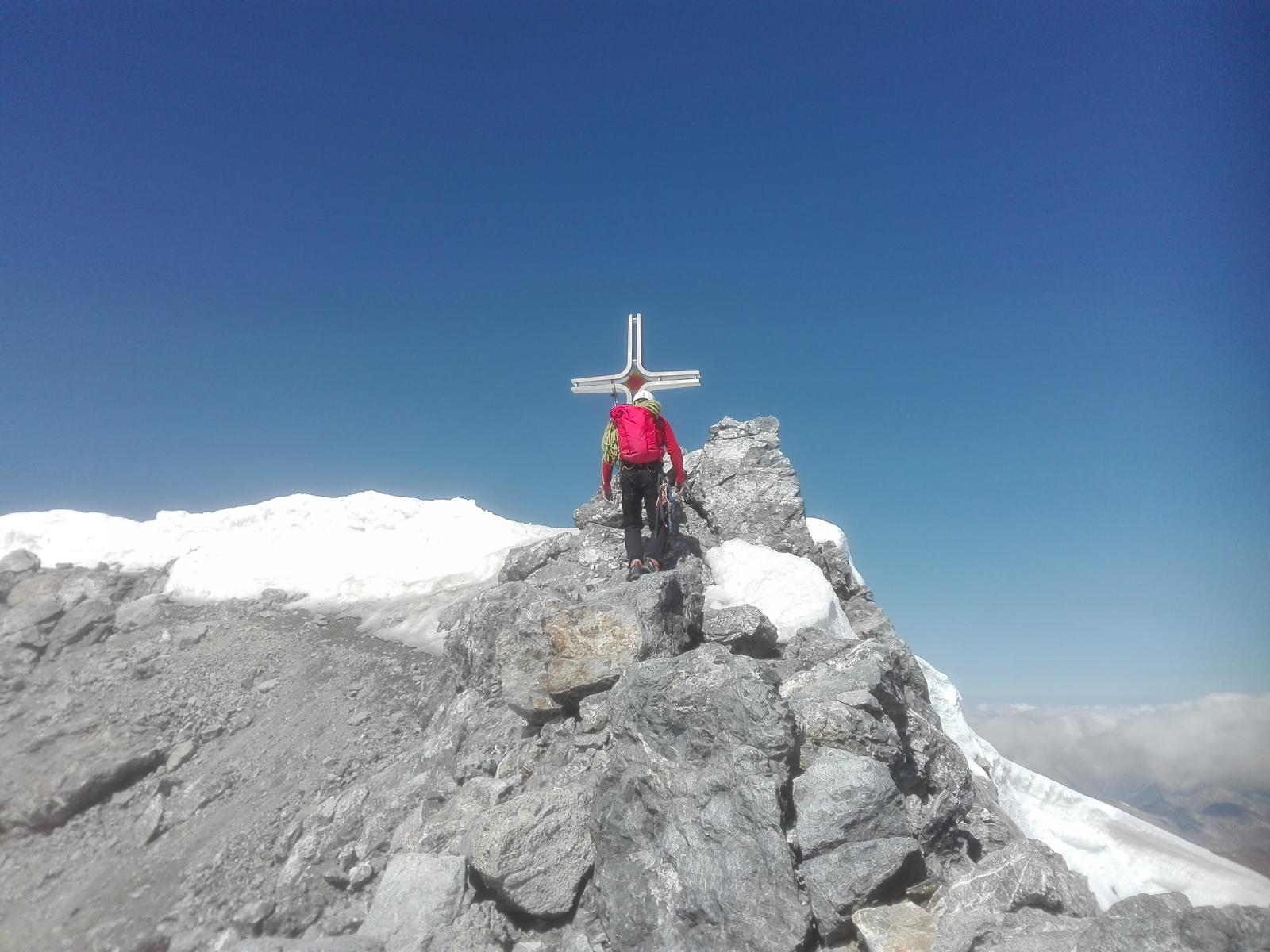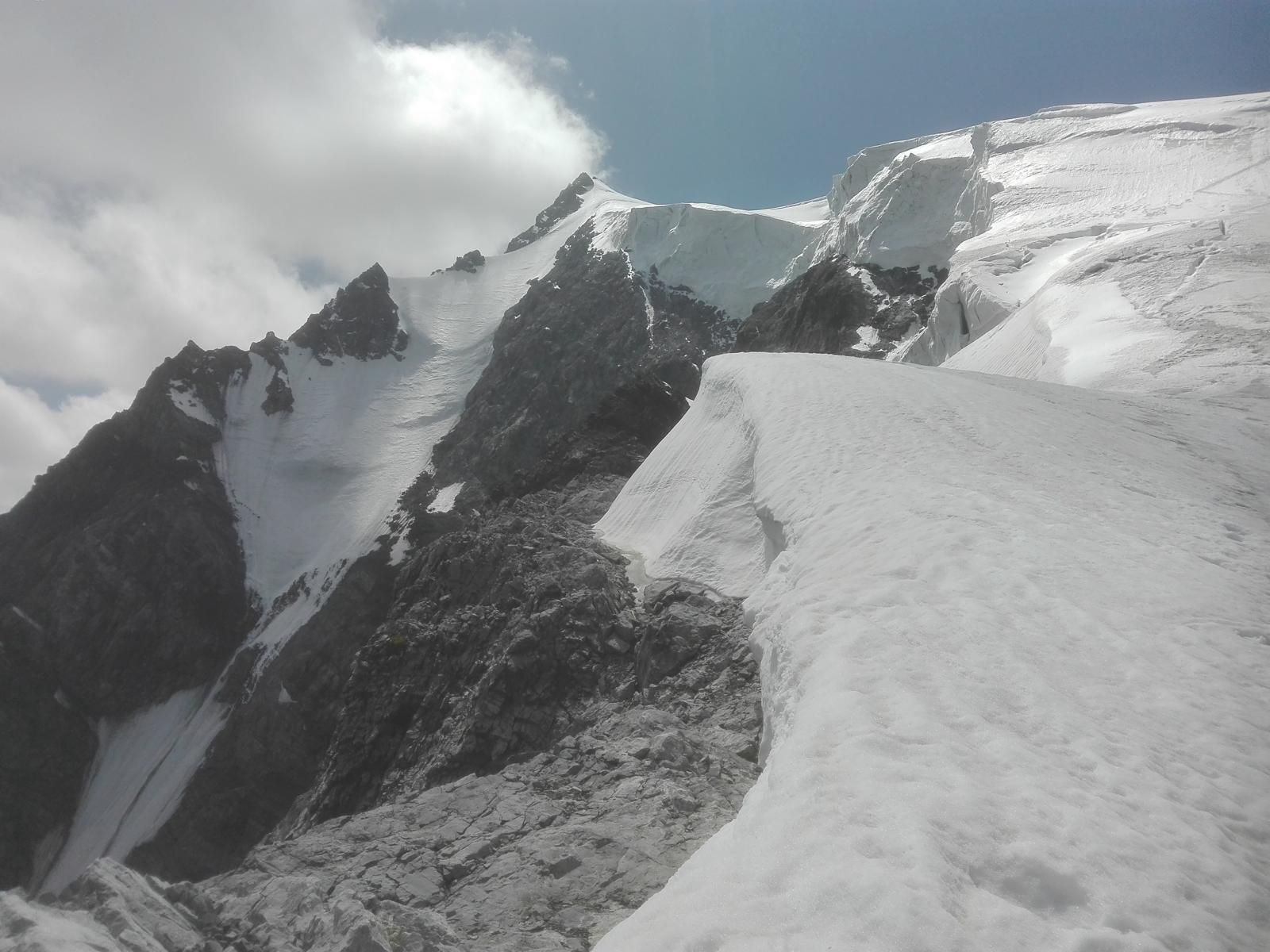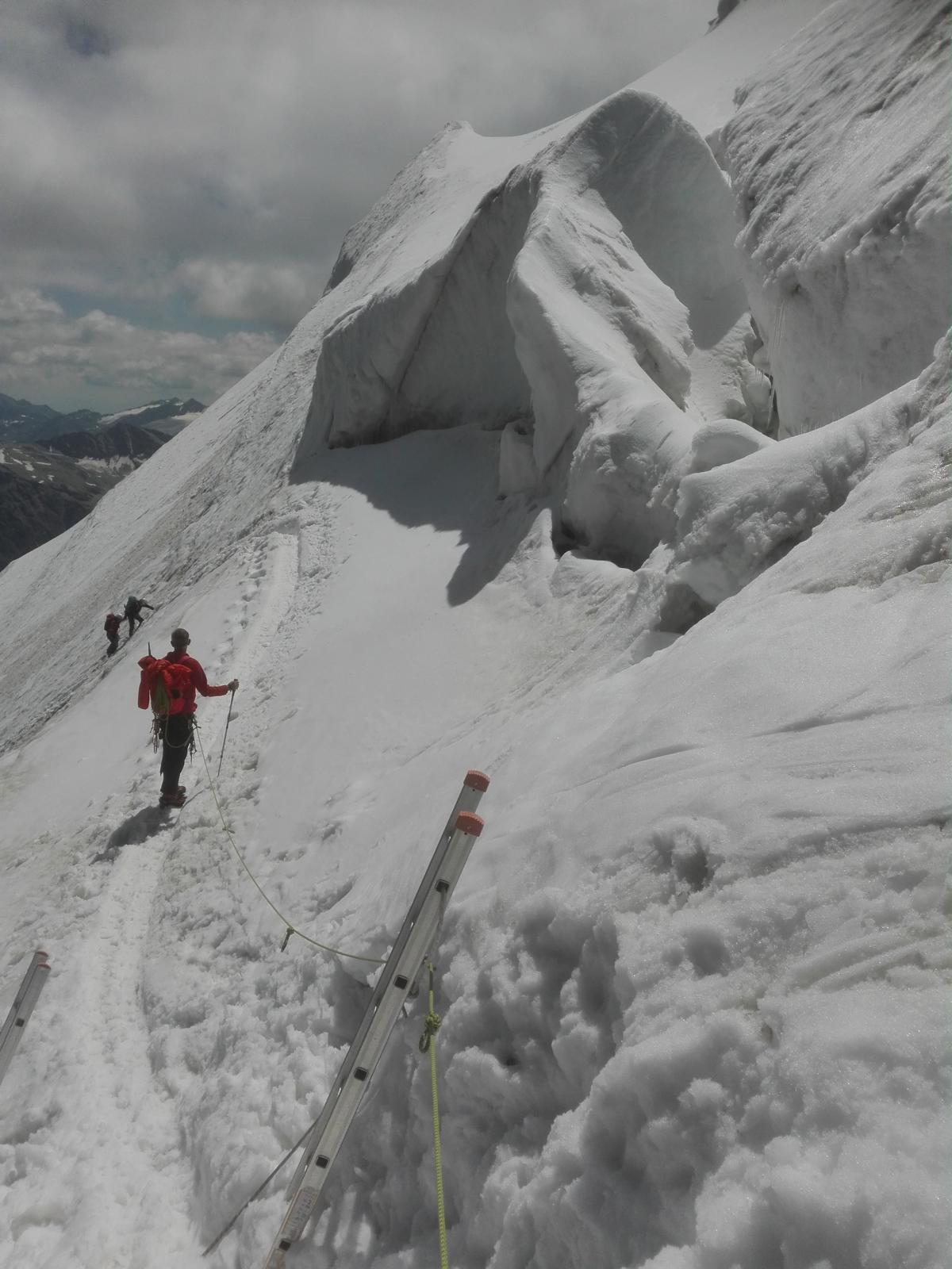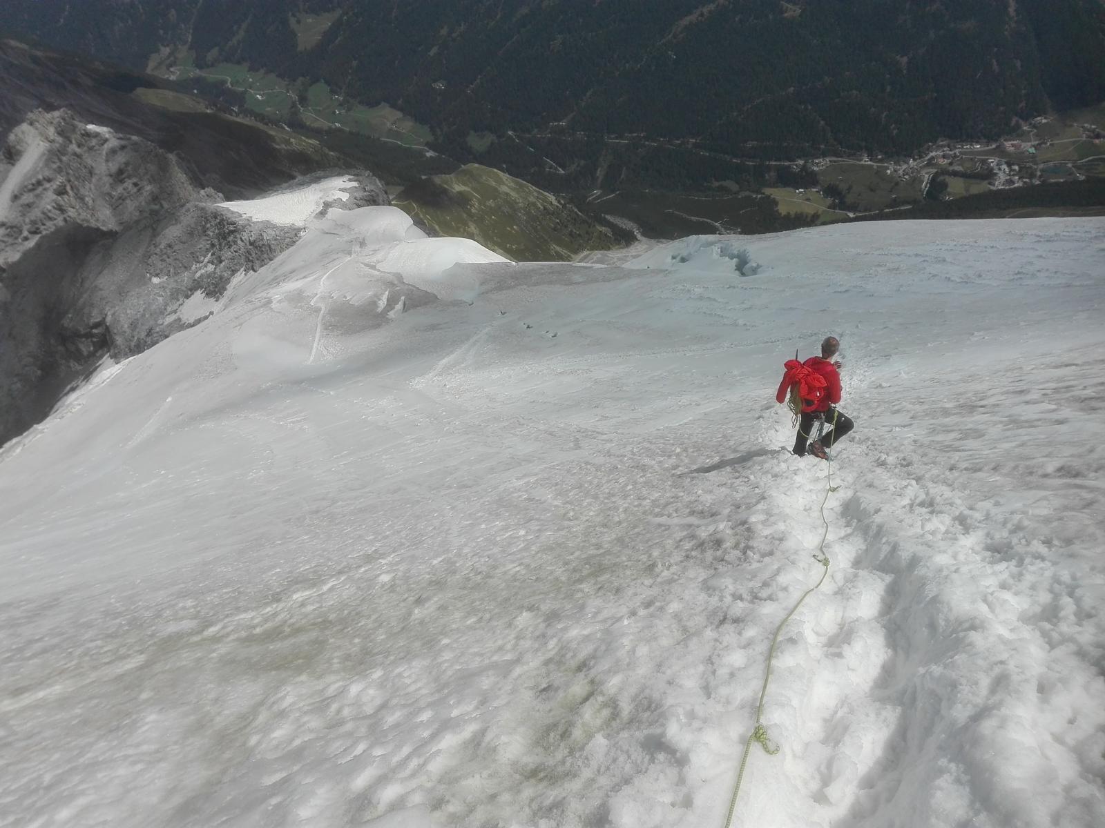 Gefahreneinschätzung: am Hintergrat gering, am Normalweg sind einige, auch größere, Spalten zu queren und steile Stellen, die beginnen blank zu werden