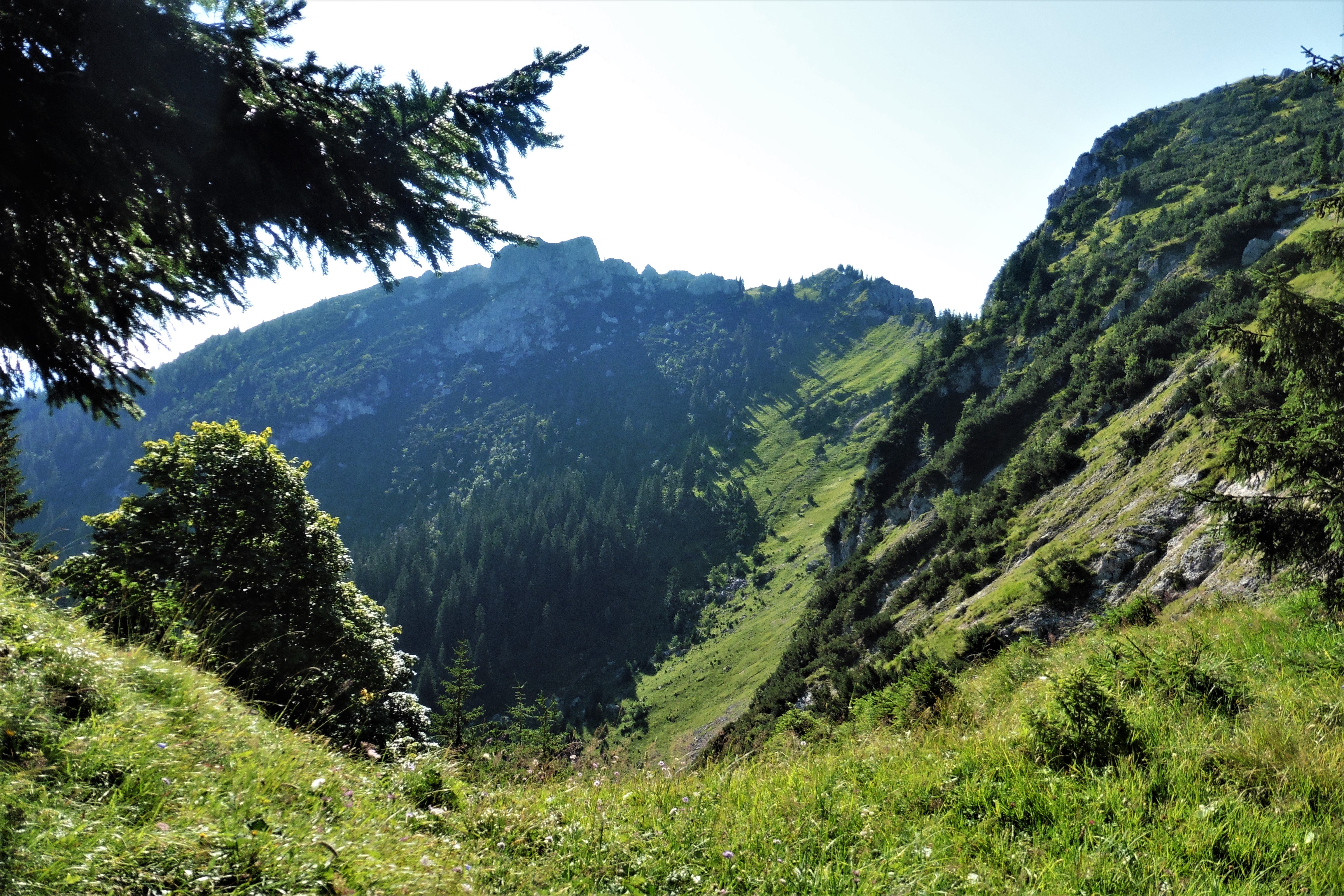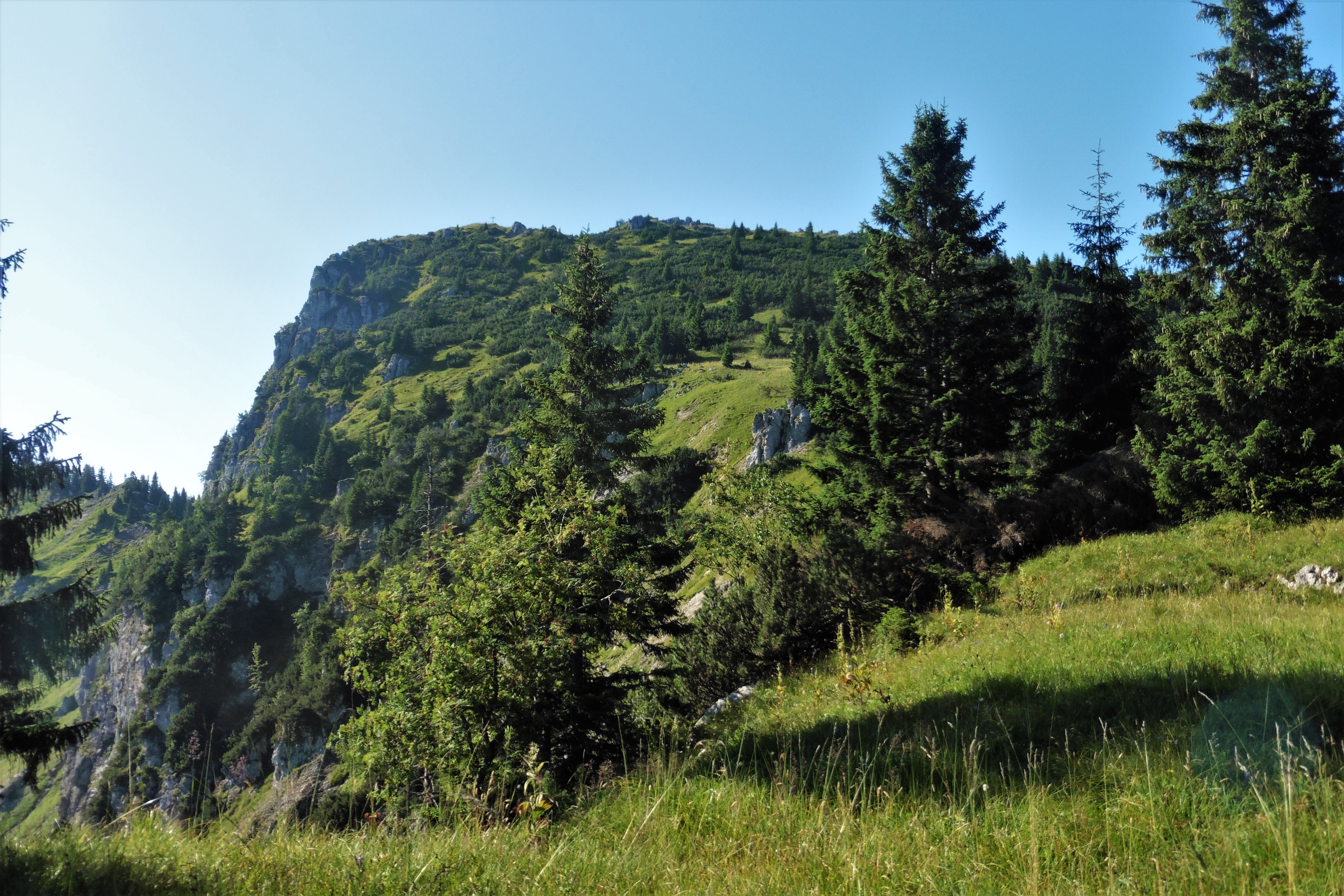 Bild 5: dies ist die markante Senke, die man am Rückweg von der Laubeneckalm erreicht; links der Teufelstättkopf;