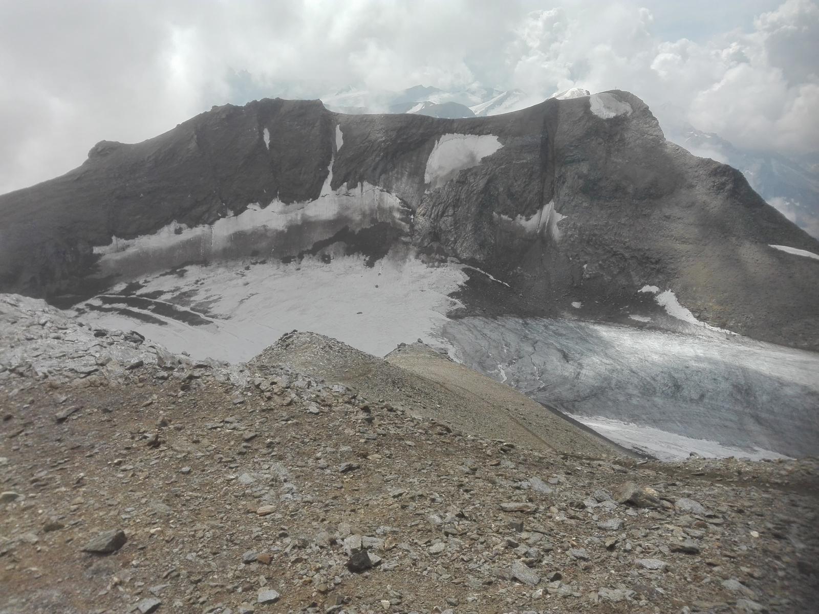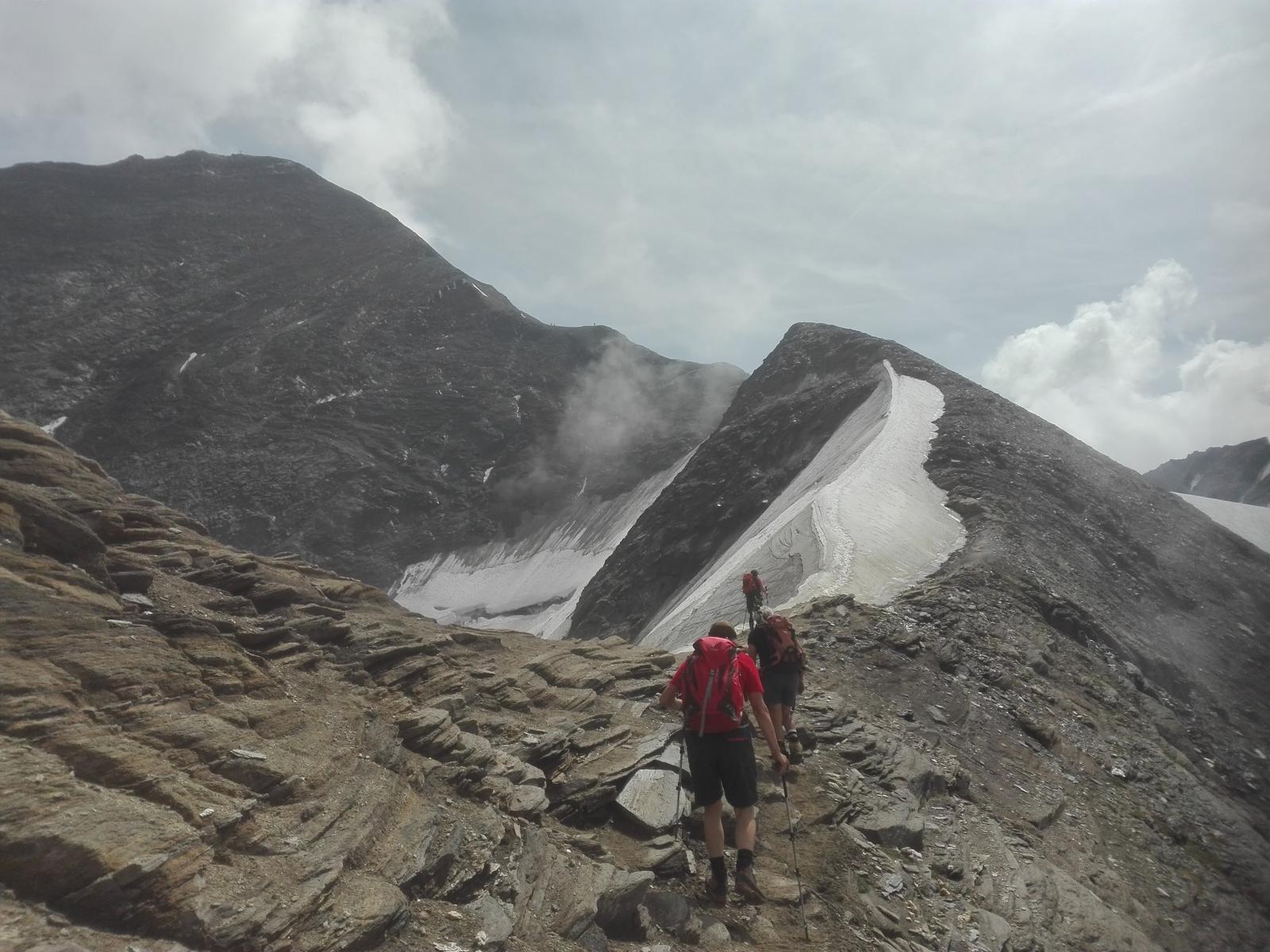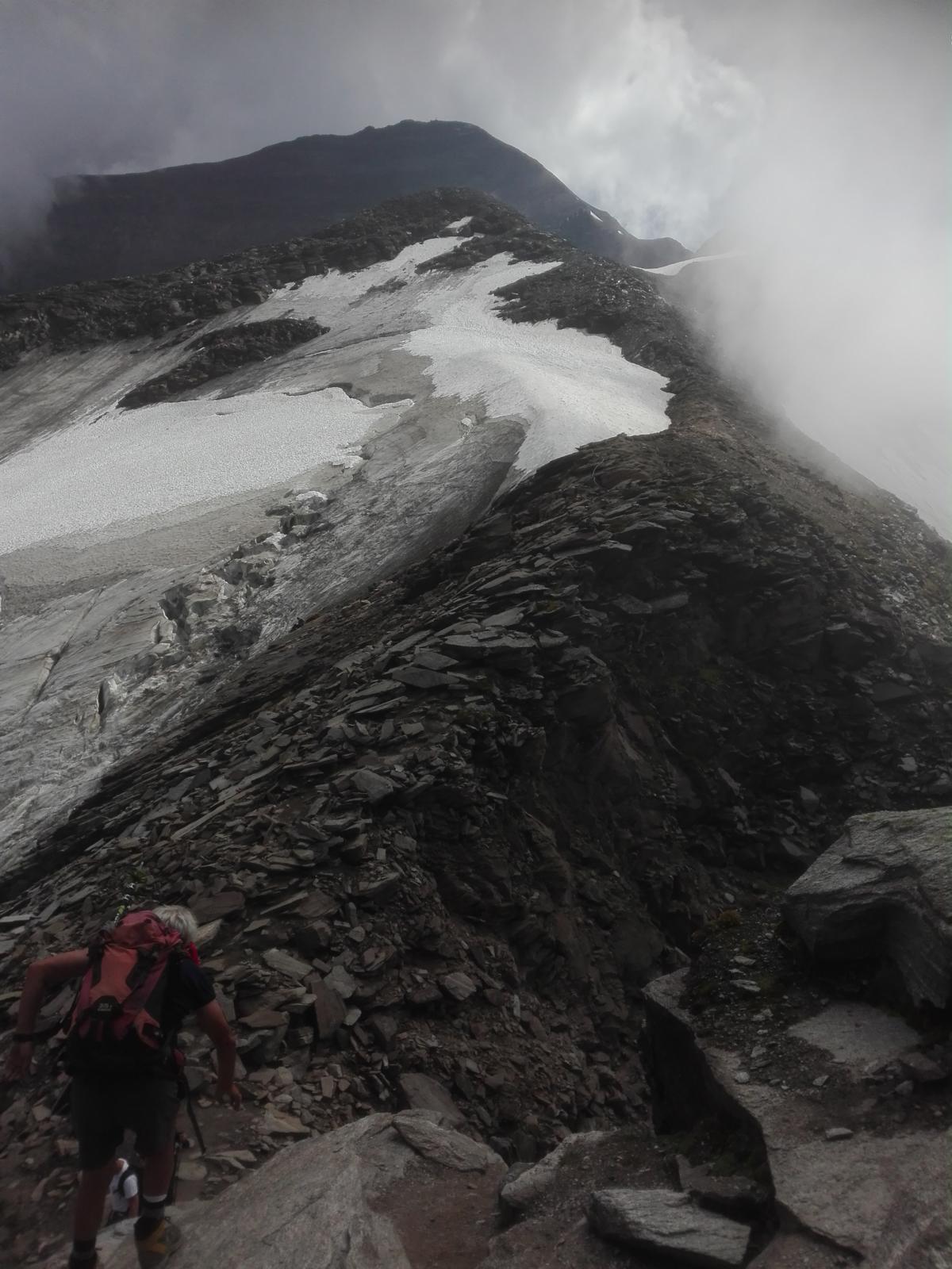 Tourenverhältnisse: Sehr gut. Vom Kesselfall-Alpenhaus mit Bussen und Schrägaufzug zur Staumauer auf 2020m. Über die beiden Staumauern rüber und auf markiertem Weg flott und ohne nennenswerte Entfernung hoch zum Heinrich-Schwaiger-Haus (2800m). Weiter auf dem markierten Weg zur schwierigsten Stelle des Aufstiegs kurz nach der Hütte: Ein kaminartiger Steilaufschwung mit Drahtseil (etwa I). Anschließend unschwierig erst zum Unteren Fochezkopf, weiter zum Oberen Fochezkopf und über den Kaindlgrat bis zum Gipfelaufbau. Schnee- bzw. Eisberührung nur noch auf fünf Meter Länge an einer flachen Stelle auf ca. 3280m am Ende des Kaindlgrates. Derzeit keine Steigeisen nötig. Der Gipfelaufbau gleicht eher einem Erd- bzw. Sandhaufen und wird erst über die Westflanke, später über den Südrücken erstiegen. Wenn man die Bilder in Führern oder Literatur von früher vor Augen hat, eine herbe Enttäuschung. Auch in der NW-Wand kein noch so kleiner Schneefleck zu sehen. Abstieg auf dem gleichen Weg.