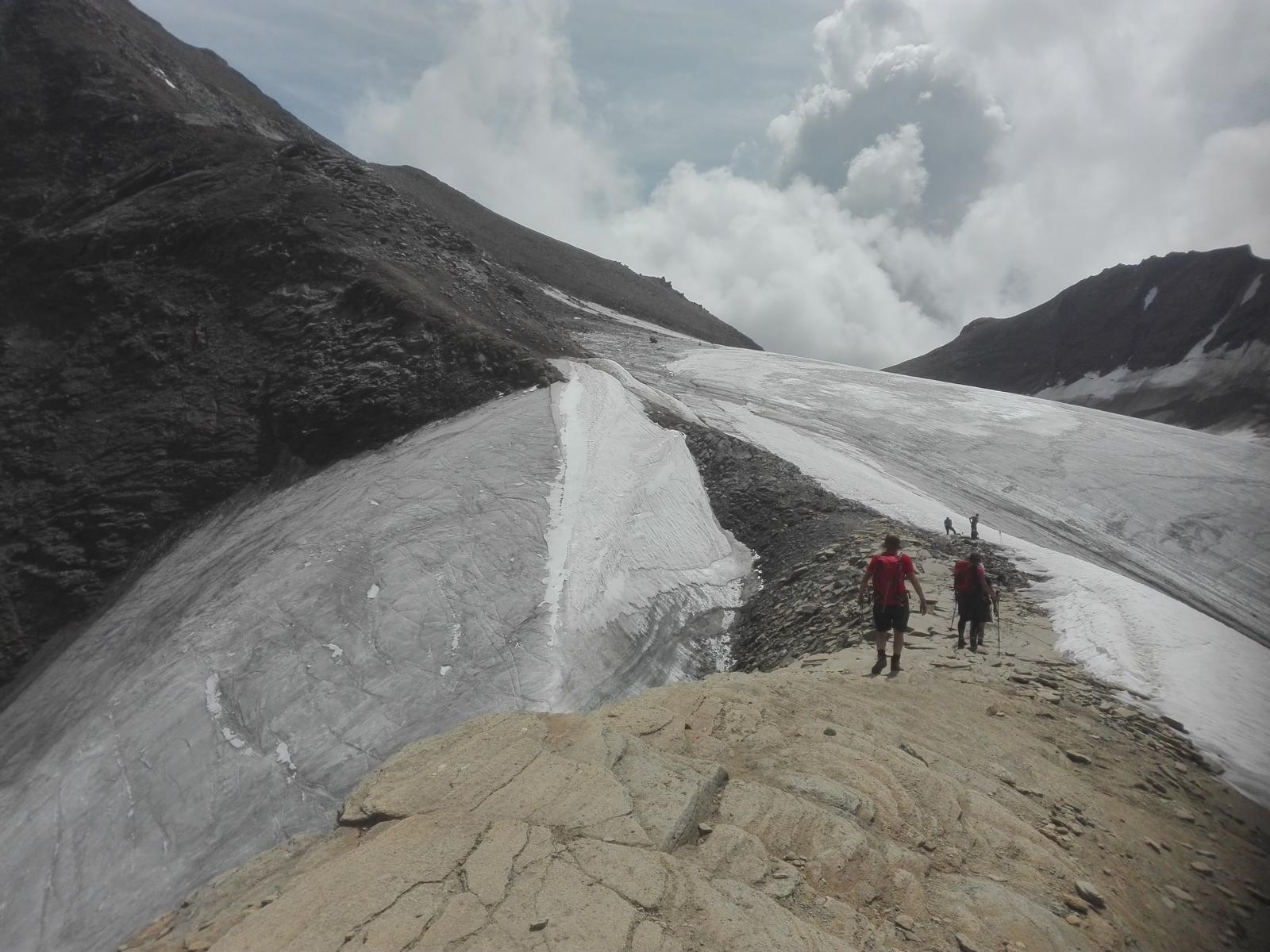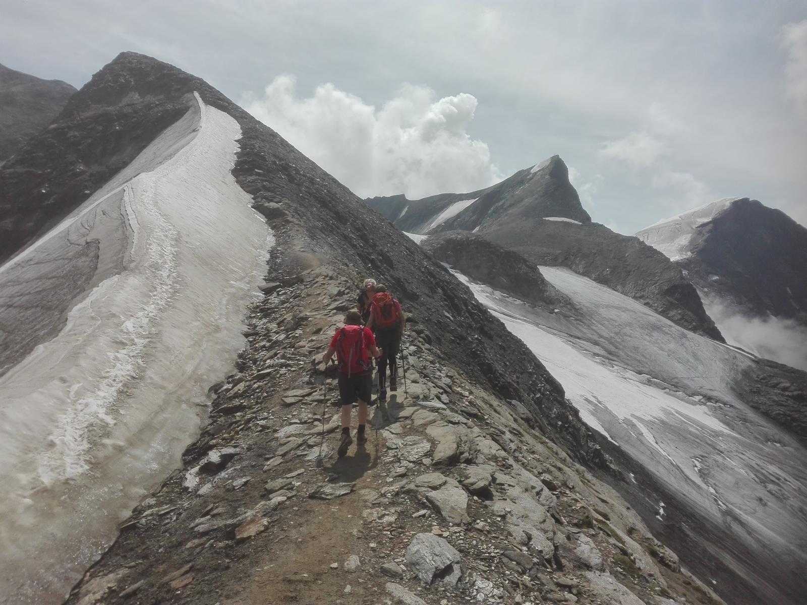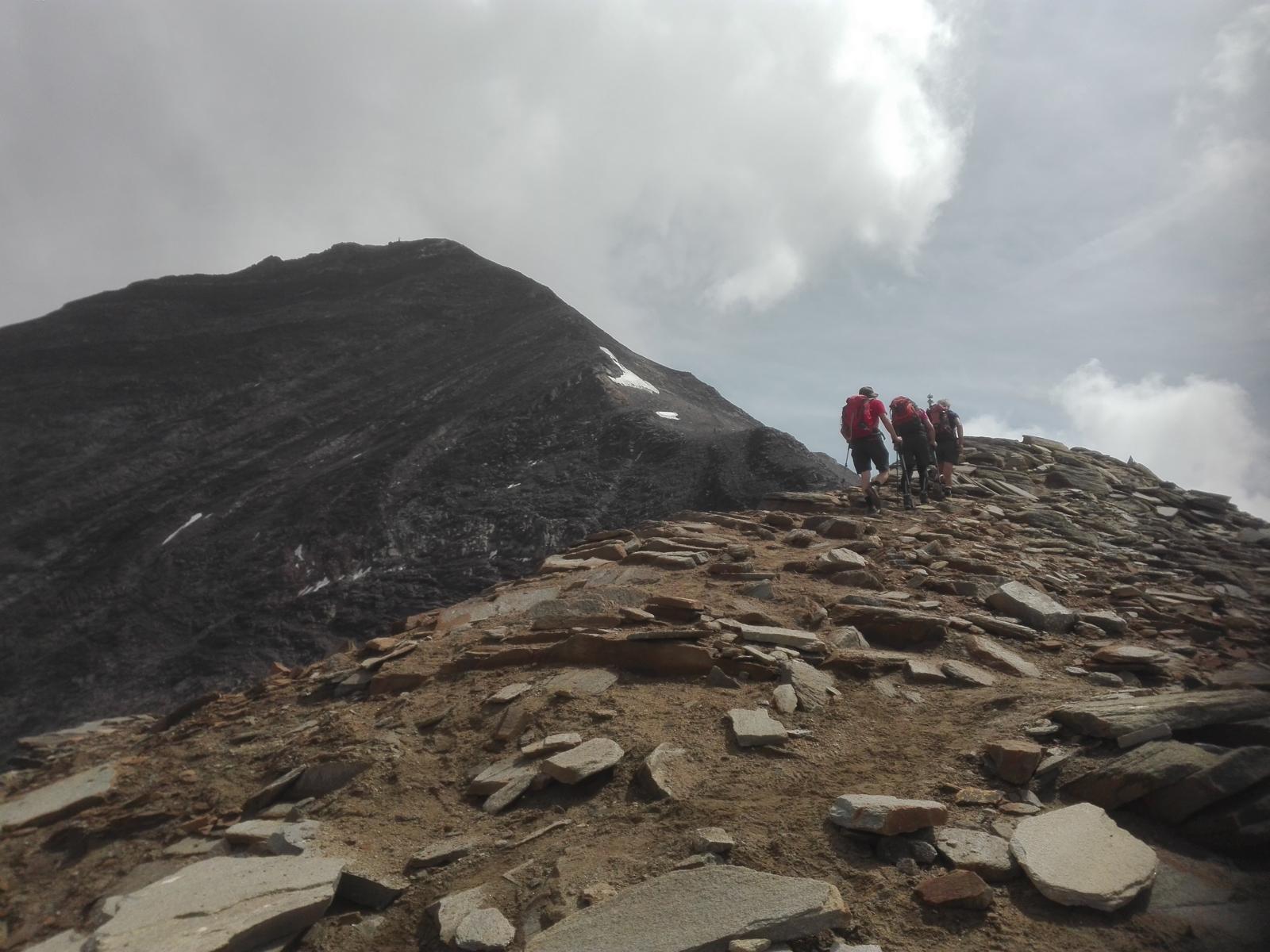 Tourenverhältnisse: Sehr gut. Vom Kesselfall-Alpenhaus mit Bussen und Schrägaufzug zur Staumauer auf 2020m. Über die beiden Staumauern rüber und auf markiertem Weg flott und ohne nennenswerte Entfernung hoch zum Heinrich-Schwaiger-Haus (2800m). Weiter auf dem markierten Weg zur schwierigsten Stelle des Aufstiegs kurz nach der Hütte: Ein kaminartiger Steilaufschwung mit Drahtseil (etwa I). Anschließend unschwierig erst zum Unteren Fochezkopf, weiter zum Oberen Fochezkopf und über den Kaindlgrat bis zum Gipfelaufbau. Schnee- bzw. Eisberührung nur noch auf fünf Meter Länge an einer flachen Stelle auf ca. 3280m am Ende des Kaindlgrates. Derzeit keine Steigeisen nötig. Der Gipfelaufbau gleicht eher einem Erd- bzw. Sandhaufen und wird erst über die Westflanke, später über den Südrücken erstiegen. Wenn man die Bilder in Führern oder Literatur von früher vor Augen hat, eine herbe Enttäuschung. Auch in der NW-Wand kein noch so kleiner Schneefleck zu sehen. Abstieg auf dem gleichen Weg.