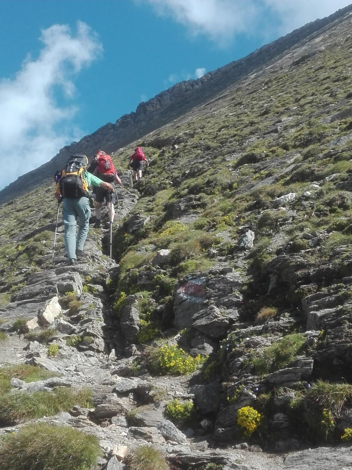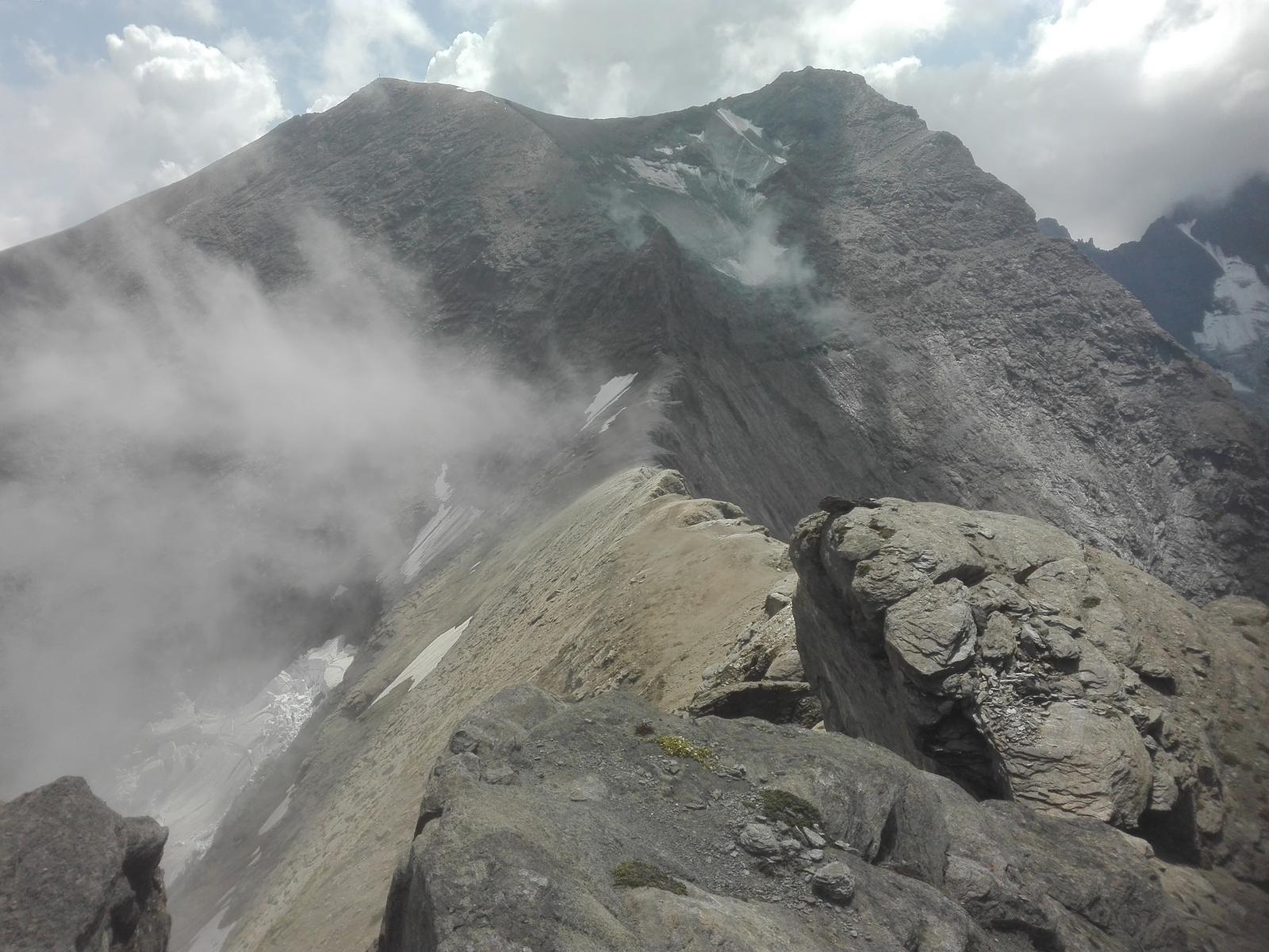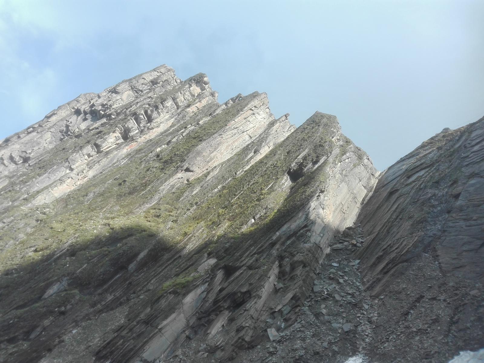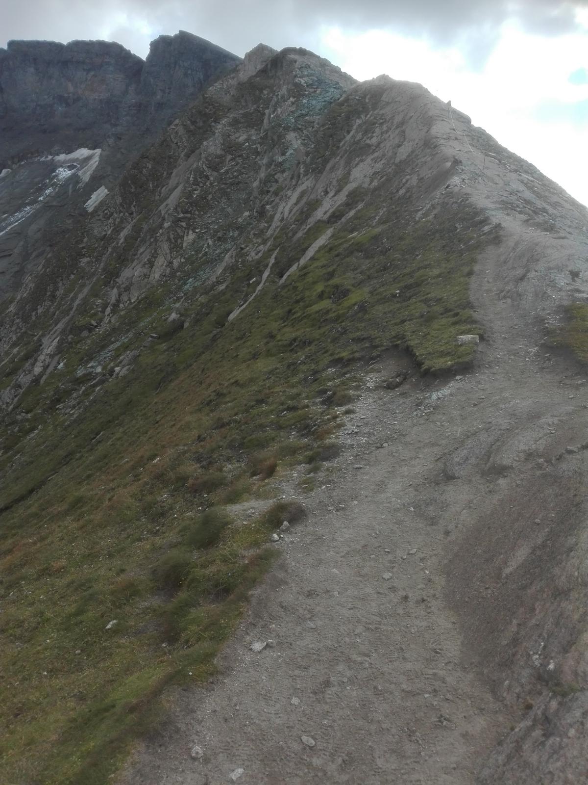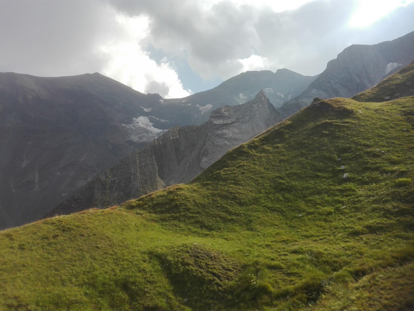 Tourenverhältnisse: Sehr gut. Zur Tour siehe auch die Beschreibung unter tourentipp.de. Wir sind allerdings vom Heinrich-Schwaiger-Haus über den "Max-Hirschl-Weg" zur Gleiwitzer Hütte. Dazu muss man (leider) erstmal fast bis zur Staumauer ca. 700Hm absteigen, um dann die weiten NW- bzw. Westflanken von Wiesbachhorn und Hohem Tenn ansteigend zu queren, bis man kurz unterhalb des Kempsenkopf auf etwa 3050m auf den Gleiwitzer Höhenweg trifft. Von hier sollte man für den Abstecher zum Hohen Tenn hin und zurück 3-4 Stunden einrechnen. Der Weg ist unschwierig mit einer kurzen Klettersteigpassage inclusive einer kurzen überhängenden Stelle (vgl. Bild, im Bild der oberste Teil des KS). In der Gipfelflanke schuttig bzw. erdig/sandig, am Gipfelgrat zwei kurze Kletterstellen (I). Schöner als die Querung durch die Gipfelflanke ist es, den kleinen Umweg über den Schneespitz zu nehmen. Auf dieser steht auch ein großes Kreuz mit Buch. Rückweg auf dem gleichen Weg. Am Verzweigungspunkt unterhalb des Kempsenkopf geht es dann den Gratrücken, teilweise mit Seilsicherungen, runter in die Obere Jägerscharte und weiter durch steile Grashänge auf schmalem Pfad mit vielen Seilsicherungen zur Unteren Jägerscharte. Vorsicht bei Nässe! Bei uns hat es hier nur ein wenig getröpfelt; das hat aber gereicht, um den Untergrund gleich etwas rutschig werden zu lassen. Die vielen Stahlseile sind insofern kein Luxus. Von der Unteren Jägerscharte geht es dann nochmal etwa 20Hm auf Eisenklammern eine Verschneidung runter, es folgt ein flaches auch jetzt noch existierendes Schneefeld (derzeit die einzige Schneeberührung auf der Tour), danach ein Pfad durch schön begrüntes Gelände zur Gleiwitzer Hütte.