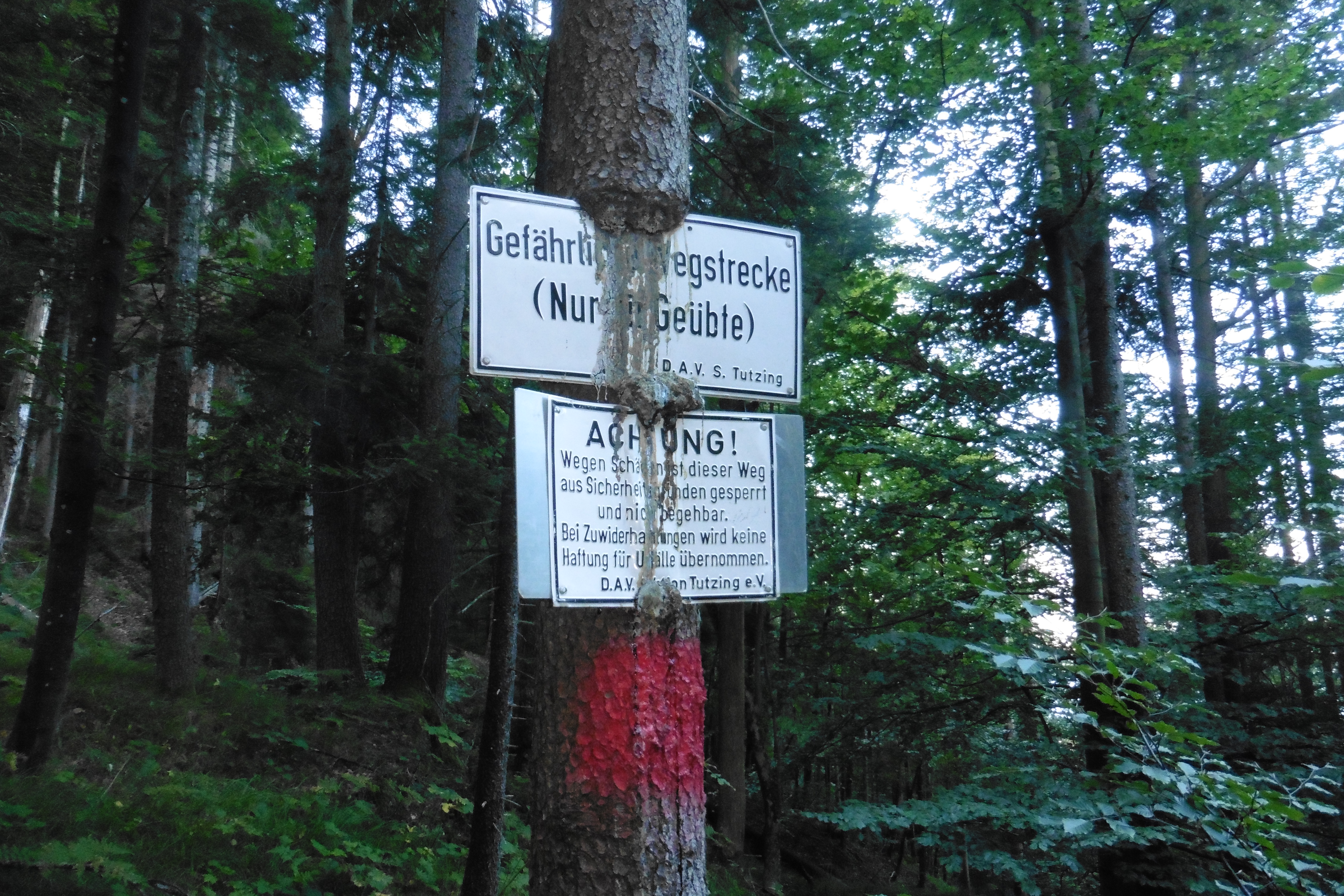 Gefahreneinschätzung: es gibt kein Hinweisschild und keine Markierung zum Graseck, daher ist im unteren Teil etwas Orientierungsgabe gefragt ( AV-Karte BY 11); hat man erst einmal die Tafel mit dem Warnhinweis gefunden gibt es keine Wegfindungsprobleme mehr; die Warnung ist einfach nicht zeitgemäß, - der Pfad ist gut erkenn- und begehbar; Trittsicherheit und Schwindelfreiheit sind allerdings notwendig;