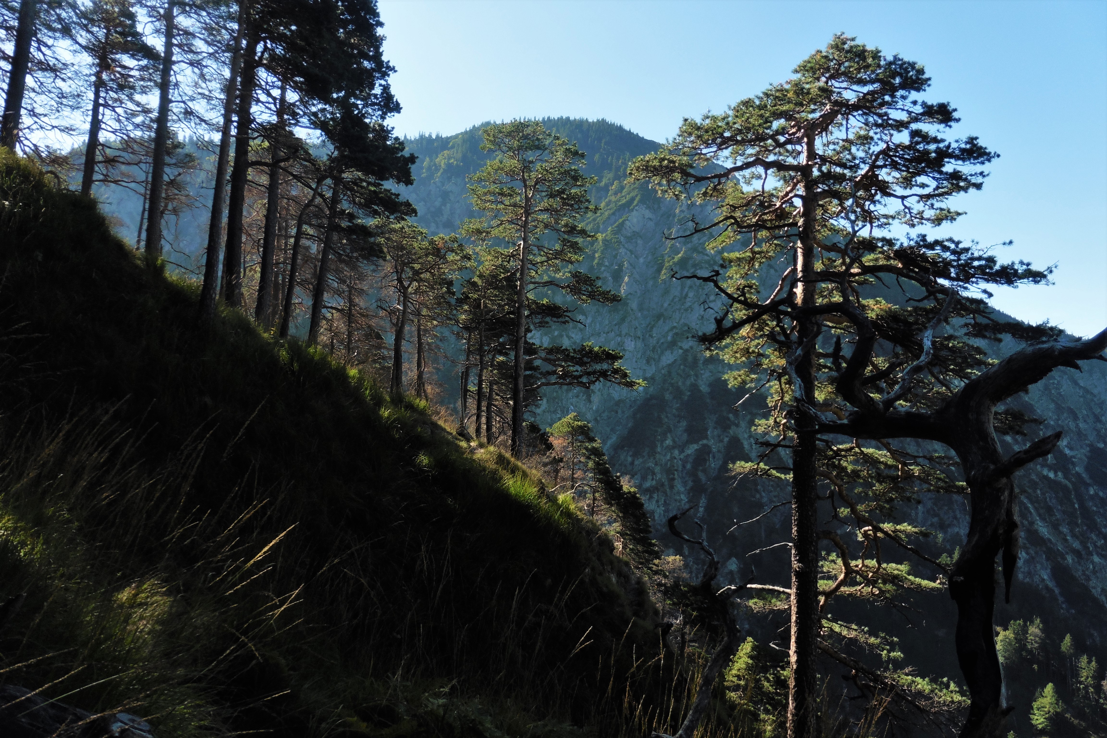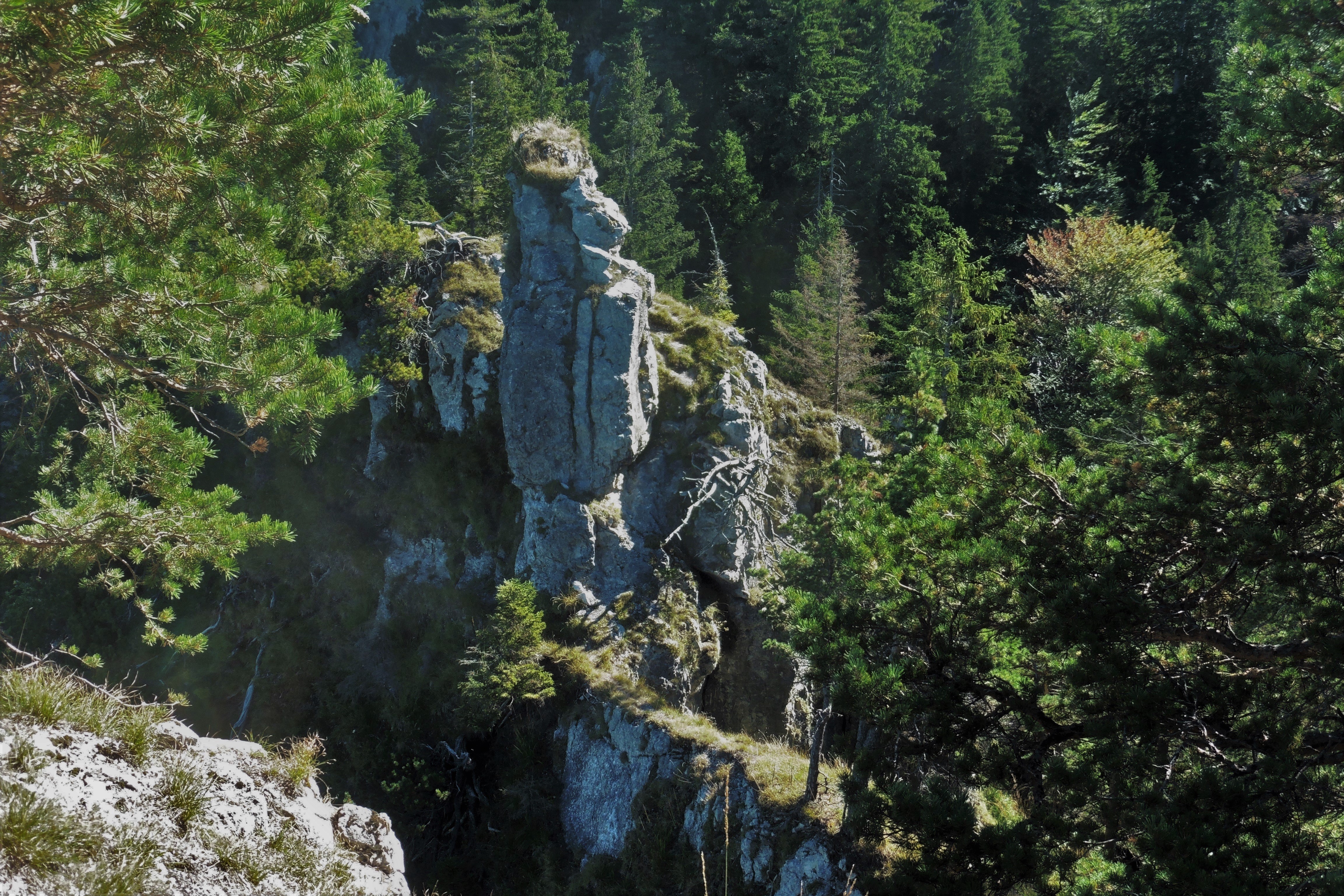 Bild 7: Rückblick - links der Gratturm, rechts - zwischen den Bäumen - das Gipfelkreuz am Graseck;