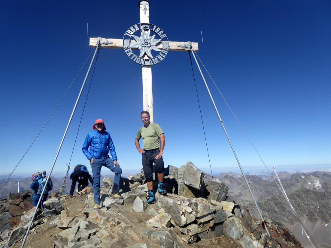 Tourenverhältnisse: Vom kostenfreien Parkplatz imTalschluss am ersten Tag Auffahrt mit dem Mountainbike (ohne E-Motor, 560 Höhenmeter) zur Amberger Hütte (2135 m). Am zweiten Tag Aufstieg zum Schrankogel über den Westgrat (im obersten Teil kurze Stellen II bis III, meist einfacher), alles schneefrei. Eigentlich wollten wir doe Überschreitung machen (Ostgrat rauf, Westgrat runter), aber davon hat der Hüttenwirt dringend abgeraten: Am Ostgrat habe es vor ca. einem Jahr einen Felsturz gegeben, die Markierungen seien zerstört, die Route schwer auffindbar. Der Ostgrat wurde heute trotzdem gemacht, die Einschätzungen (wir haben nachgefragt) waren unterschiedlich. Insider kennen den Weg, andere fanden es kompliziert - machbar ist die Überschreitung aber offenbar schon bei guter alpiner Erfahrung.
