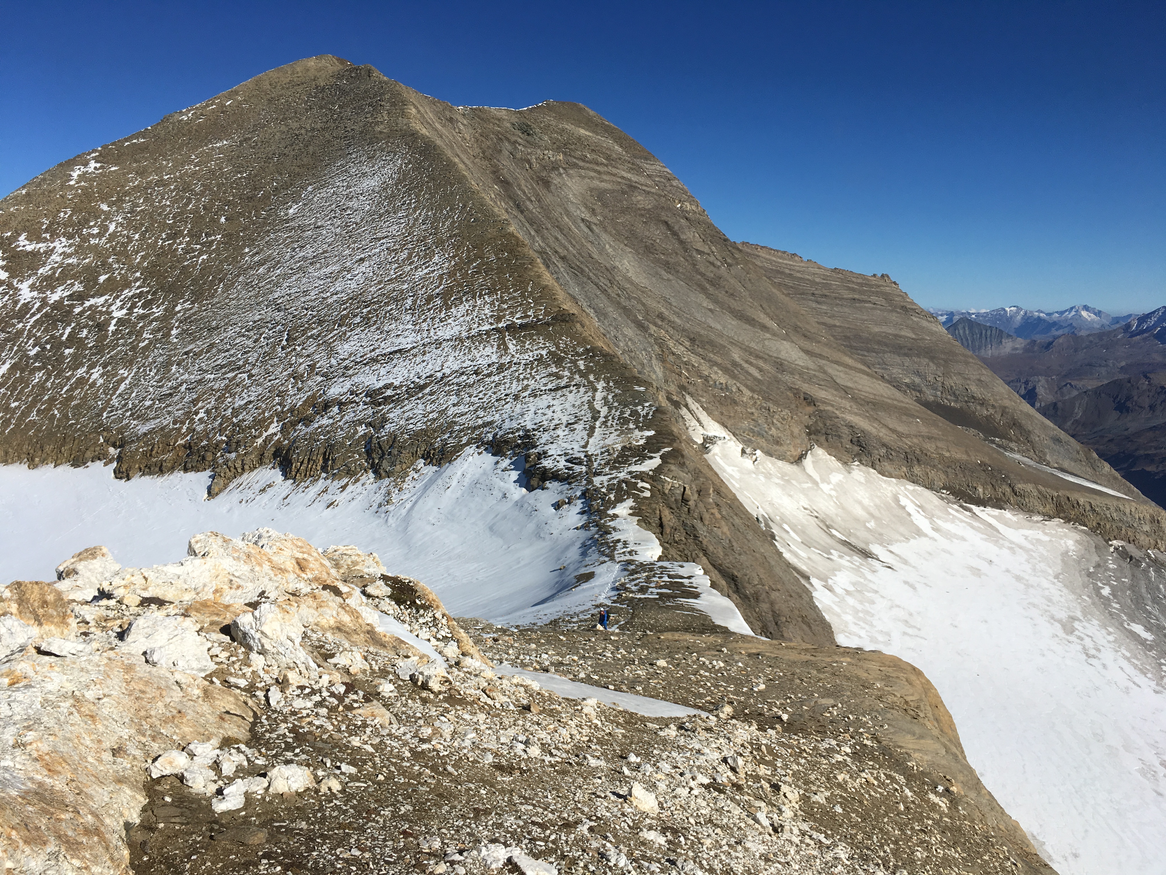 Tourenverhältnisse: bis Hohe Dock schneefrei, Übergang zum Großen Bärenkopf und Abstieg in die Kreilscharte auch überwiegend schneefrei, Gletscherübergang zum Gamsgrubenweg Gletscher teilweise schneebedeckt, teilweise aper