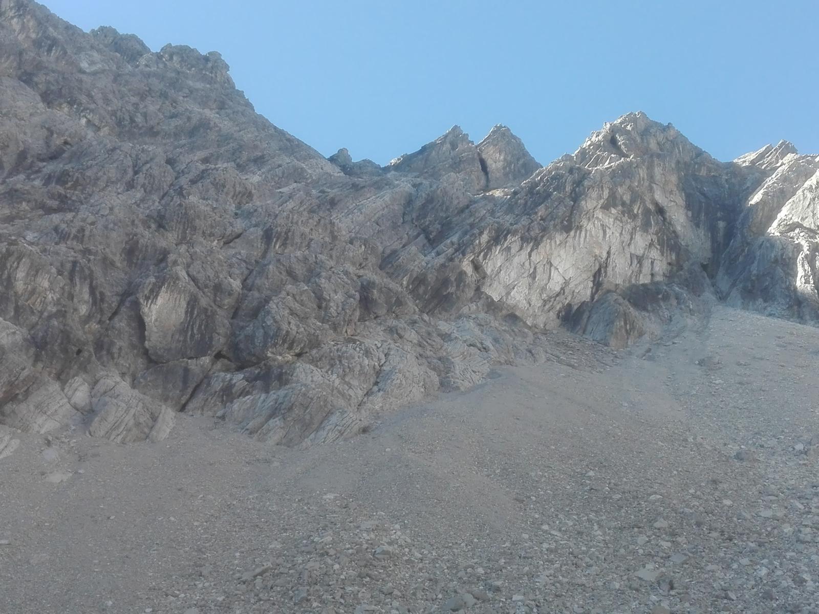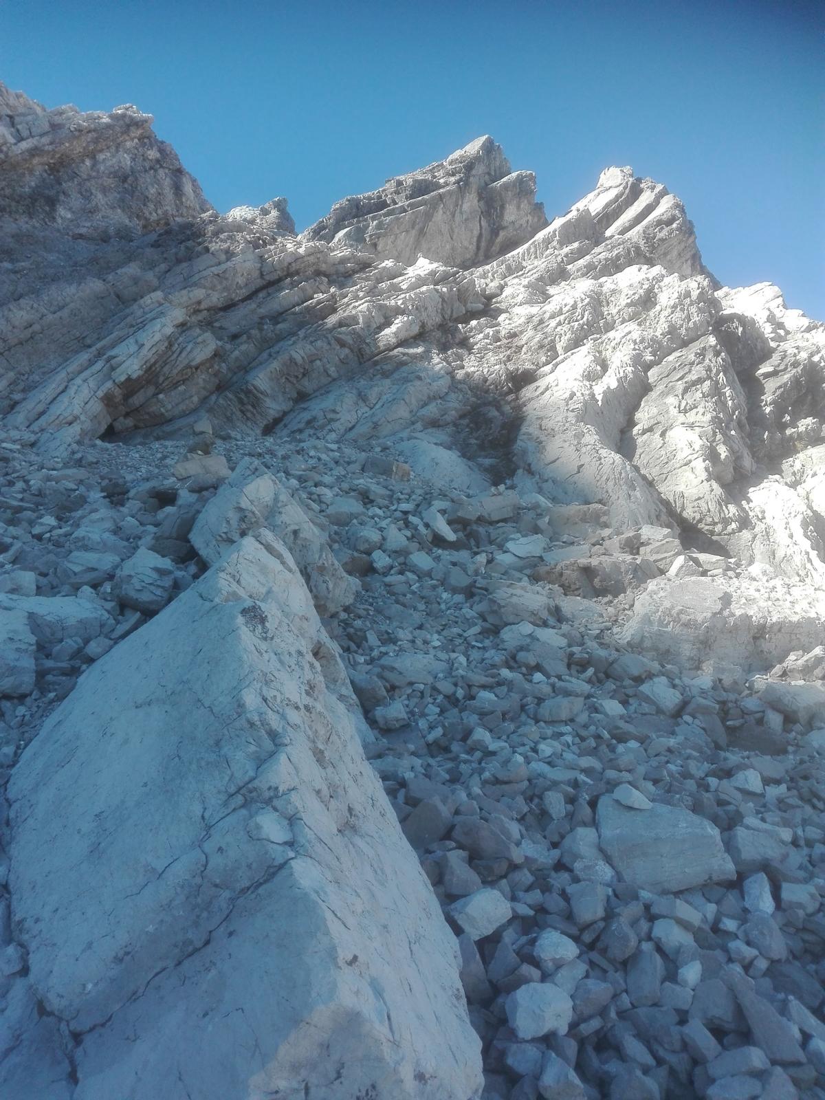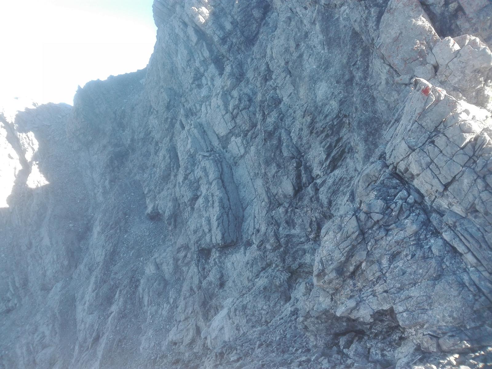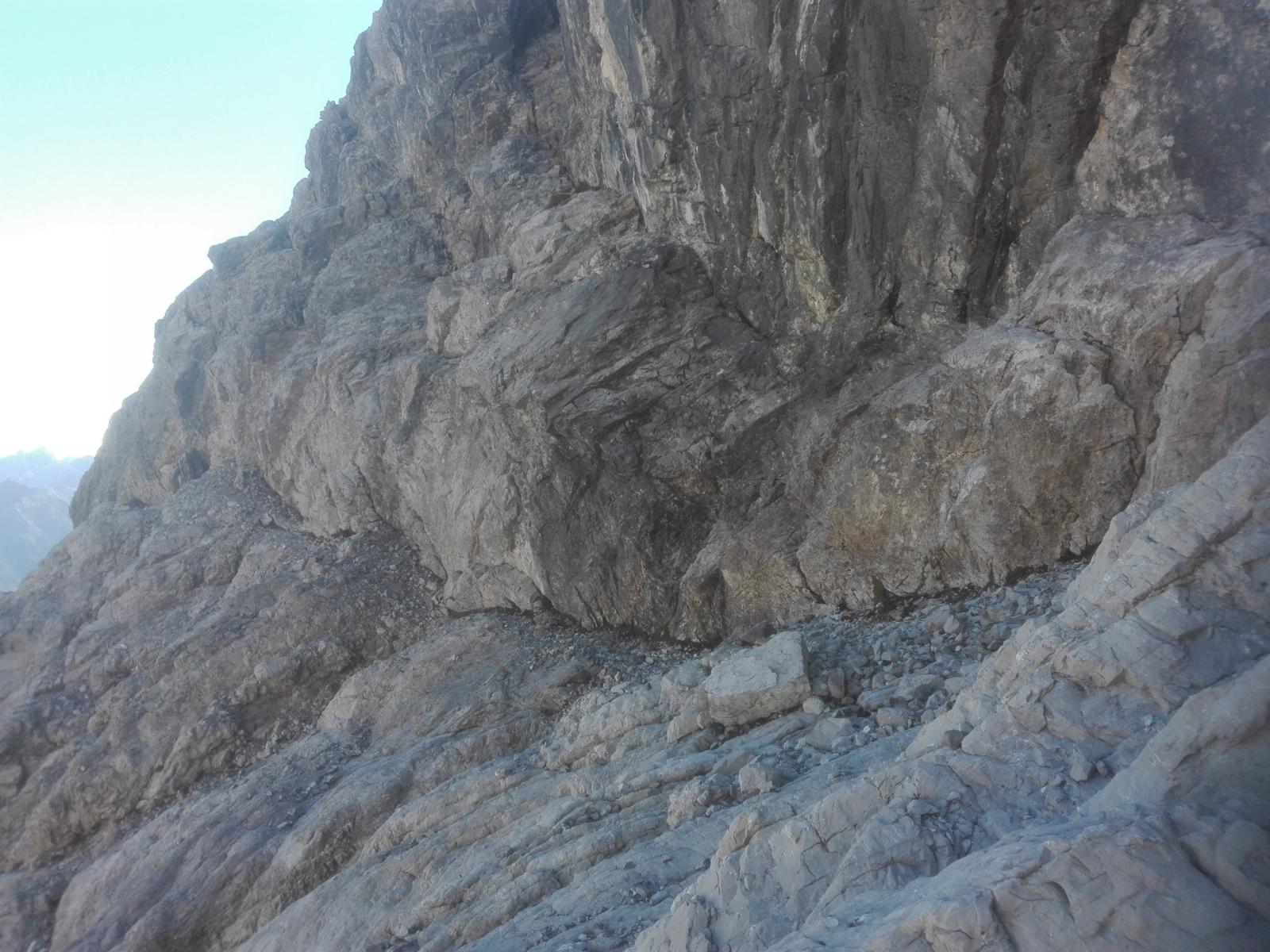 Grob gesagt geht es zuerst auf einem Schuttband ein Stück nach links, durch eine kurze steile Rinne (eine Stelle II+) hoch, erneut einige Meter nach links und wieder durch eine Rinne hoch. Nun geht es mehr oder weniger schräg nach rechts oben mit Zielpunkt knapp links des auffälligen Doppelzacken im Nordostgrat des Gipfels. Teilweise geht es durch Geröll, erfreulich oft aber in festem Fels der Schwierigkeit I-II. Auch finden sich einige Steinmänner und erstaunlicherweise auch ein paar rote Punkte (!). Unterhalb des Doppelzackens in einem Geröllfeld kann man entweder nach links durch Schrofen queren, um dann wieder nach rechts rauf zum Grat zu steigen (vgl. Beschreibung unter gipfelsuechtig.de) oder aber wie ich die Rinne am oberen Ende des Geröllfeldes zum NO-Grat weiter steigen, was vermutlich zwar etwas schwieriger (II) ist als die erstgenannte Variante, aber schöner, da Kletterei in festem Fels. Anschließend den NO-Grat weiter und etwa 20m unter dem Gipfel auf einem Schuttband einige Meter in die oberste Nordwand runter und gegenüber gleich wieder auf einen Absatz im Westgrat des Gipfels rauf. Von diesem Absatz einige Meter in die Westflanke und durch eine steile Rinne (II) zum nahen Gipfel hoch. Statt dieser Umrundung kann man auch den NO-Grat direkt zum Gipfel hoch steigen. Das schaut aber (deutlich) schwerer aus (soll aber auch nur II+ sein, dürfte schöner als die Umrundung sein und sich insbesondere bei Schnee in der Nordwand anbieten).