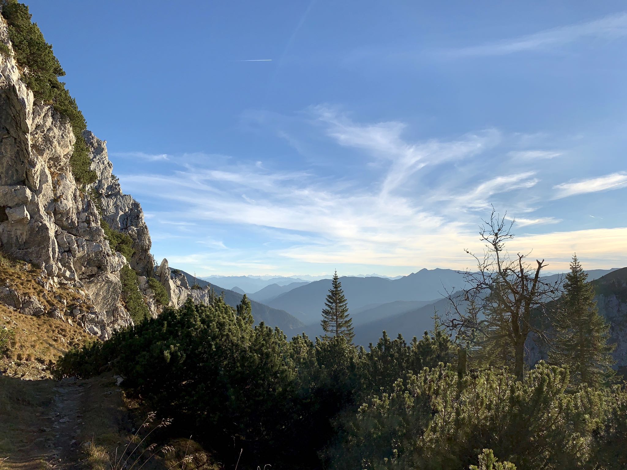 Sonstiges: Vom PP (1117m) bei der Jugendherberge am Sudelfeld auf dem 660a zu Fuß auf dem Fahrweg Richtung „Wendelstein/Wildalpjoch“ hinauf. An den letzten Häusern links durch ein Gatter auf den Karrenweg in nämlicher Richtung. Nach einigen Kehren wird die Larcheralm (1225m) passiert und dahinter geht es Richtung NW über einen Wiesenbuckel hinweg und bald verliert sich der Weg in einer Senke zu einer Trittspur. Beim Mitterberg überwindet der Pfad dann einen schmalen Waldgürtel. Danach weglos rechts auf das Teersträßchen zu. Bei der Materialseilbahn das Sträßchen links steil hinauf. In der zweiten Kehre bei der oberen Lacheralm auf dem Abschneider zügig nach oben. Die Jacke ist schon längst im Rucksack verschwunden. 80Hm später hat einen das Sträßchen wieder. Richtung NO geht es auf ihr bis zum Fuß des Lacherkars. Dort rechts auf den Steig Richtung „Wildalpjoch/Wendelstein über Soinalmen“. Zügig geht es jetzt in der Sonne hinauf in die Scharte (1625m) zwischen Seewandköpfl und Wildalpjoch hinauf. Dahinter verliert der Steig ein wenig an Höhe ehe es Richtung W flach zur Soinhütte (1600m) hinüber geht. Von dort wendet sich der Weg unter der Kesselwand bald Richtung S und in wenigen Minuten ist die Bergstation des Lacherlifts erreicht. Dahinter führt der Pfad etwas versteckt durch Latschen auf den NO-Grat des Lacherspitz (1724m). In wenigen Schritten ist der kleine Gipfelaufbau erreicht und erklommen.Runter entlang des NO-Grats bis auf den Rücken, der Richtung O zum Wildalpjoch hinüber führt. Auf diesem anfangs flach entlang, bald etwas steiler über eine seilversicherte Platte hinab und zuletzt wieder flach hinüber zur vom Aufstieg bekannten Scharte. Von hier wie im Aufstieg zurück zum Ausgangspunkt.