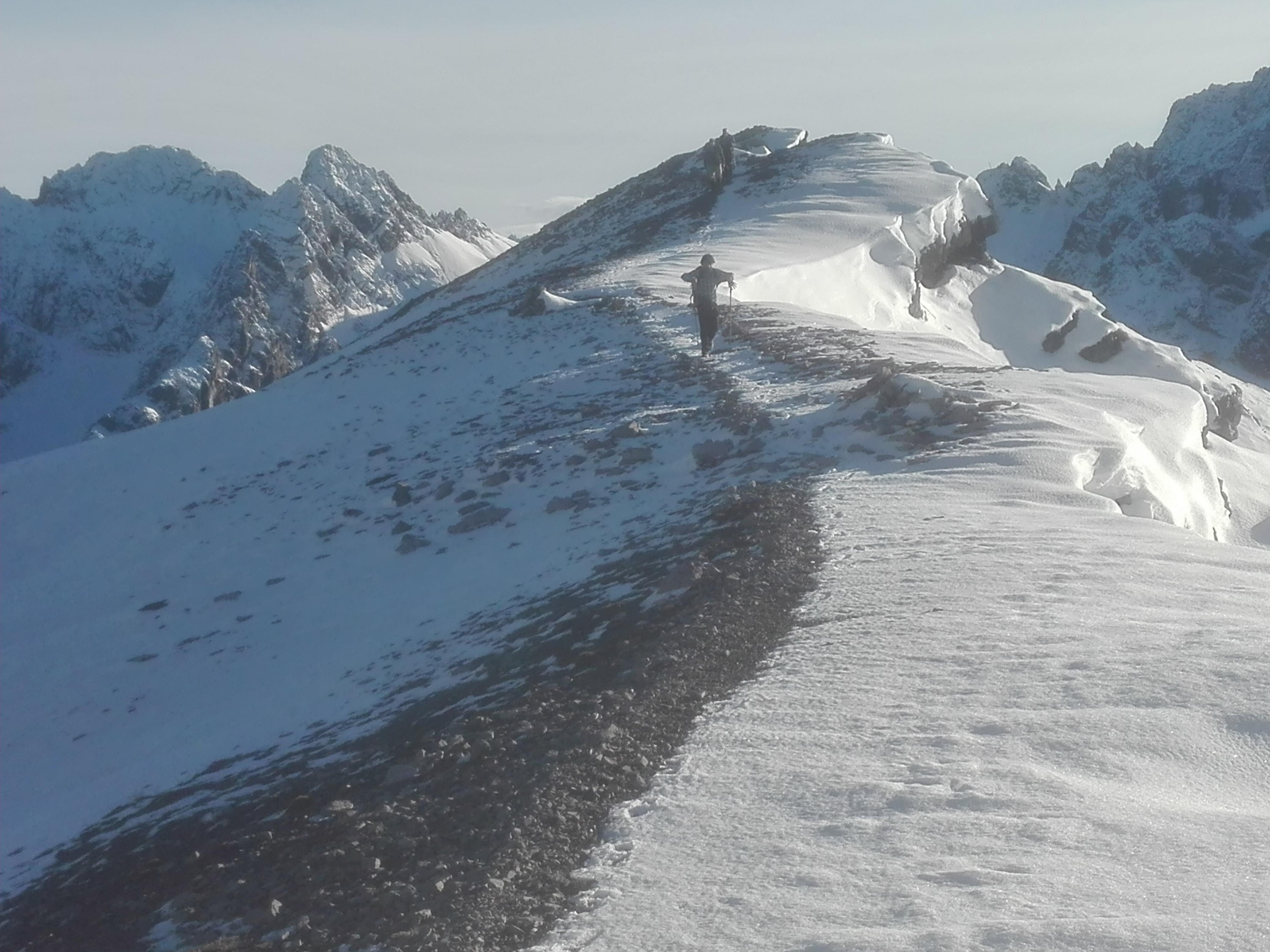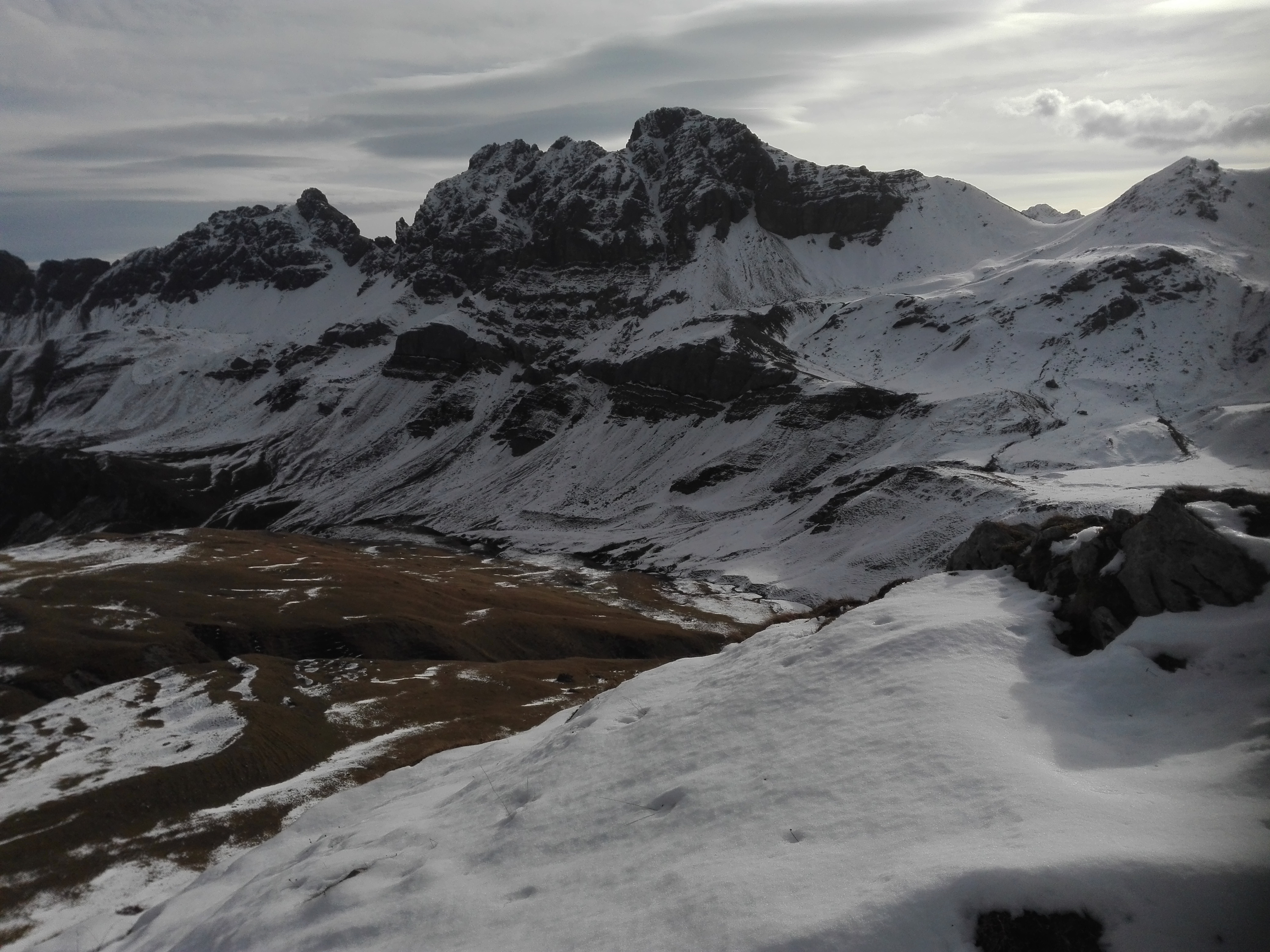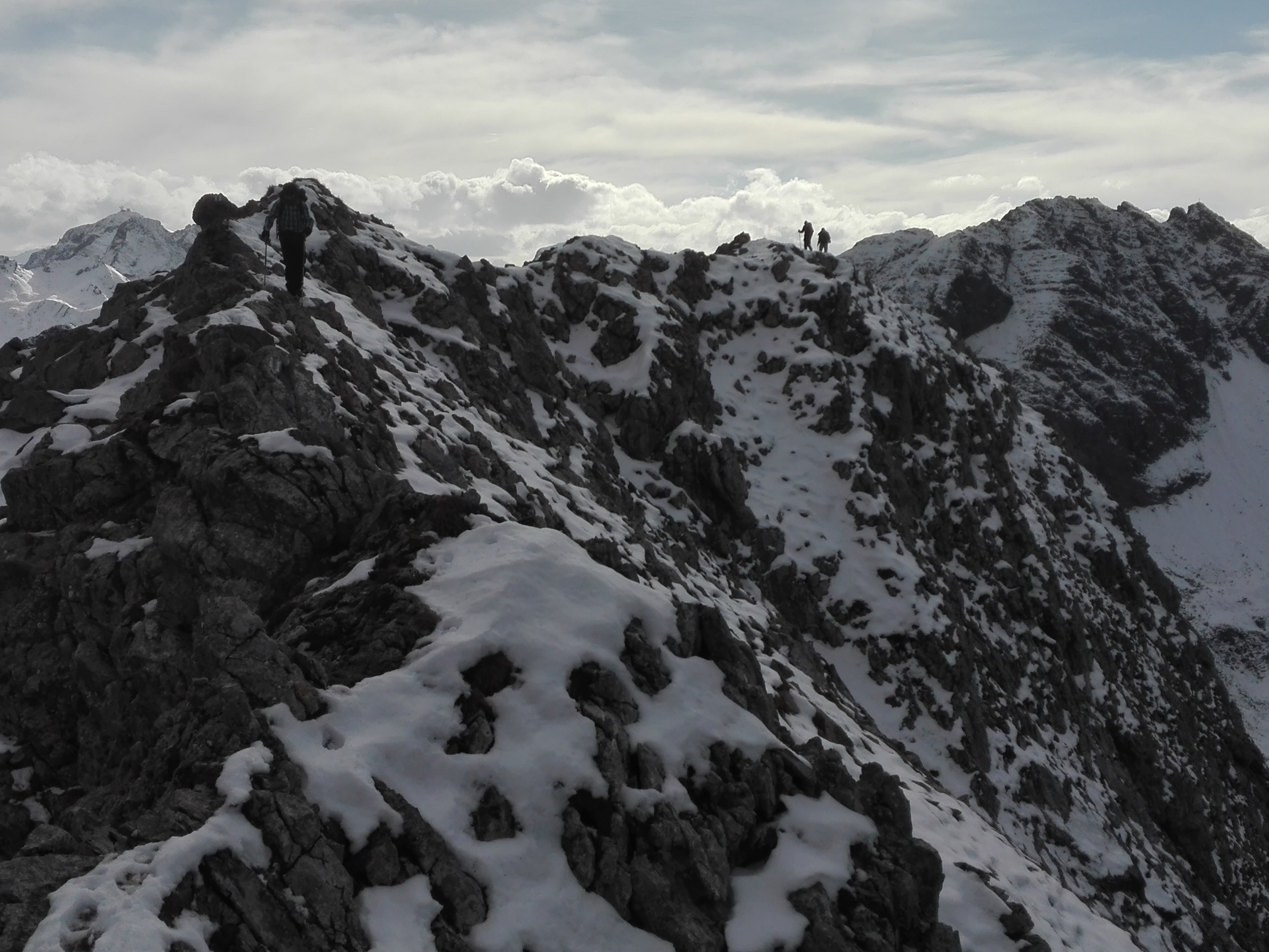 Nordseitig lag Schnee bis ca. 2100m, südseitig waren die Gipfel bis über 2500m völlig schneefrei, ostseitig ab etwa 2200m Schnee. Nirgends besonders viel, maximal etwa 10cm tief. Nicht störend, einzig am Gipfelgrat der Wösterspitzen erforderte der Schnee erhöhte Aufmerksamkeit.