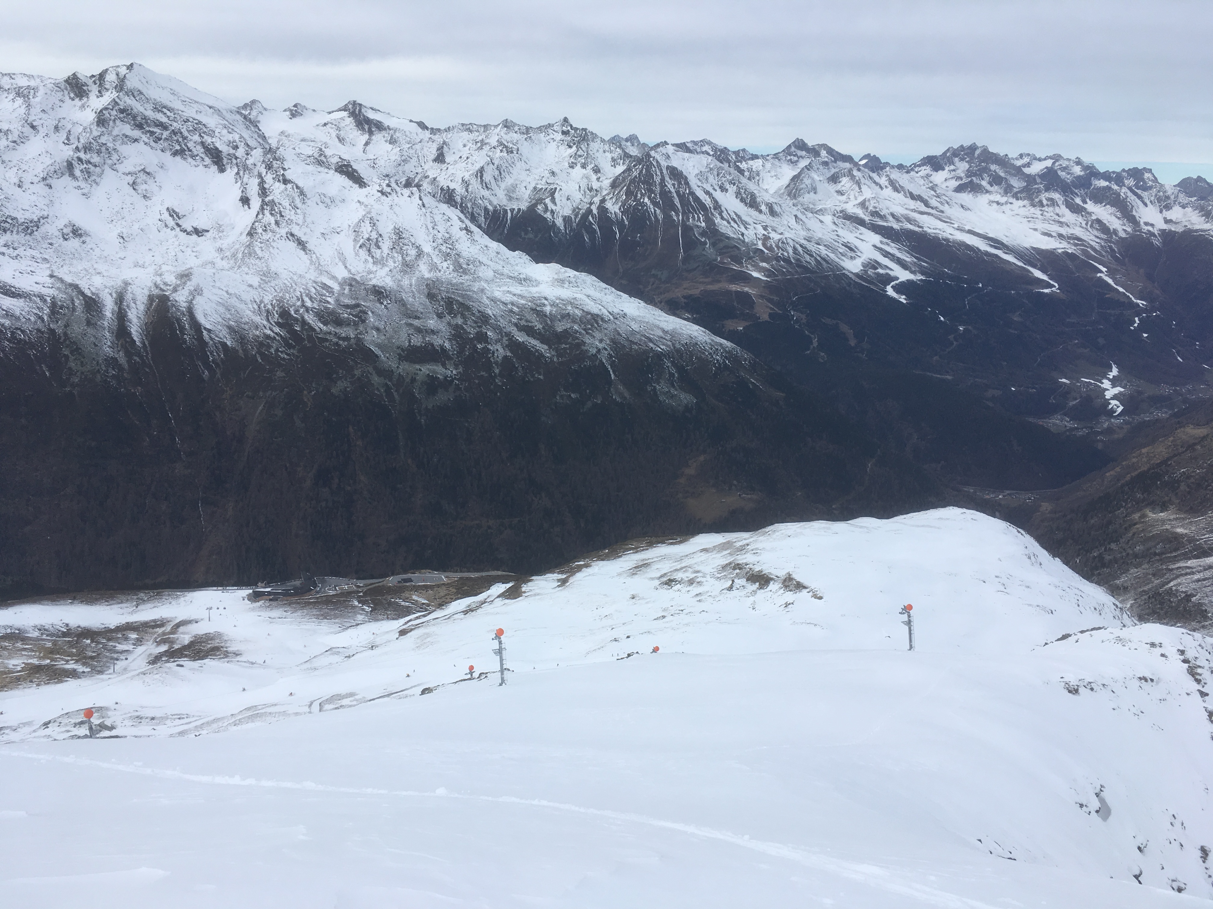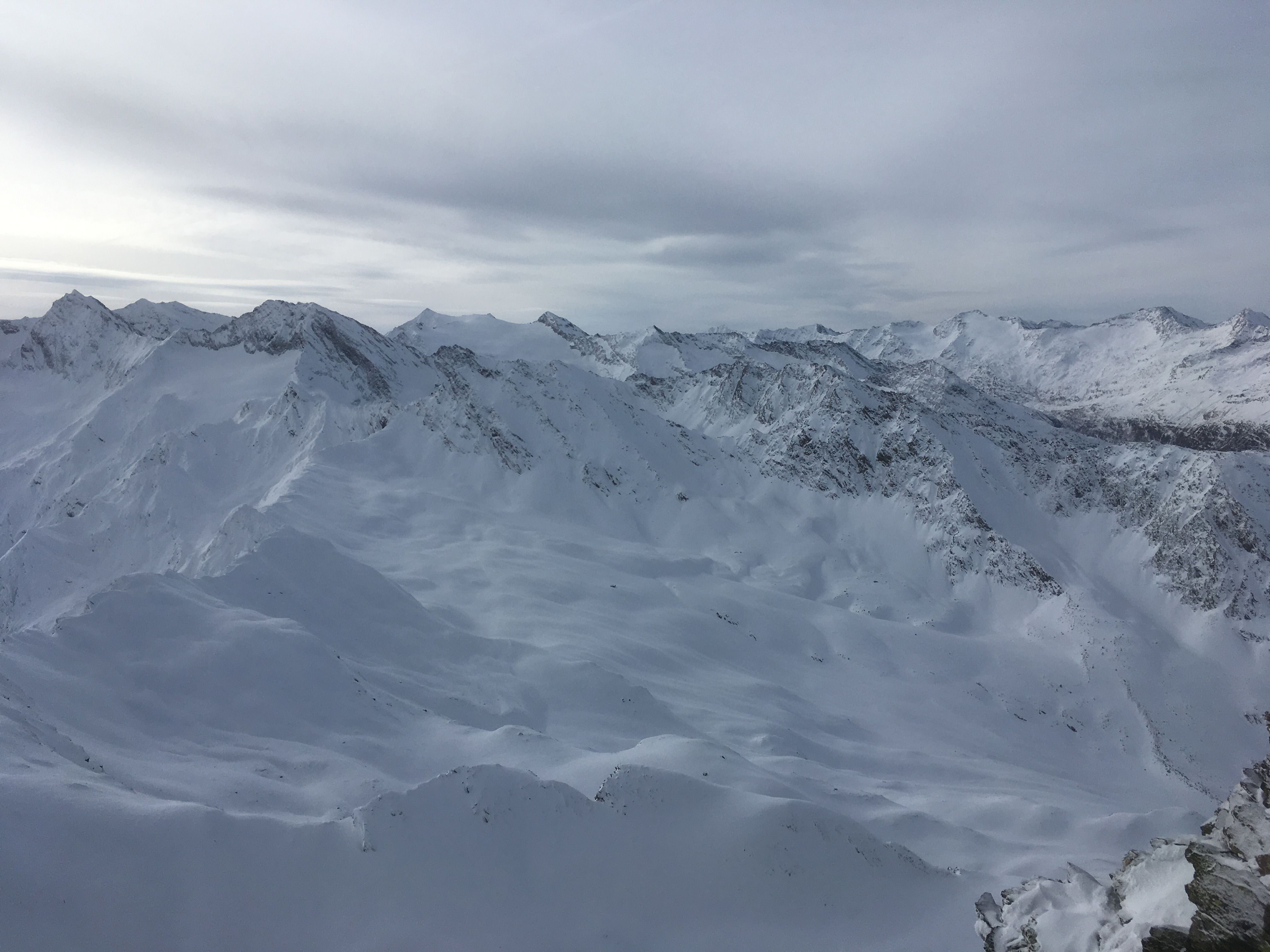 Sonstiges: Gestern ging es Richtung Hauptkamm, wo es in diesem bisher schneearmen Winter noch am meisten geschneit hat. Das gesamte Ötztal hinter ist es bis sehr weit hinauf aper (in den Nördlichen Kalkalpen sowieso), doch beim Blick auf die Gurgler Berge dann ein erster positiver Eindruck: Hier schaut es nach Winter aus - wohl eine Folge der über den Hauptkamm hinüberschwappenden Niederschläge aus Italien, die dort teilweise für ordentlich Schnee gesorgt haben (und weiter unten für Hochwasser). Los ging es über die Pisten, hier ist dank der auf Hochtouren laufenden Beschneiung zwar kein Feindkontakt zu fürchten, aber eben entsprechende Beeinträchtigungen (Lärm und kalter Eishauch). Ab ca. 2.500 m wird es aber auch im freien Gelände winterlich. Der letzte Steilhang zur Bergstation wird am besten links in langer Schlaufe auf der blauen Piste umgangen. Von der Bergstation beim UFO-förmigen "Top Mountain Star" geht es die letzten gut 50 Hm entweder mit Skiern oder zu Fuß hoch zum Gipfel (evtl. Leichtsteigeisen, da die Versicherungen abgebaut sind; gestern haben das aber alle außer mir ohne solche gemacht). Abfahren kann man auch fast direkt vom Gipfel.