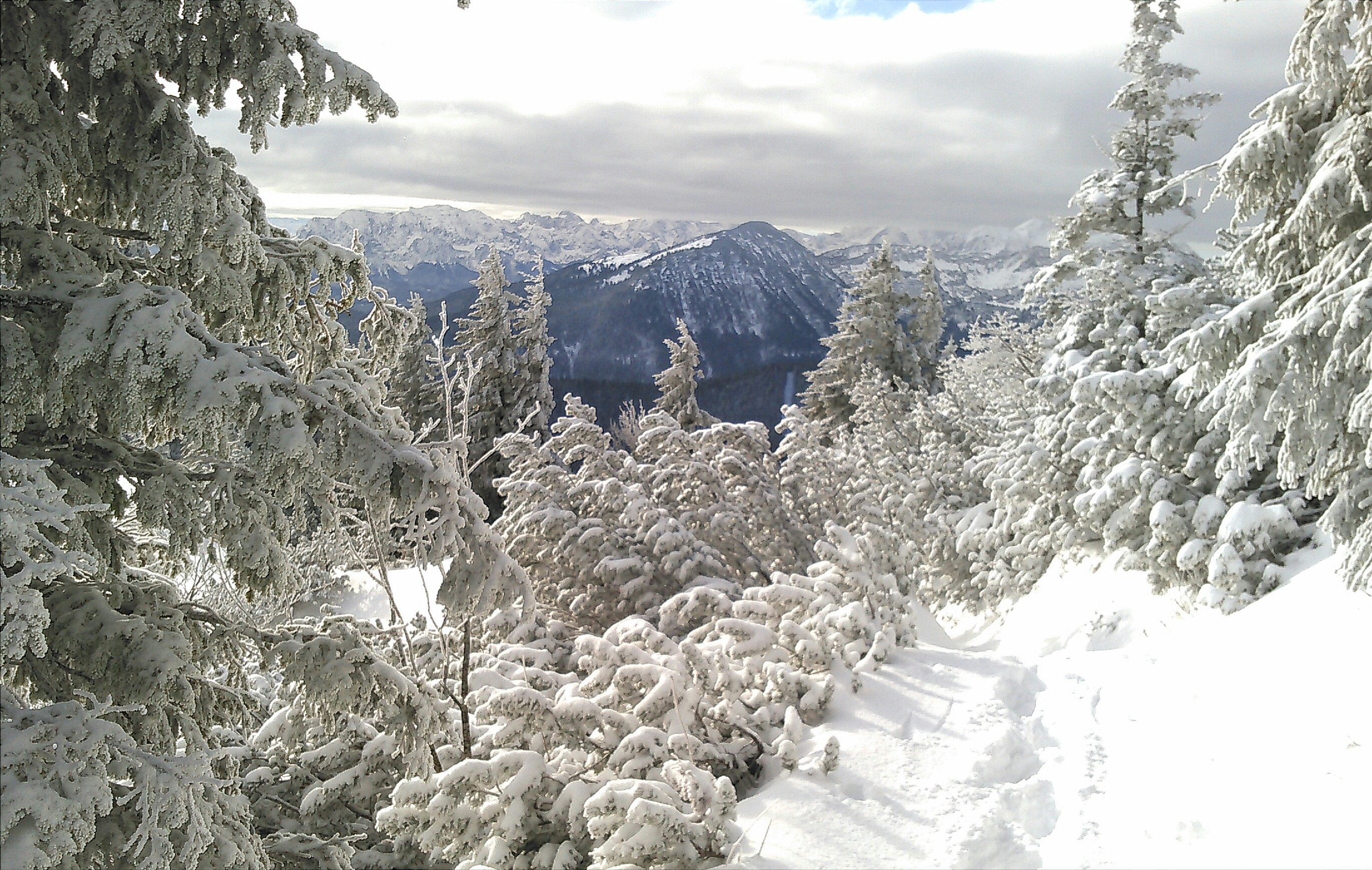 Tourenverhältnisse: Im Aufstieg waren ca. 1/2 Stunde die Ski zu tragen, in der Abfahrt mindestens ebenso lang (nicht mehr ohne sehr viele Steine fahrbar spästetens ab der Stelle, wo der Fahrweg länger geradeaus abwärts führt). Nur im Hang unter den Herzogstandhäusern auf ein paar Metern schön zu schwingen. Schneequalität sehr gut (pulvrig) aber für vernünftige Skitouren im Gelände in dieser Höhenlage und Gegend bei weitem noch nicht ausreichend und zude sehr stark sturmverblasen.