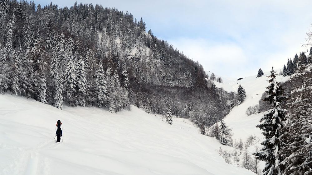 Gefahreneinschätzung: Gering - nur im sehr steilen Wiesengelände Gleitschneerutsche
