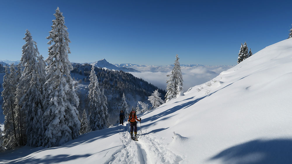 Tourenverhältnisse: Erstaunlich gut für diese Jahreszeit. Im unteren Bereich ist noch nicht so viel Schnee, aber da geht es wunderbar über die Forststraße. Im Almgelände dann teilweise feiner Pulver, dann aber auch etwas abgeblasen, so dass man schon aufpassen muss, wo man reinfährt. Vom Gipfel weg bis zum Sattel findet man auch auf dem Sonnenhang noch feinen Pulver in ausreichender Form.