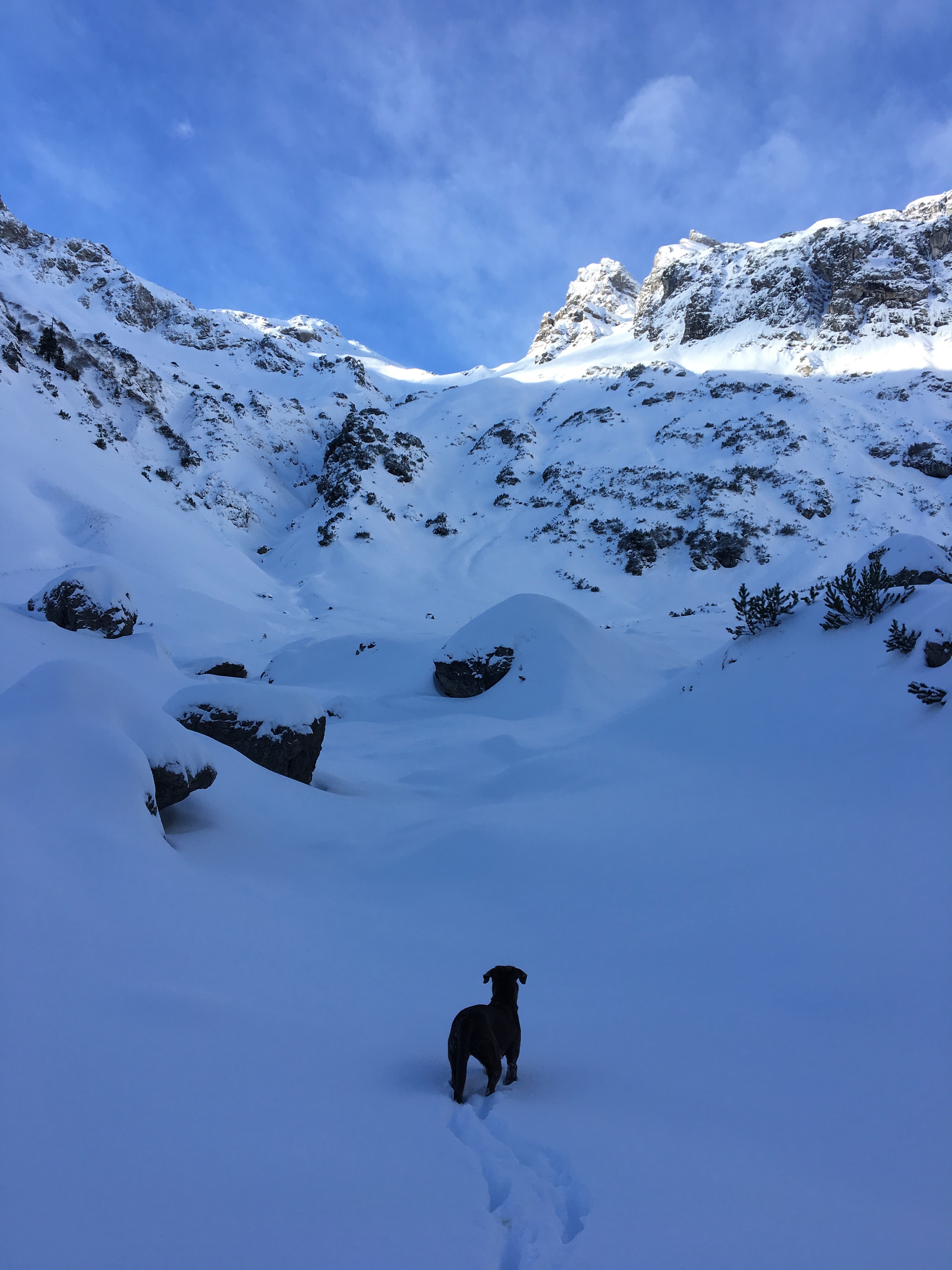 Sonstiges: Schöne Tour mit Blick auf Hochvogel und Muttekopf, im oberen Hang Pulver, unten etwas schwerer zu fahrender Pulver, Talhatsch durch Bachbett, meistens schneebedeckt