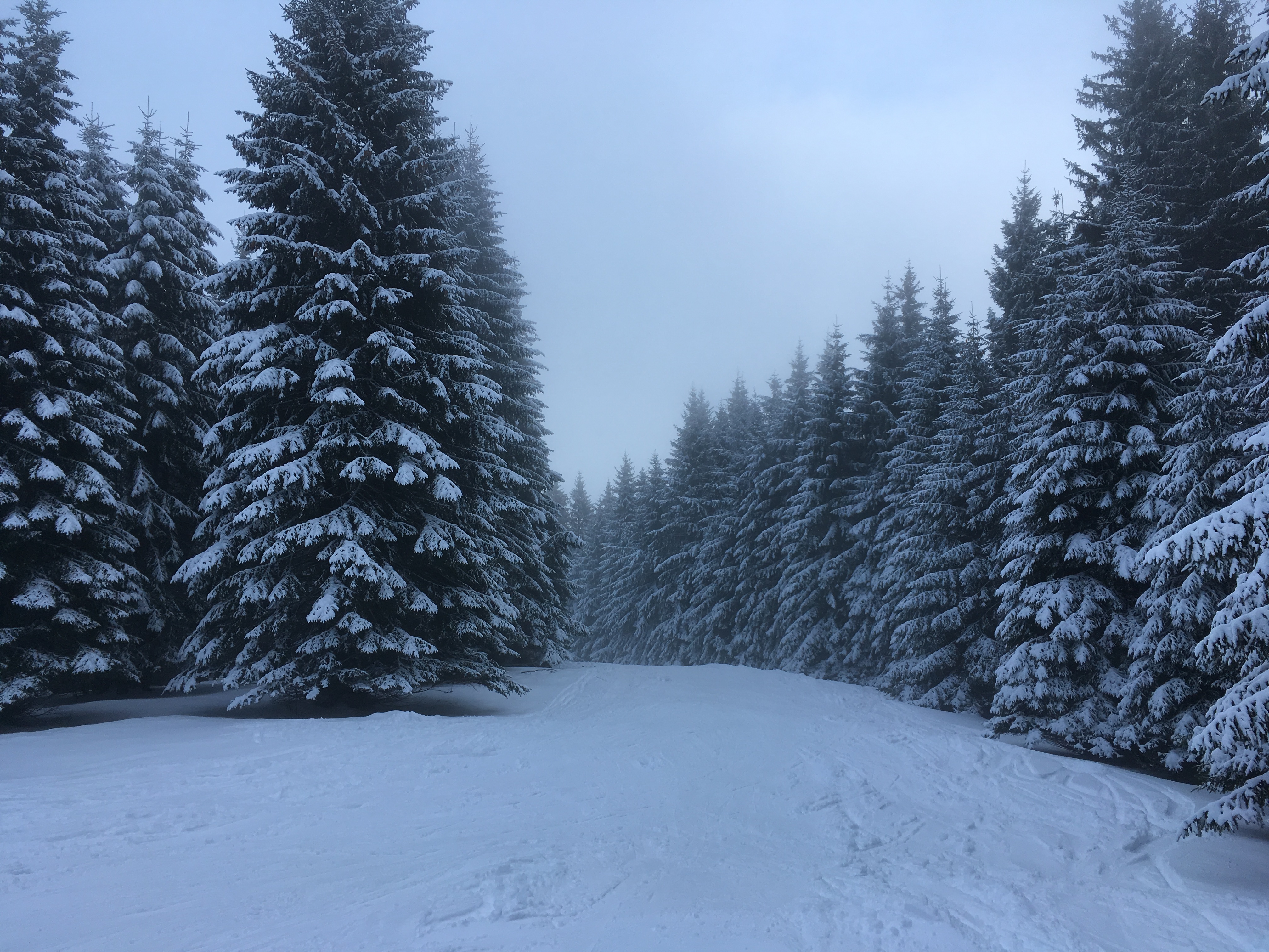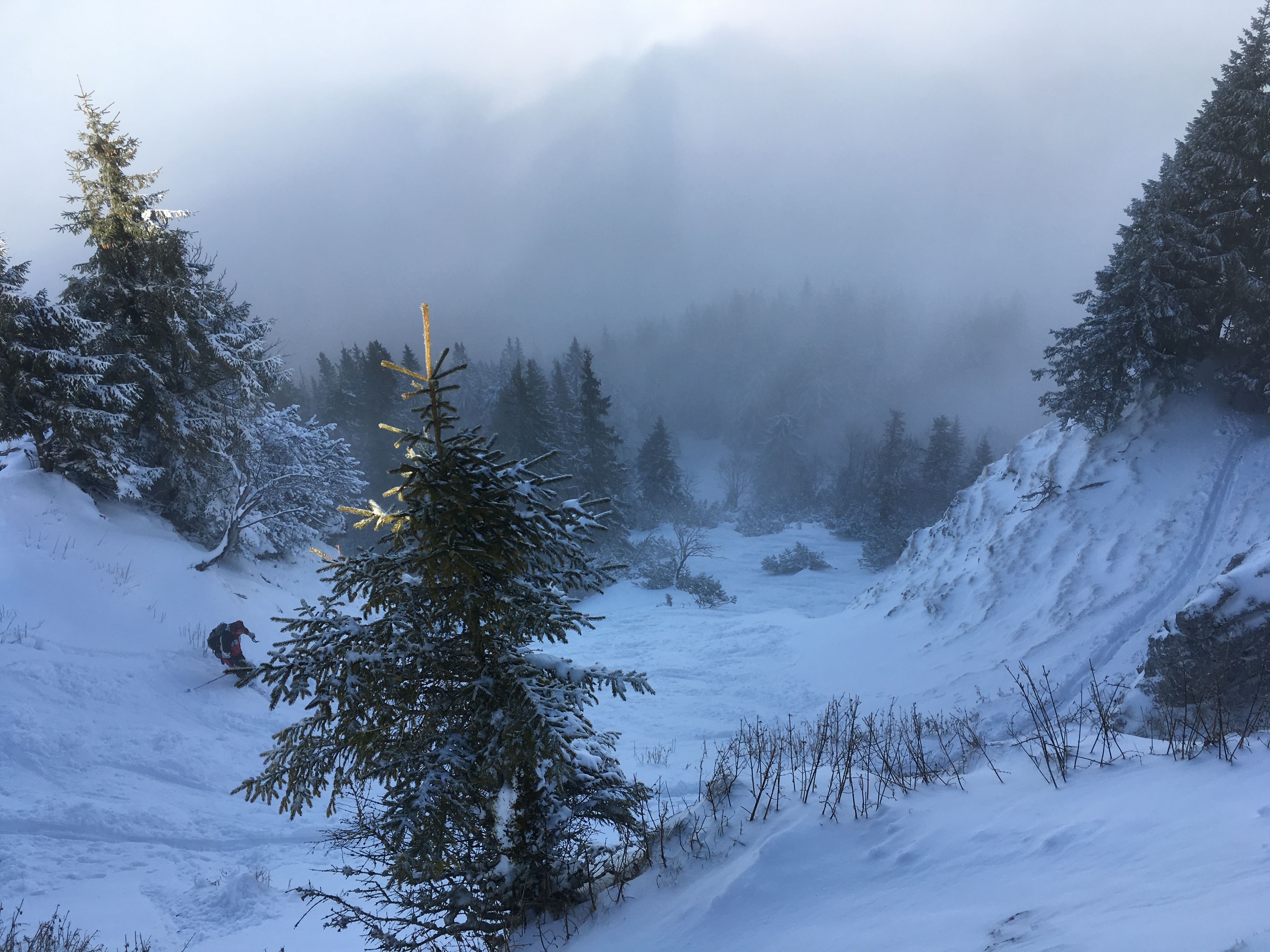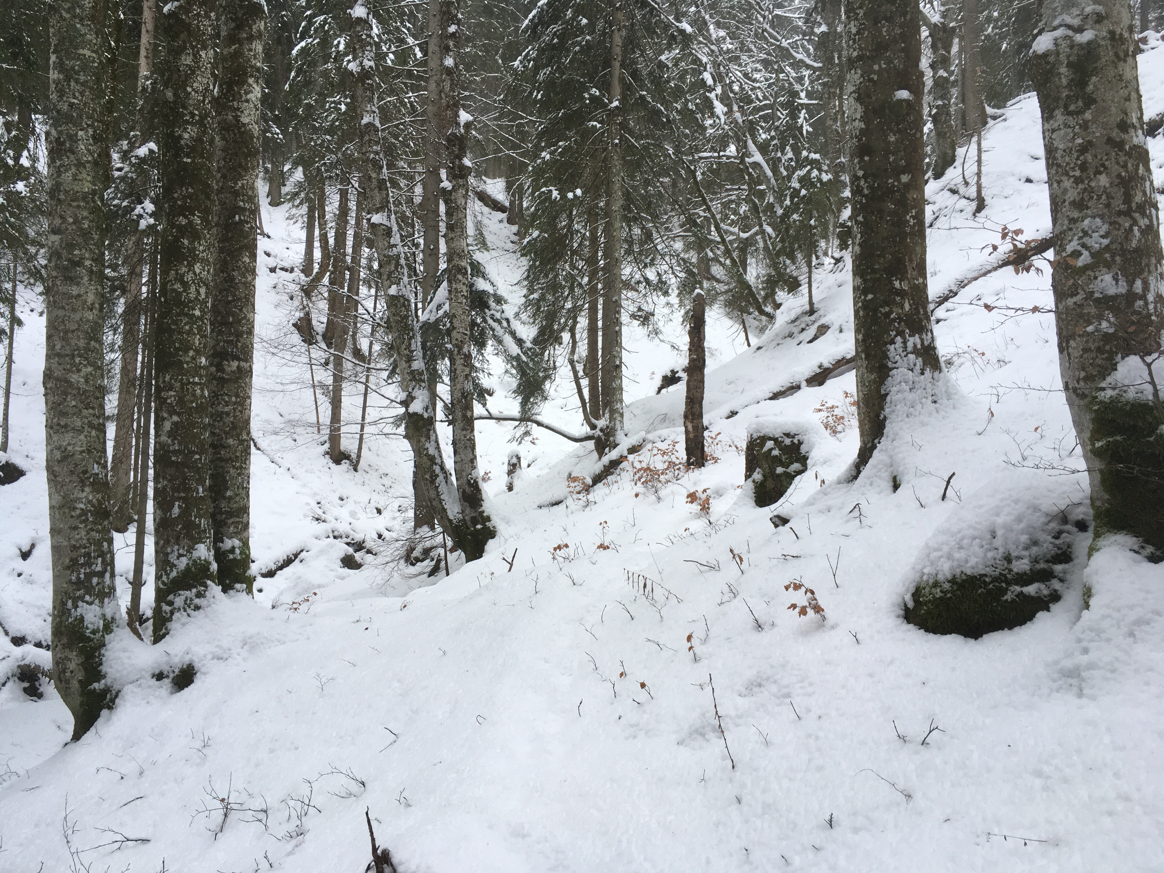 Tourenverhältnisse: Schnee von unten weg, allerdings unten im freien Gelände sehr wenig und eis-, fels- und wurzeldurchsetzt; je weiter oben, desto mehr Schnee, oben Pulver, aber schon stark eingefahren