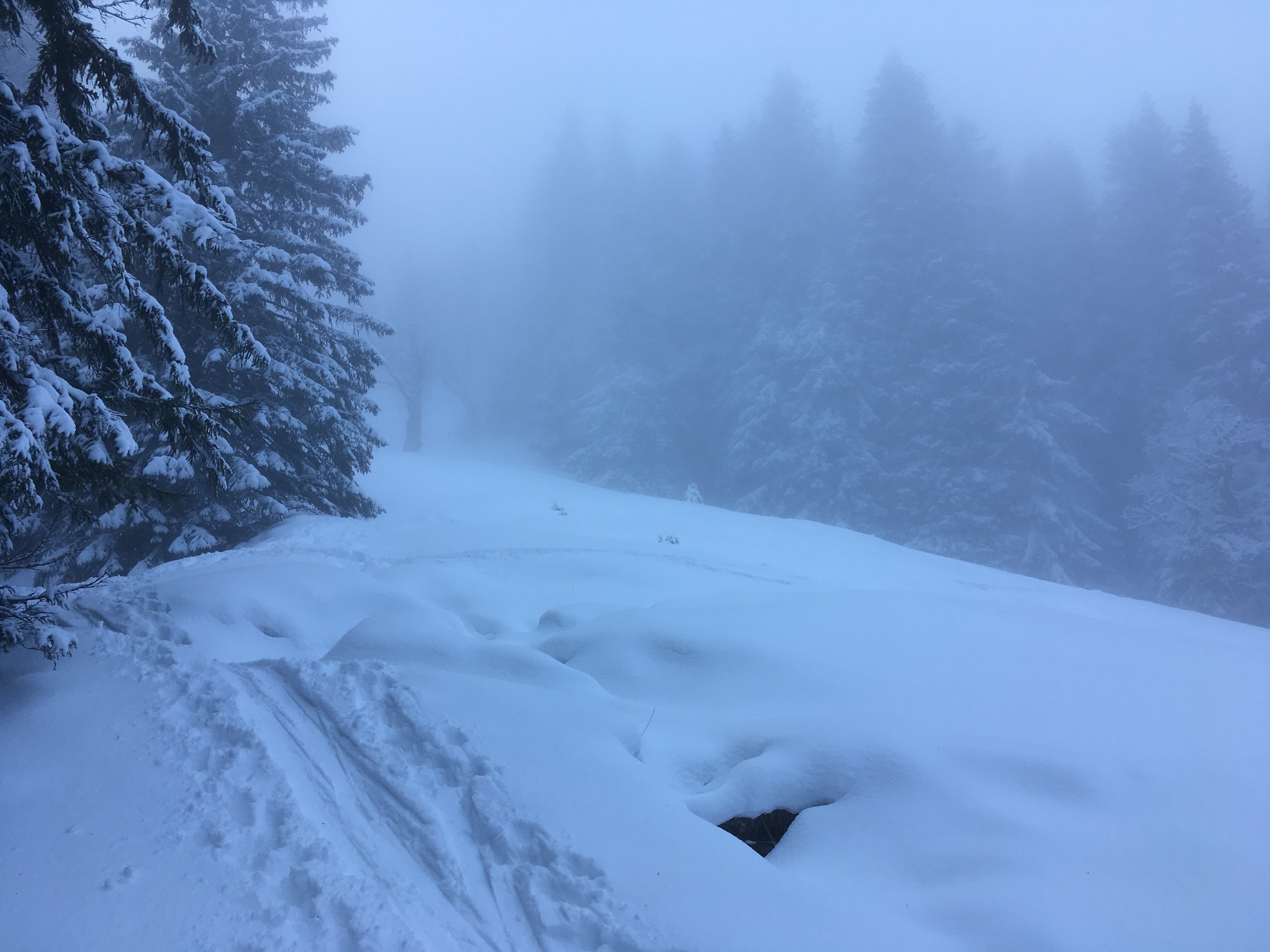 Aus dem Wald kommend im freien Gelände genau an der Nebelgrenze:
