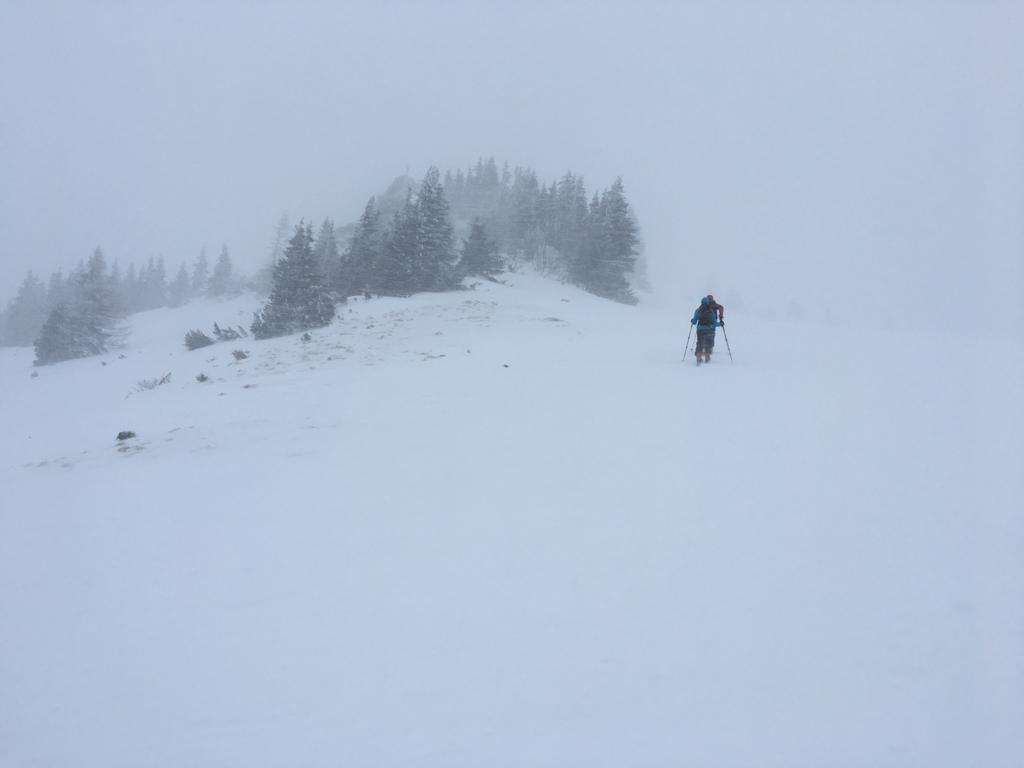 Tourenverhältnisse: Viel Pulverschnee, viel Wind und wenig Leute. Zum Fahren super - die Waldschneise ganz toll! Allerdings oben Sturm und schlechte Sicht. Wind, frische Verwehungen und ein Quickie-Blocktest haben uns zu einem sehr defensiven Verhalten ermahnt! Der Block ist am Stück als 40 bis 50 cm Würfel bereits ohne Draufschlagen abgebrochen. Wir haben die Verhältnisse oberhalb der Waldgrenze bereits am Nachmittag auf Stufe 4 geschätzt. Und es schneit und stürmt weiter....