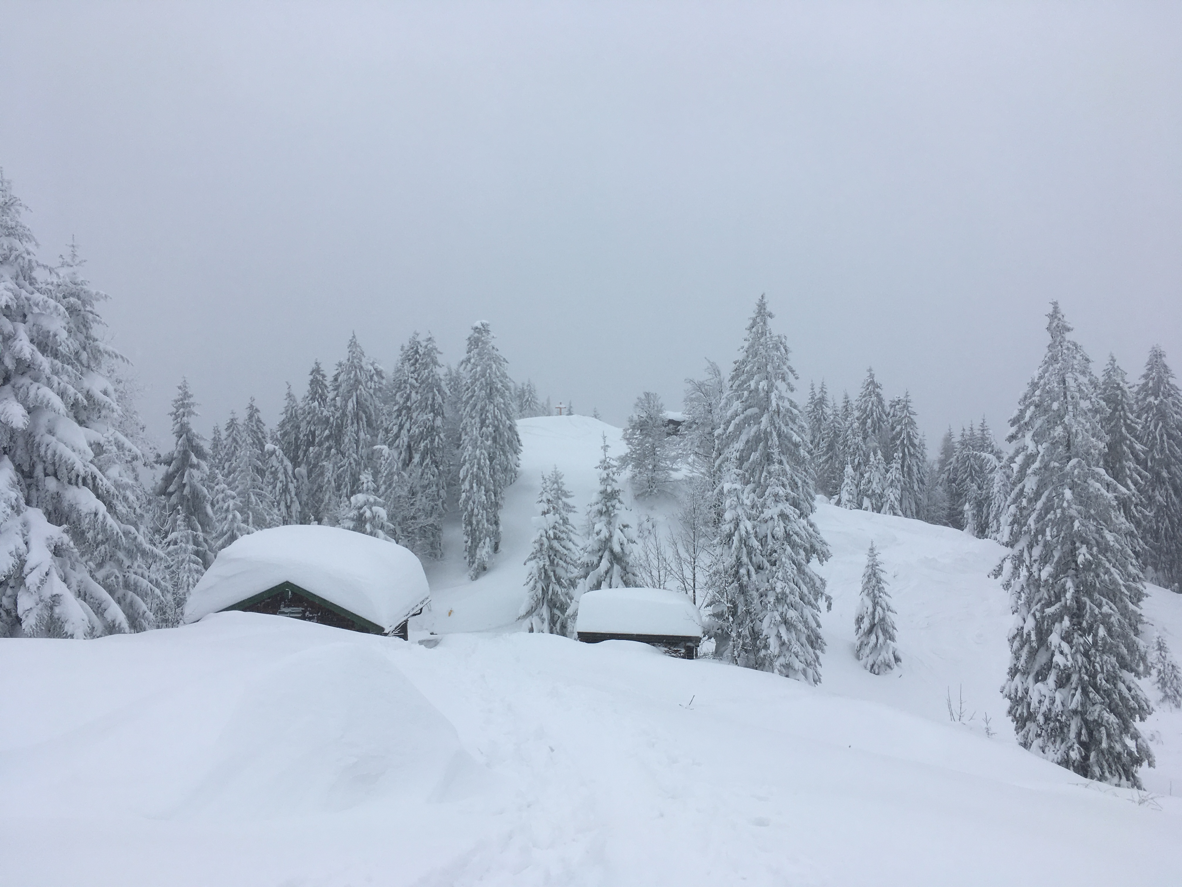 Gefahreneinschätzung: Lawinengefahr sehr gering, Schneebruch am Samstag nach meiner Einschätzung auch vertretbar (ein paar bereits umgestürzte Bäume und ansonsten noch nicht extrem Schnee - zudem zumeist breite Schneise)