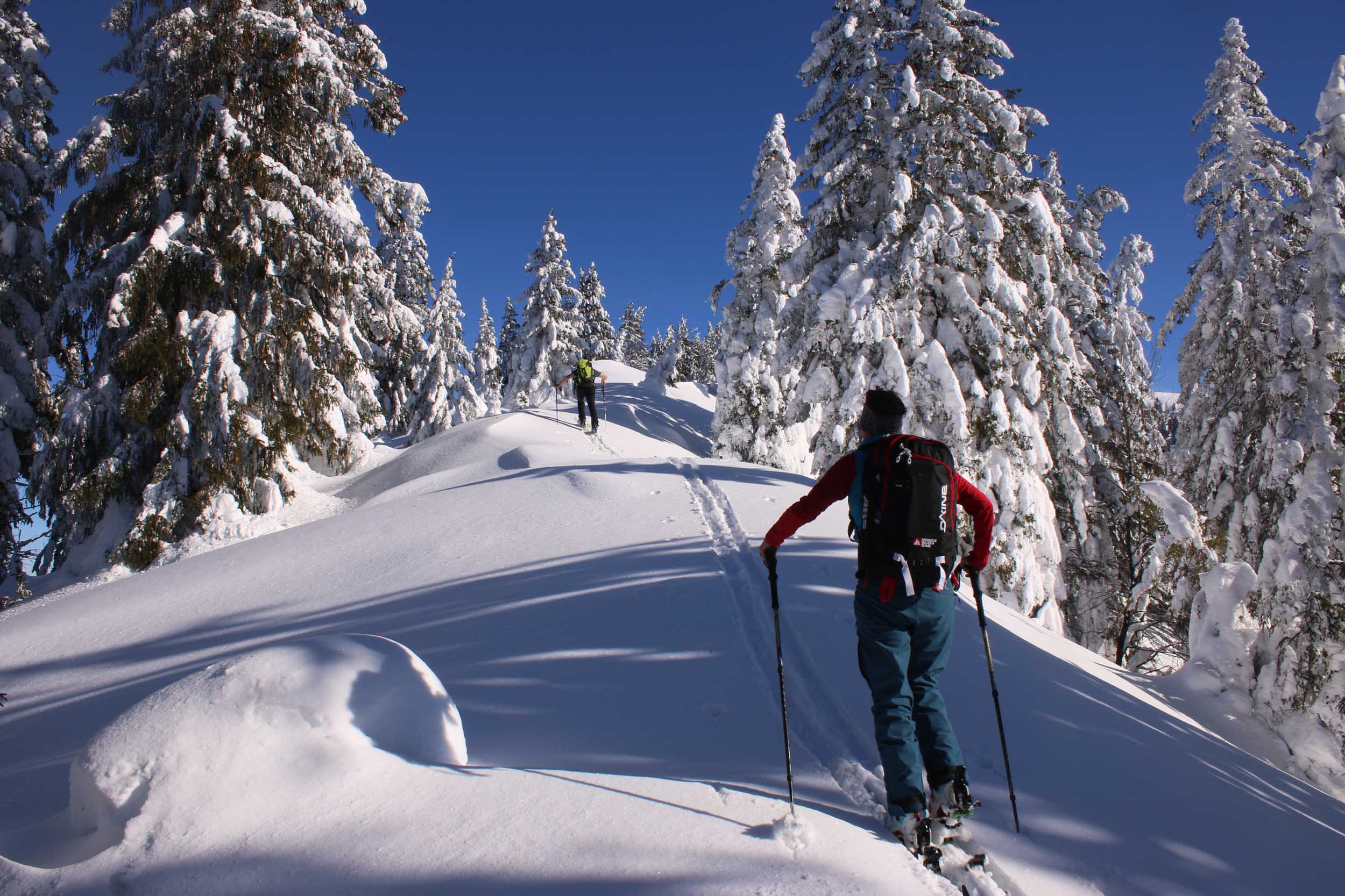 Gefahreneinschätzung: Ich würde unterhalb der Waldgrenze bereits Stufe 2 vergeeben. Wir konnten problemslos die steilen Waldschneisen auf der Schönberg Nordseite abfahren. Ansonsten ein paar Gleitschneelawinen bis auf den Grund an Ost- und Südseitigen sehr steilen Wiesenhängen.