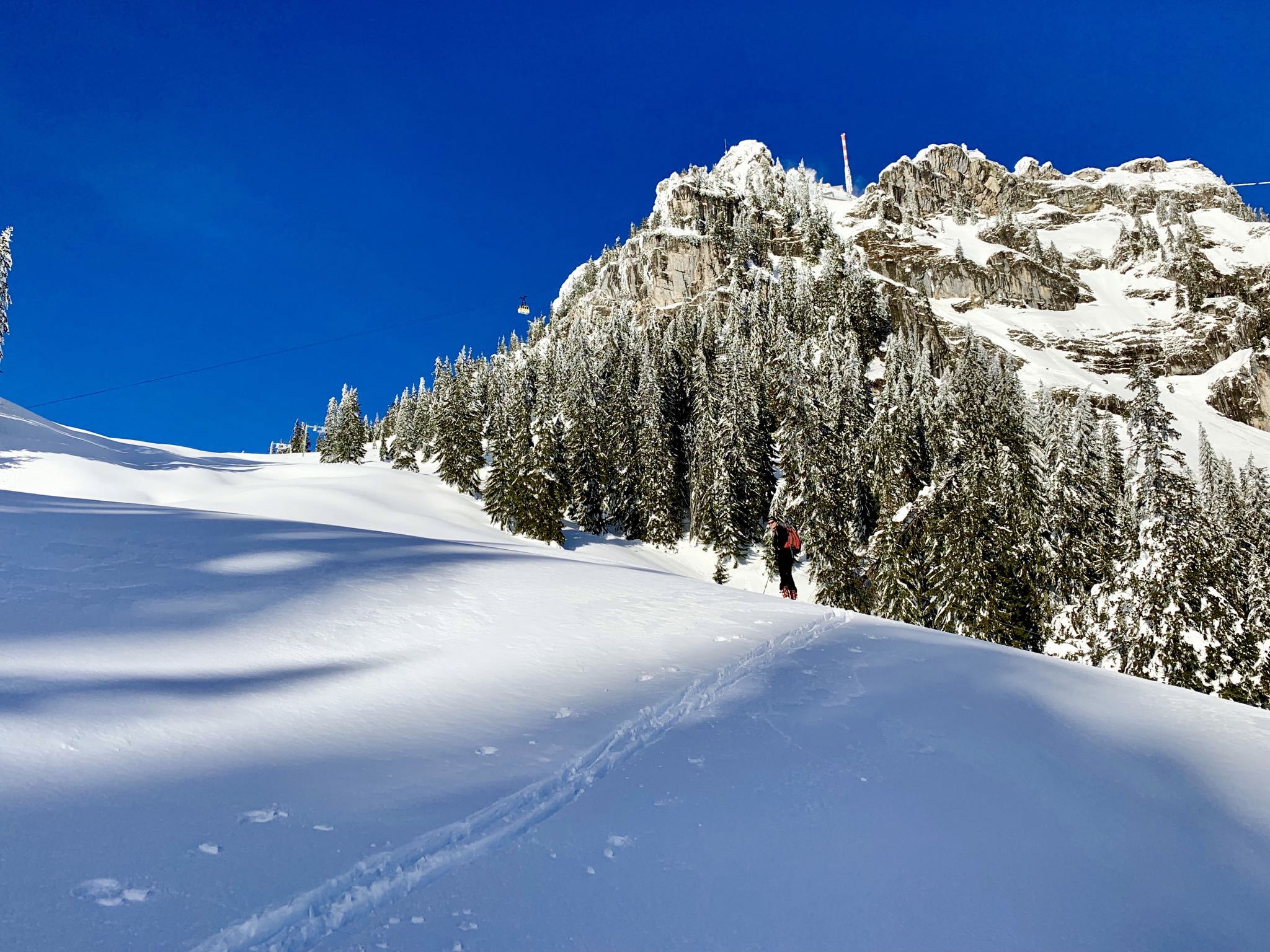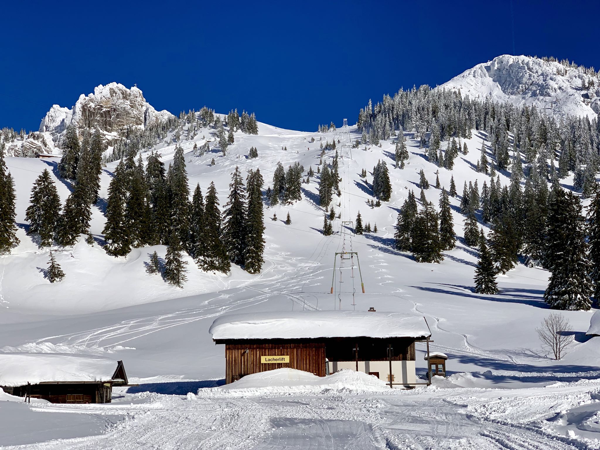 Tourenverhältnisse: Bis zur Wendelsteiner Alm perfekt gewalzt, zur Bocksteinscharte hoch unverspurter, plattiger Pulver; zum Lacherspitz schon recht verspurt