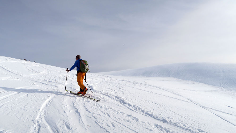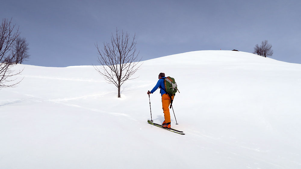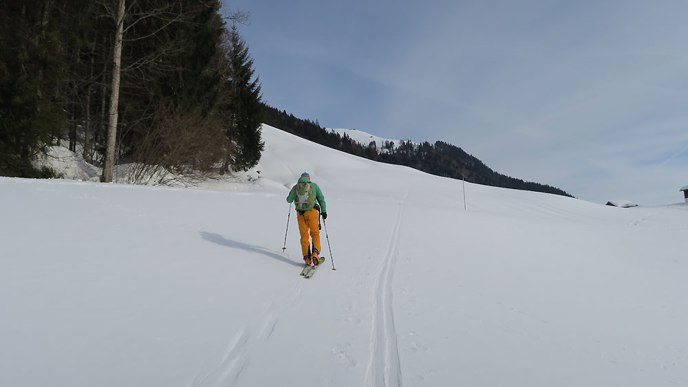 Wir sind dann nördlich des Gipfel ca. 200 Hm nach Osten abgefahren - hier sehr feiner pulvriger Schnee und unverspurt. Dann Wiederaufstieg zum Gipfel. Bei der normalen Abfahrt hielten wir uns im Windschatten von Baumgruppen und fanden da und dort doch noch ganz guten Schnee. Insbesondere im Westhang unterhalb der Hitscheralm - hier haben wir uns ganz rechts im Abfahrtssinn gehalten und ganz schönen Pulver gefunden, sind dann nach links auf die Hauptabfahrtsroute zurückgequert.