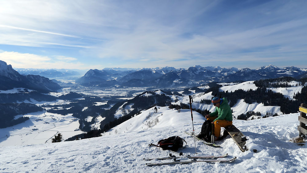 Tourenverhältnisse: Bockelhart auf den unteren Hängen und auch im steilen Wald durch Sonneneinstrahlung und oben entlang der Aufstiegsroute ebenfalls sehr harschig, jedoch hier eher durch den starken Wind.