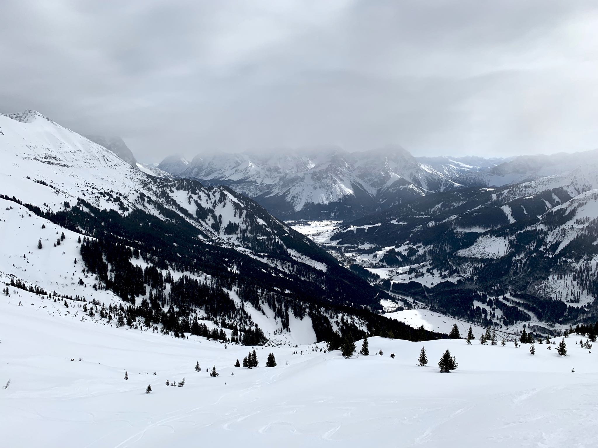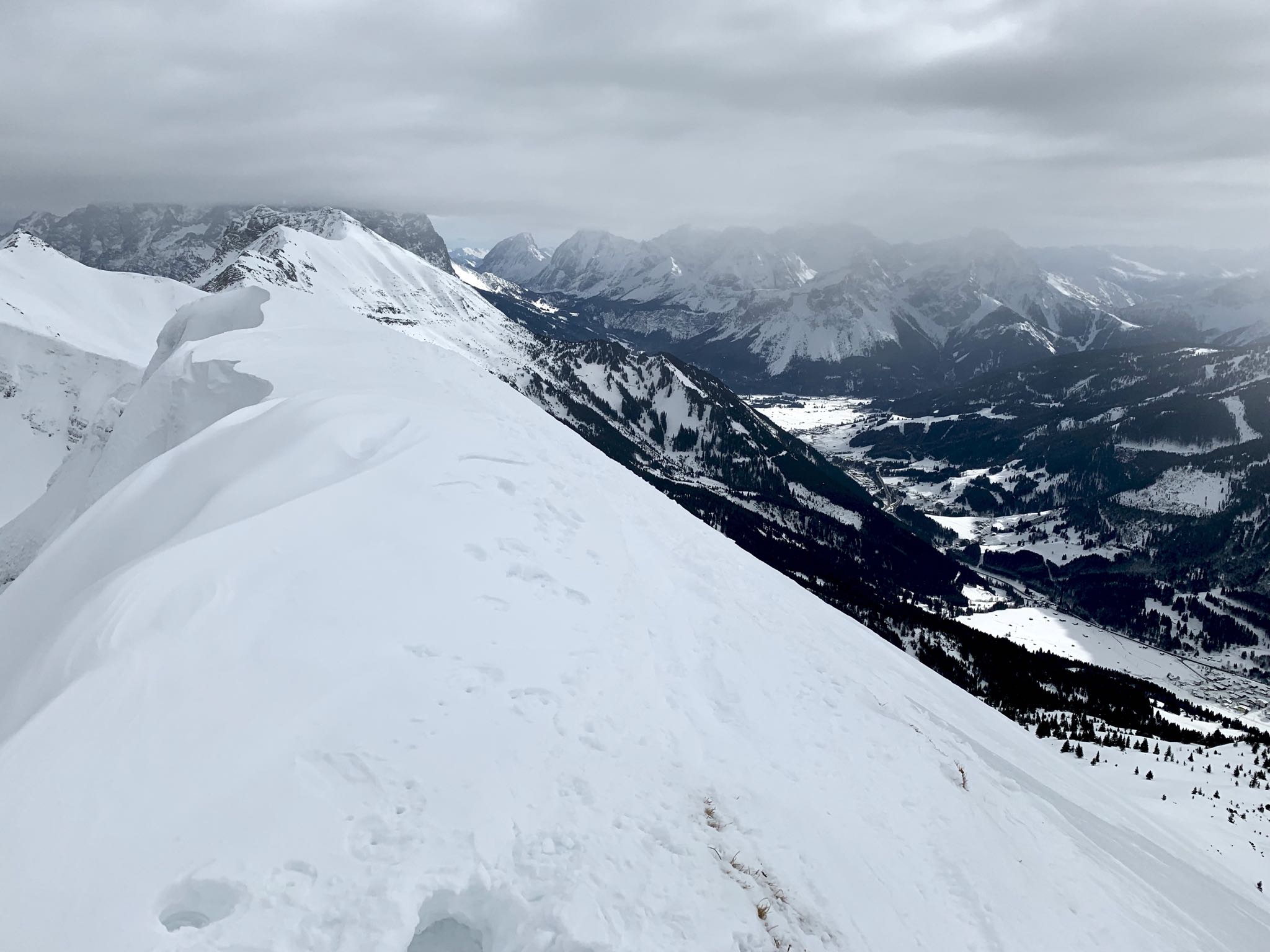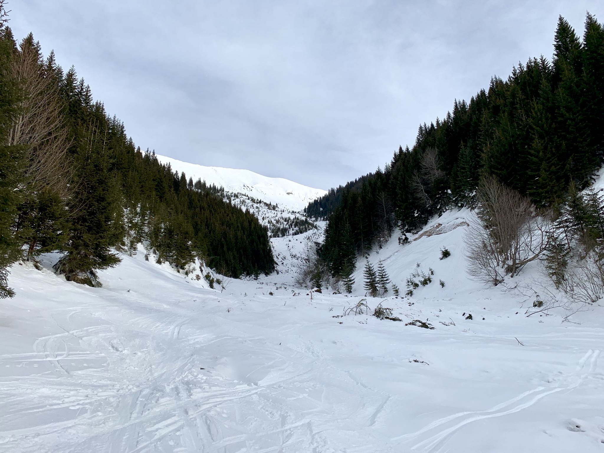 Runter auf dem windbehandelten SSO-Rücken, bis man durch das weite Kar rechter Hand durch feinen Pulver und wenigen Spuren Richtung SO auf den Plattberg (1600m) zuhalten kann. Von dort weiter durch lichten Wald teils steil durch Harsch bis zum Grundbach hinab und dessen Verlauf folgend talauswärts zurück zum Ausgangspunkt.