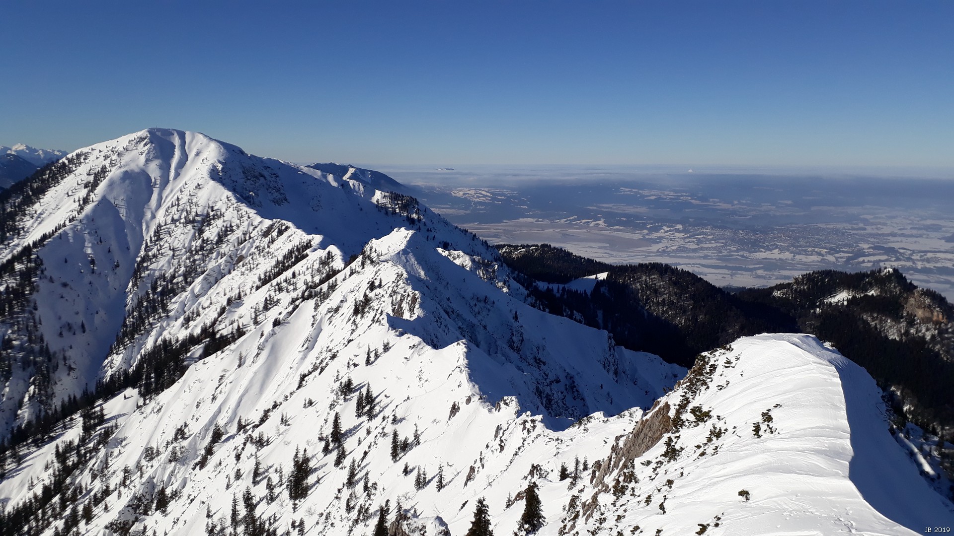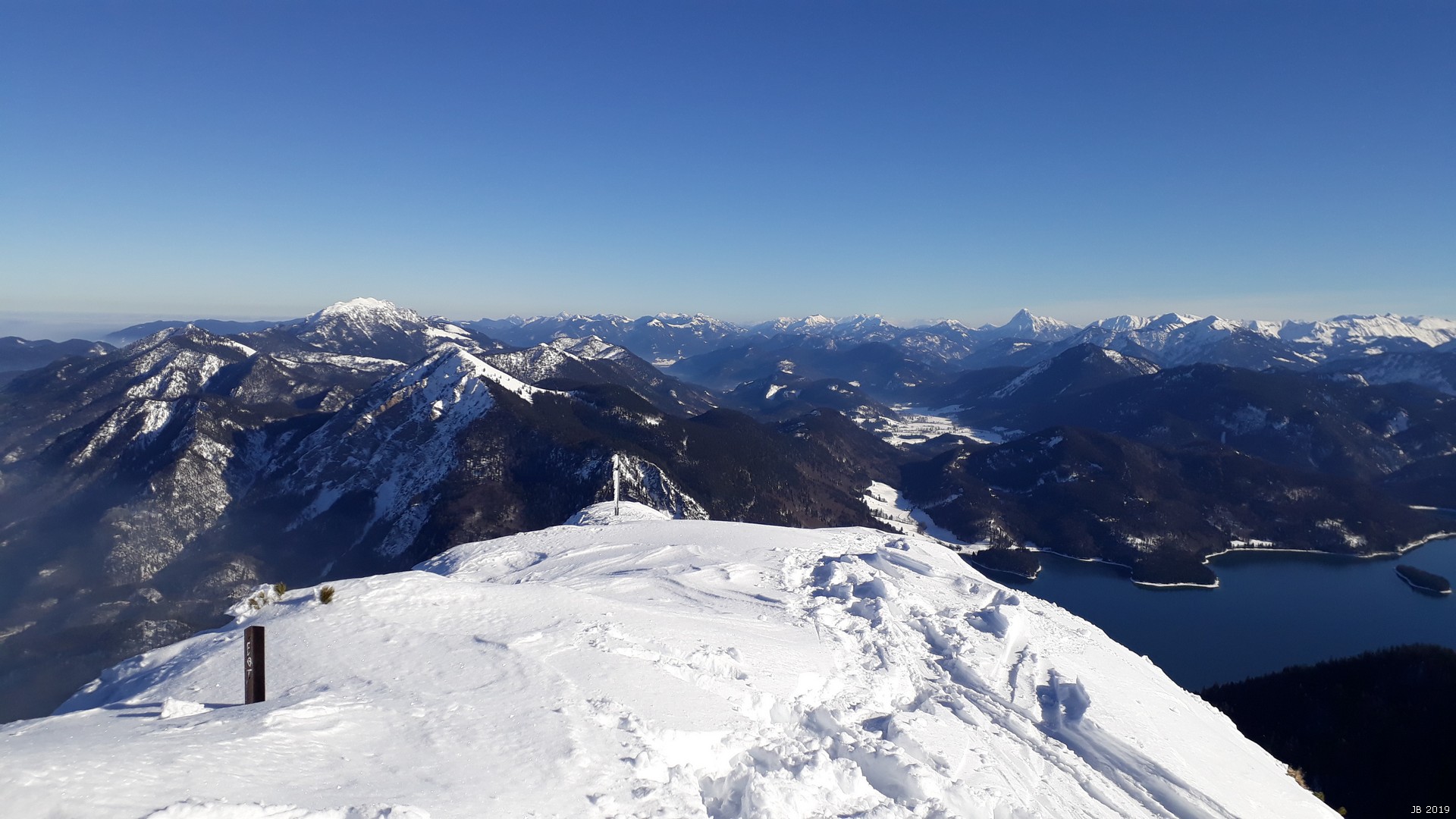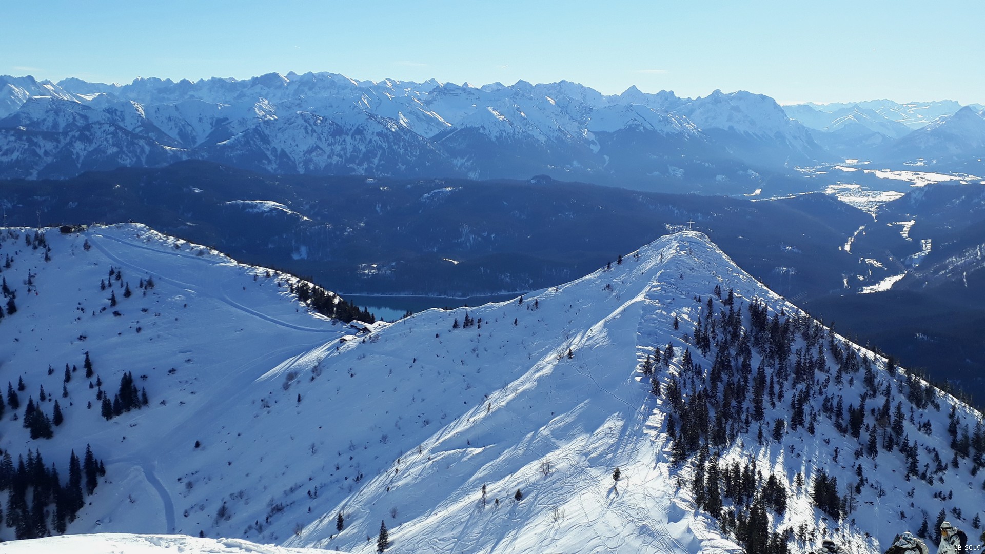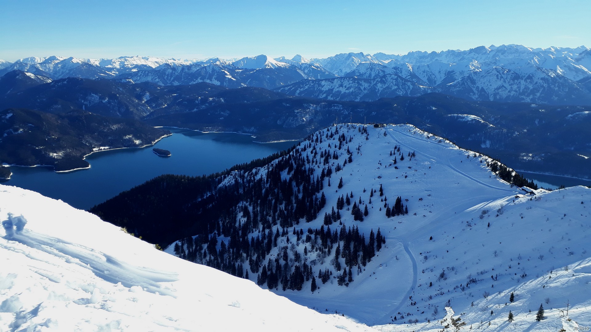 Die hohe und sichere Schneelage erlaubt es derzeit, mit den Skier bis zum Gipfelpavillon hinaufzusteigen. Vom Reitweg führt durch die Mulde zwischen Herzogstand und Martinskopf eine gute Aufstiegsspur. Im oberen Teil ist der Schnee etwas windgepreßt, aber noch gut fahrbar.
