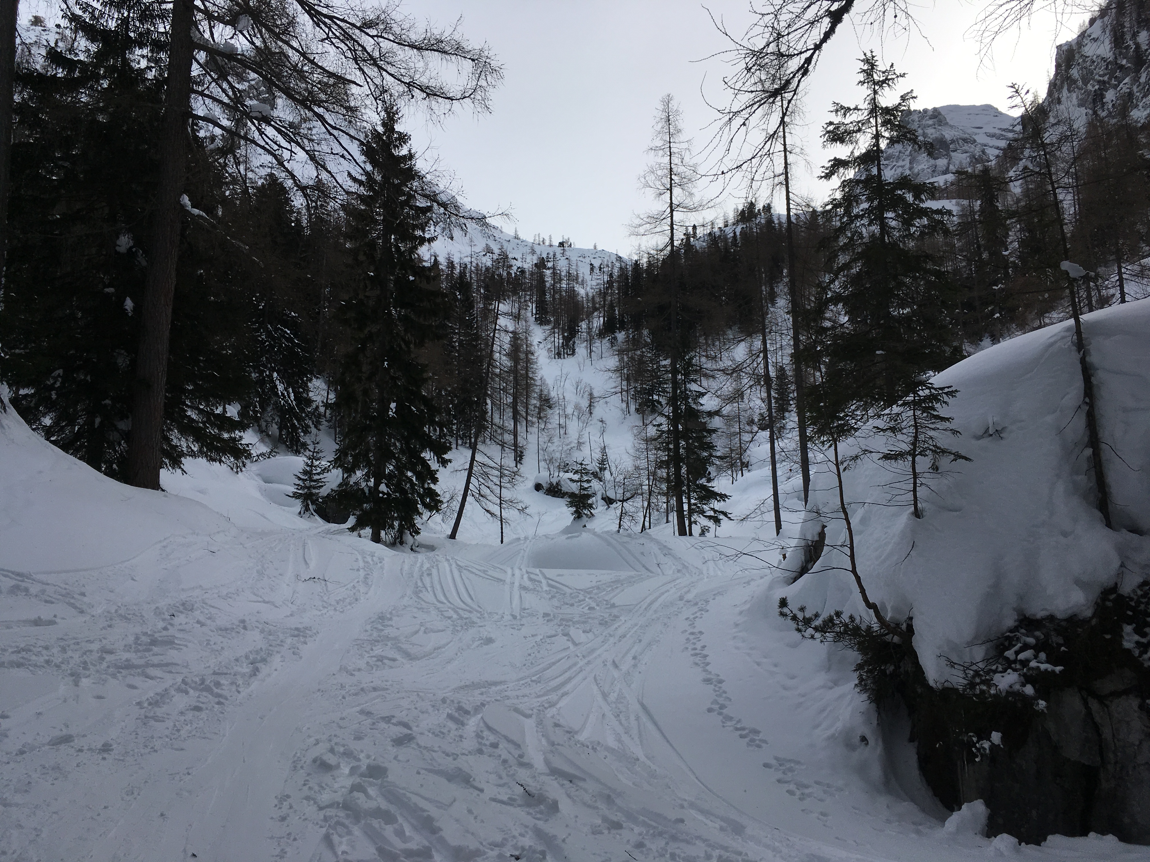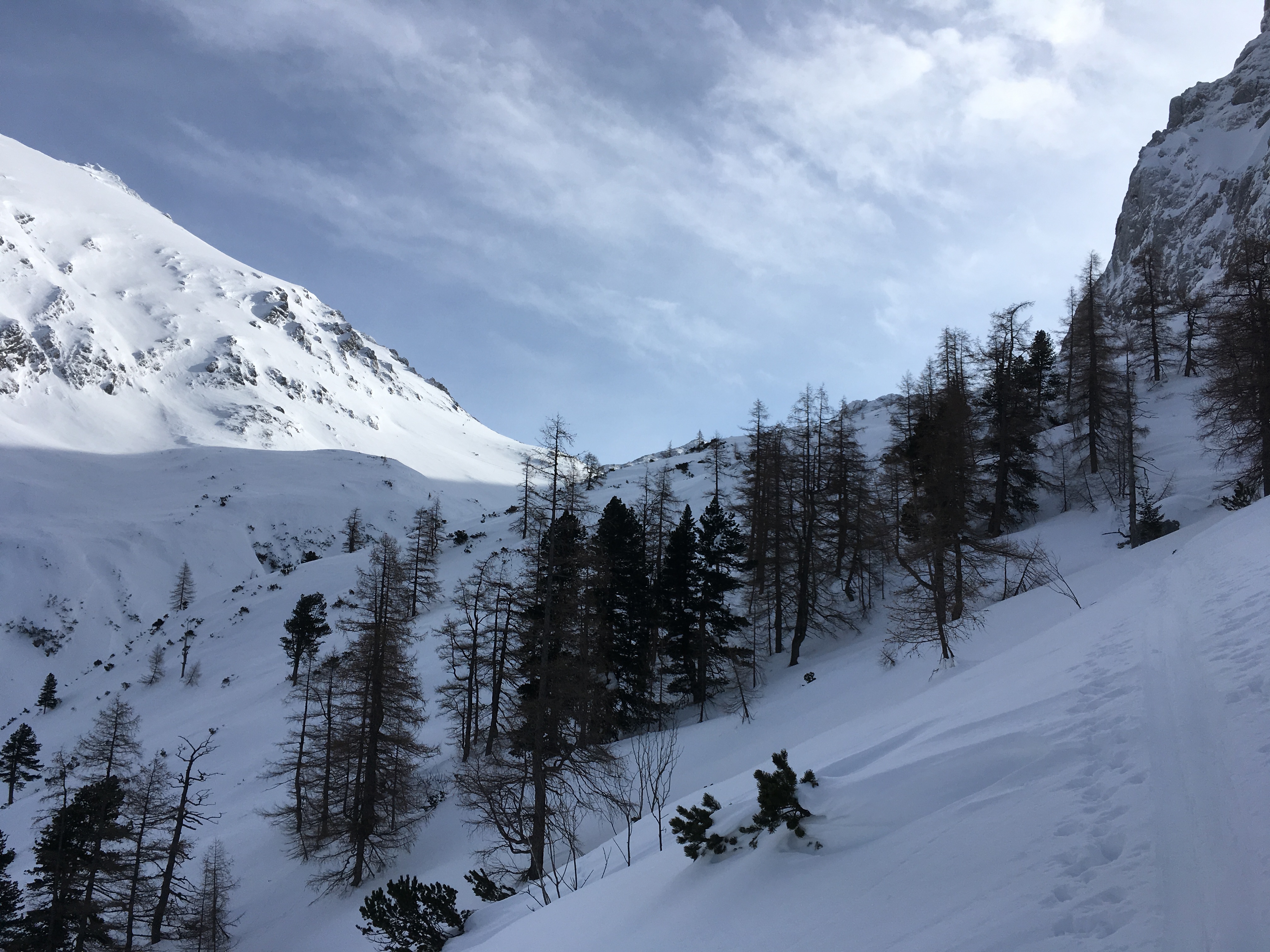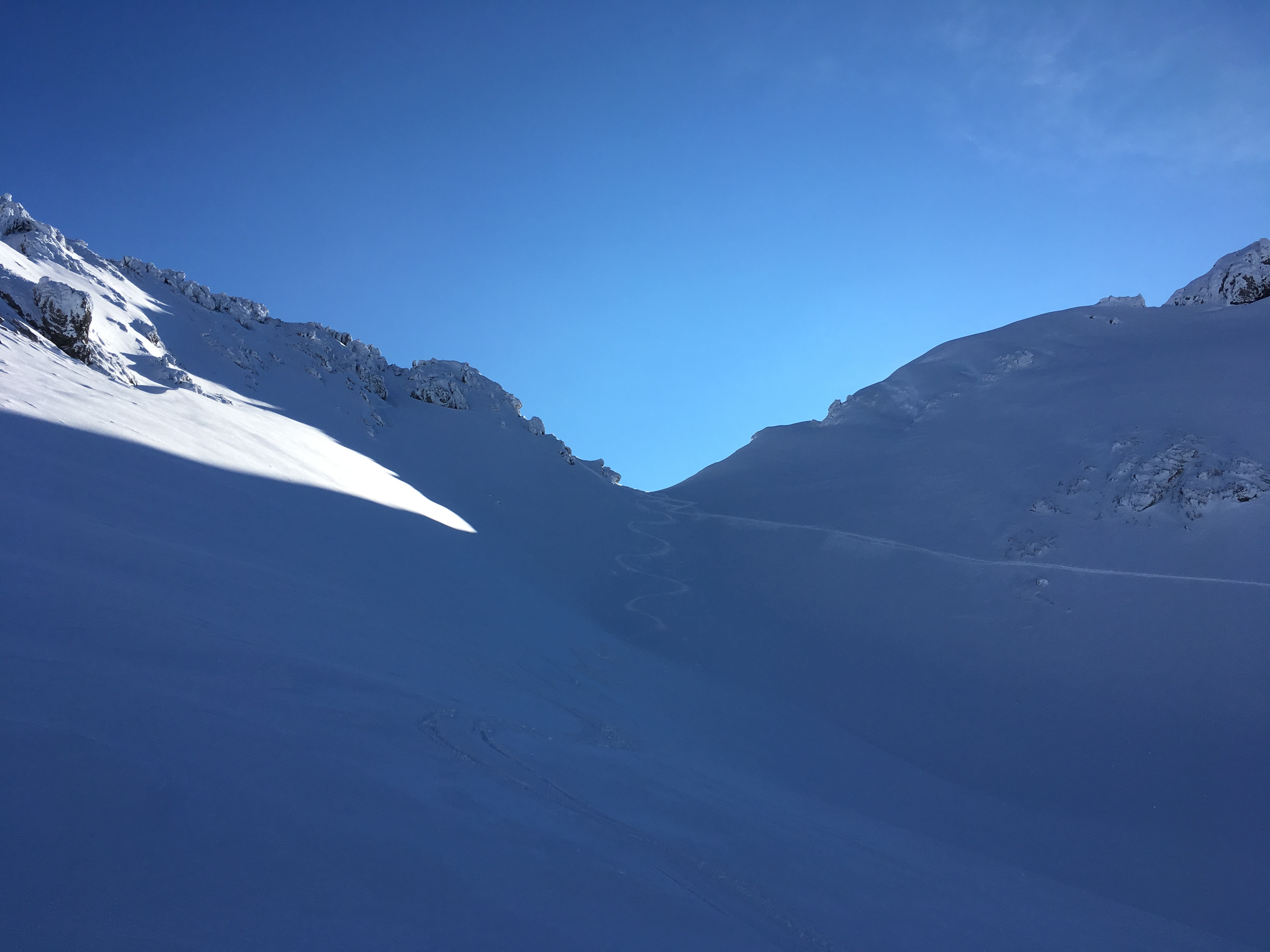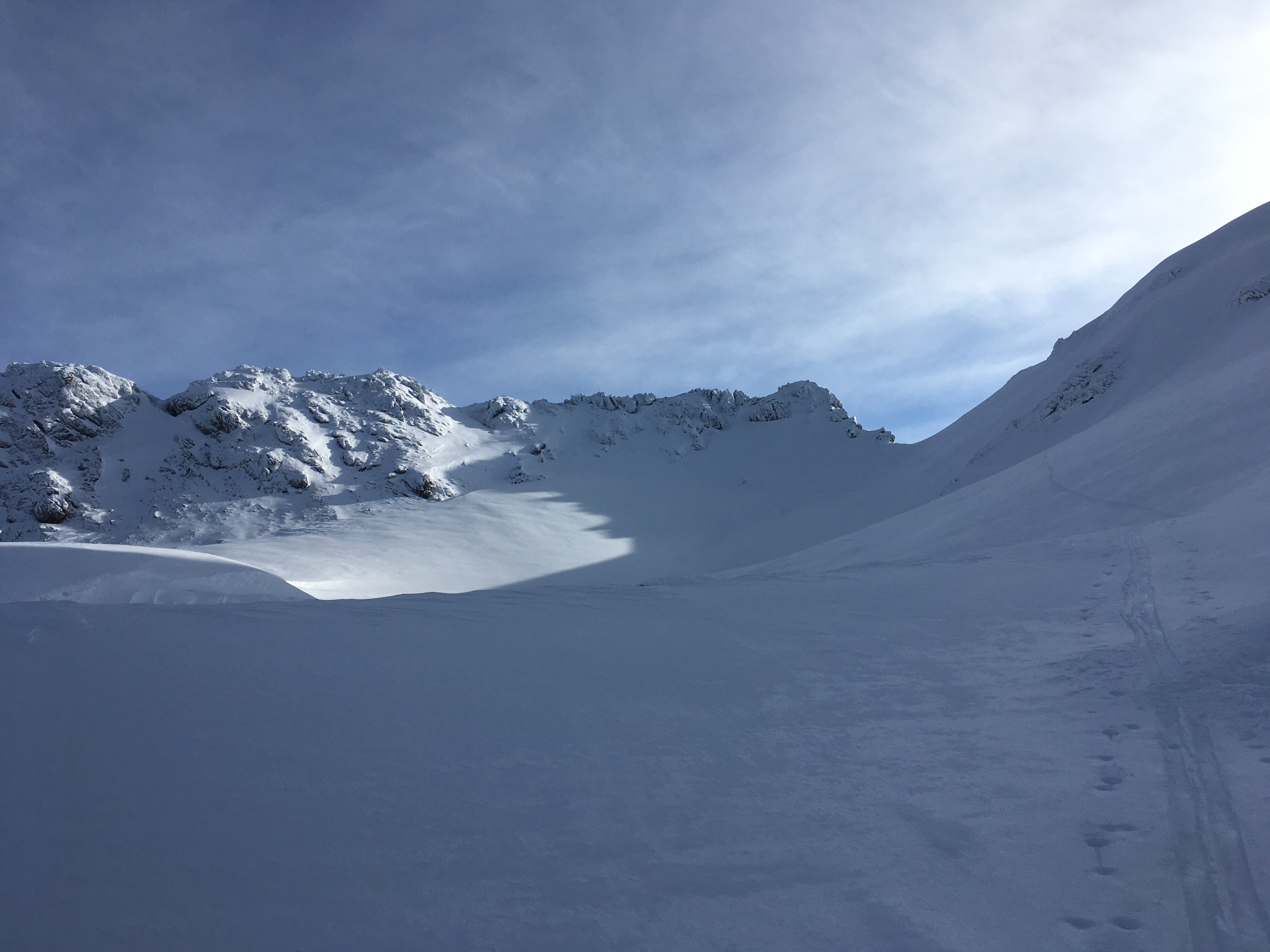 Tourenverhältnisse: genug (Pulver-)Schnee, im oberen Karbereich auch windbehandelte Stellen und Steinkontakt nicht völlig auszuschließen