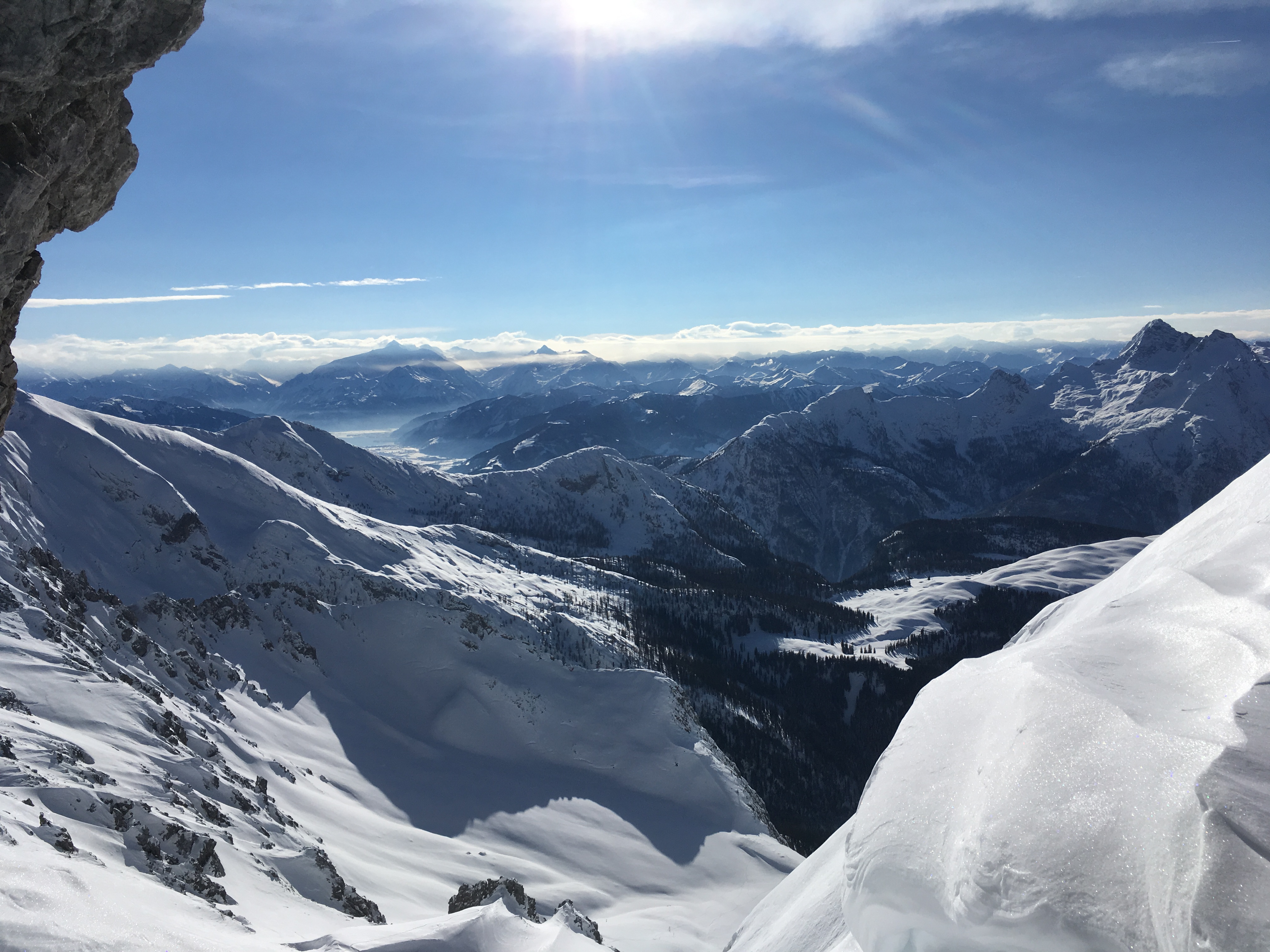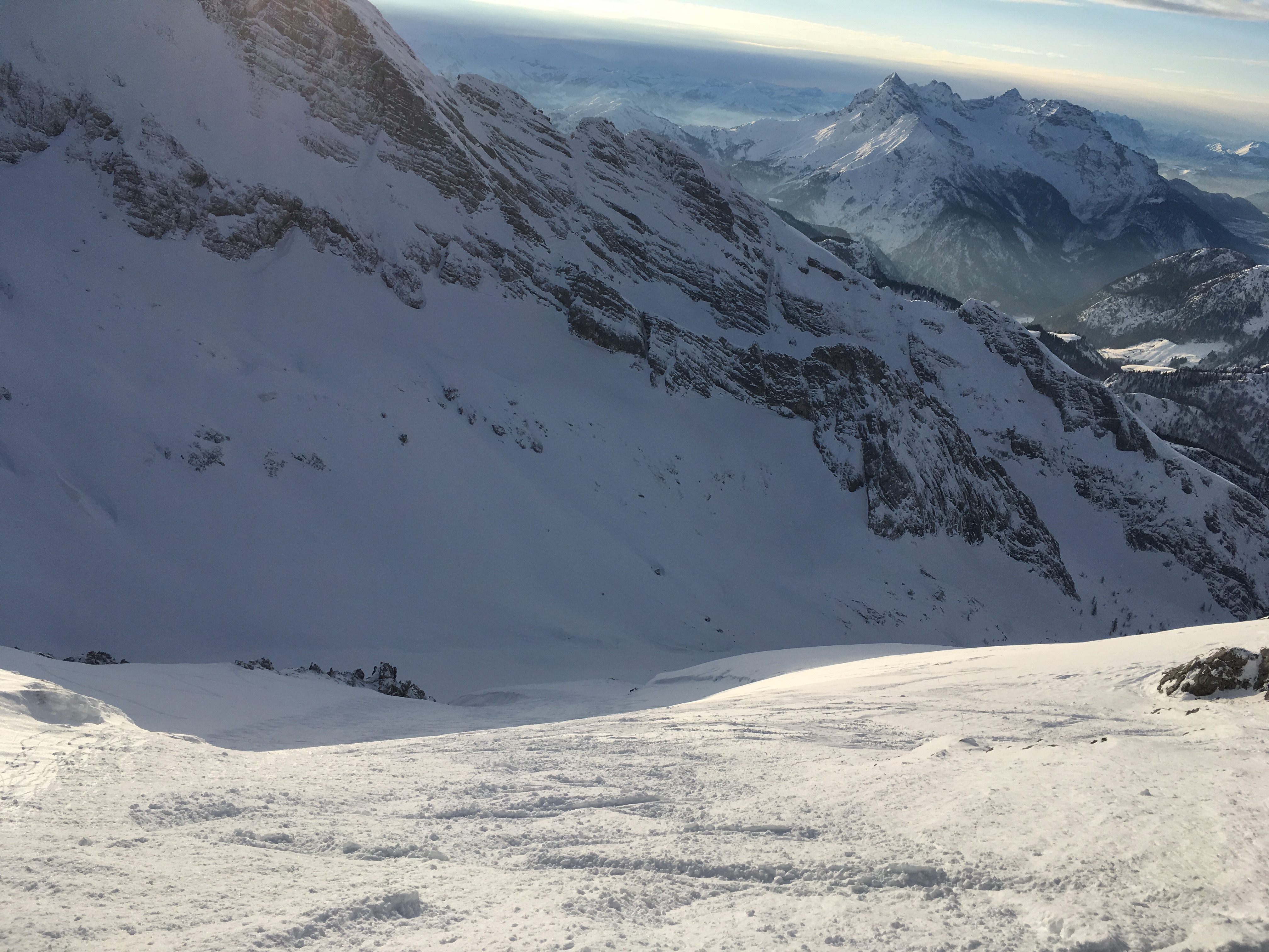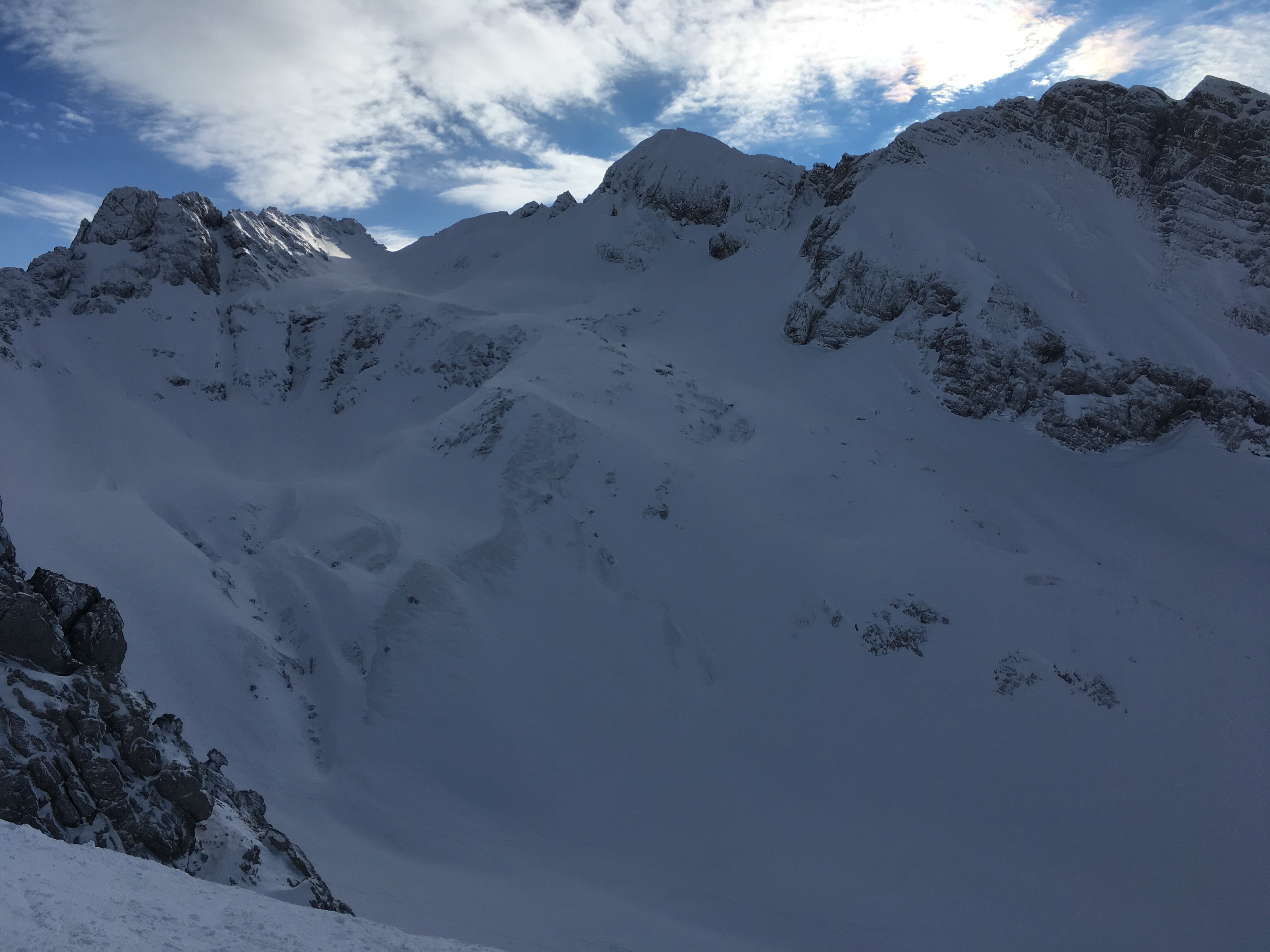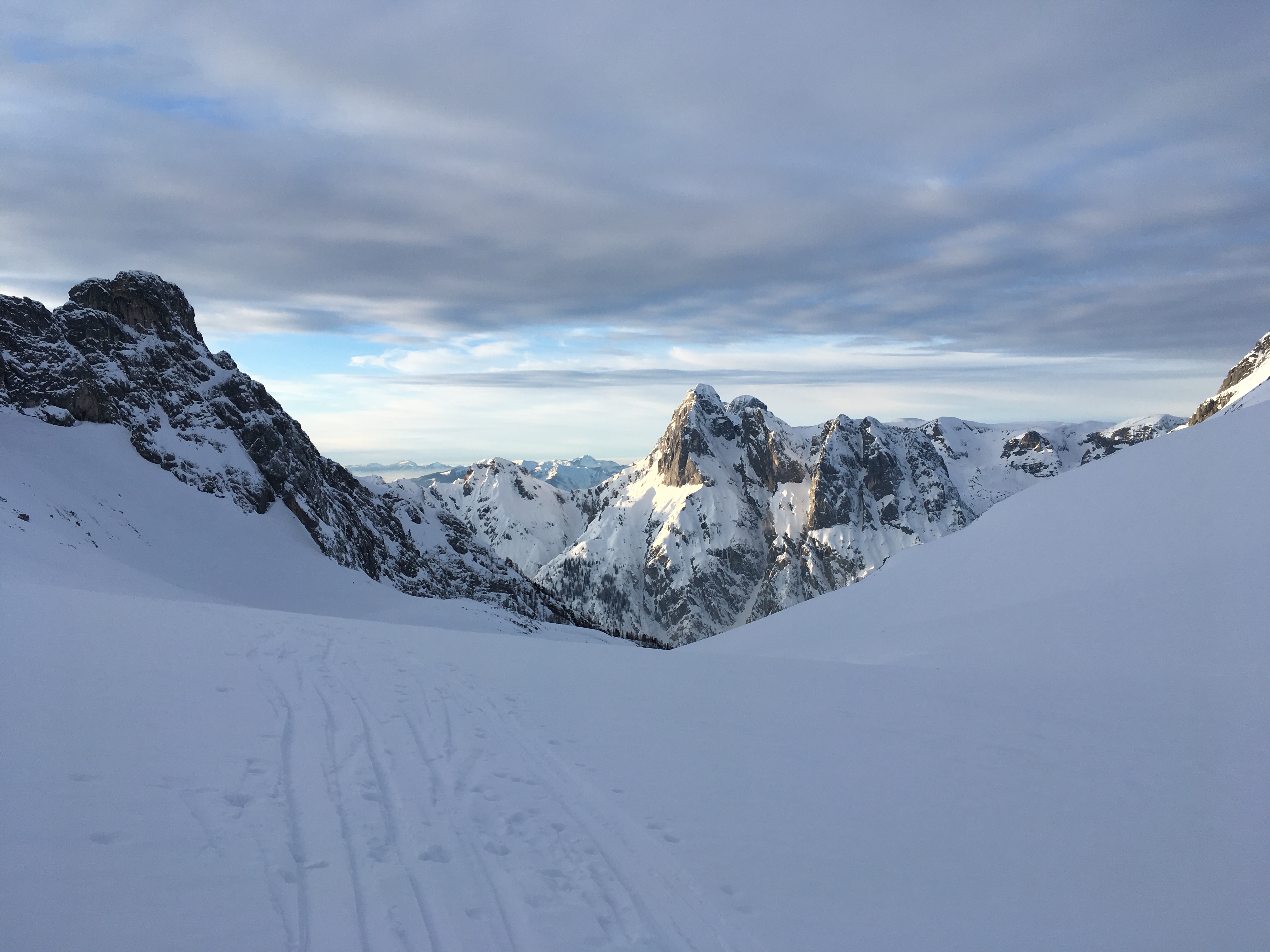 Tourenverhältnisse: genug (Pulver-)Schnee, im oberen Karbereich auch windbehandelte Stellen und Steinkontakt nicht völlig auszuschließen