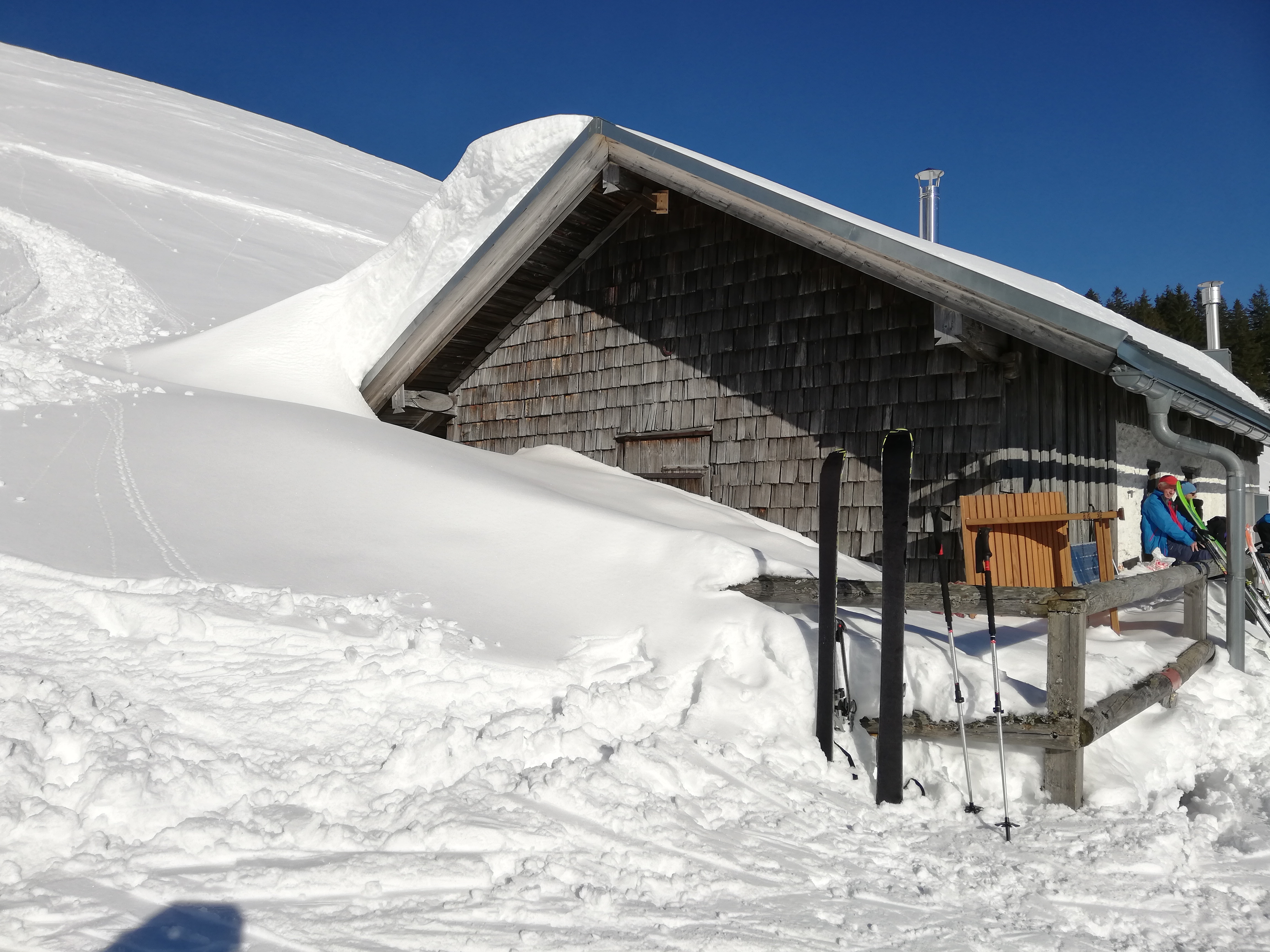 Kann mich nicht erinnern, ob bzw. wann ich schon mal so gute Schneeverhältnisse am Hirschberg hatte! Latschen zugeschneit, kein Stein am Rücken oberhalb der Rauheckalm oder im Südhang unterhalb der Alm, im Freien Gelände zerfahrener Pulverschnee, Piste griffig, keine Eisplatten.