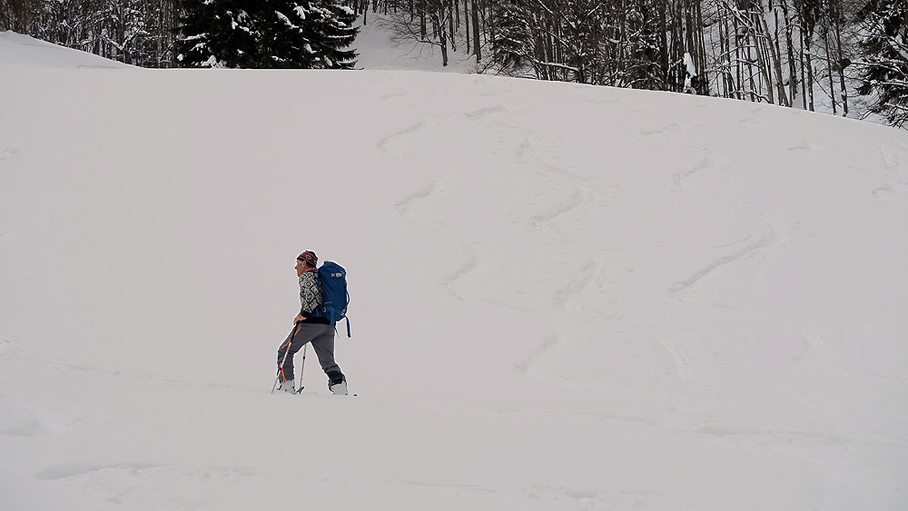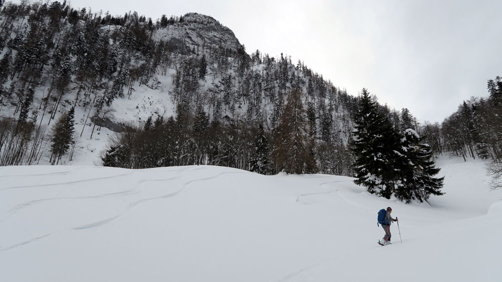 Gefahreneinschätzung: Gering. Nur ganz oben im Sattel Bedrohung aus den sehr steilen Flanken des Sparber. Bei Erwärmung oder viel Neuschnee nicht ohne - aber man könnte frühzeitig auf den Gegenhang ausweichen.