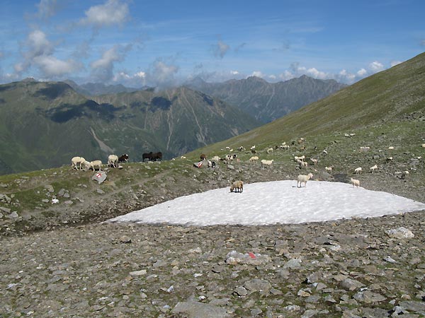 Tourenverhältnisse: Roter Kogel: Bestens - bei frühem Aufbruch durch die westseitige Lage auch lange kühl und schattig. Fast alles trocken und schneefrei - bis auf einen kleinen Flecken (über den sich die zahlreichen Schafe freuen - siehe Bild)