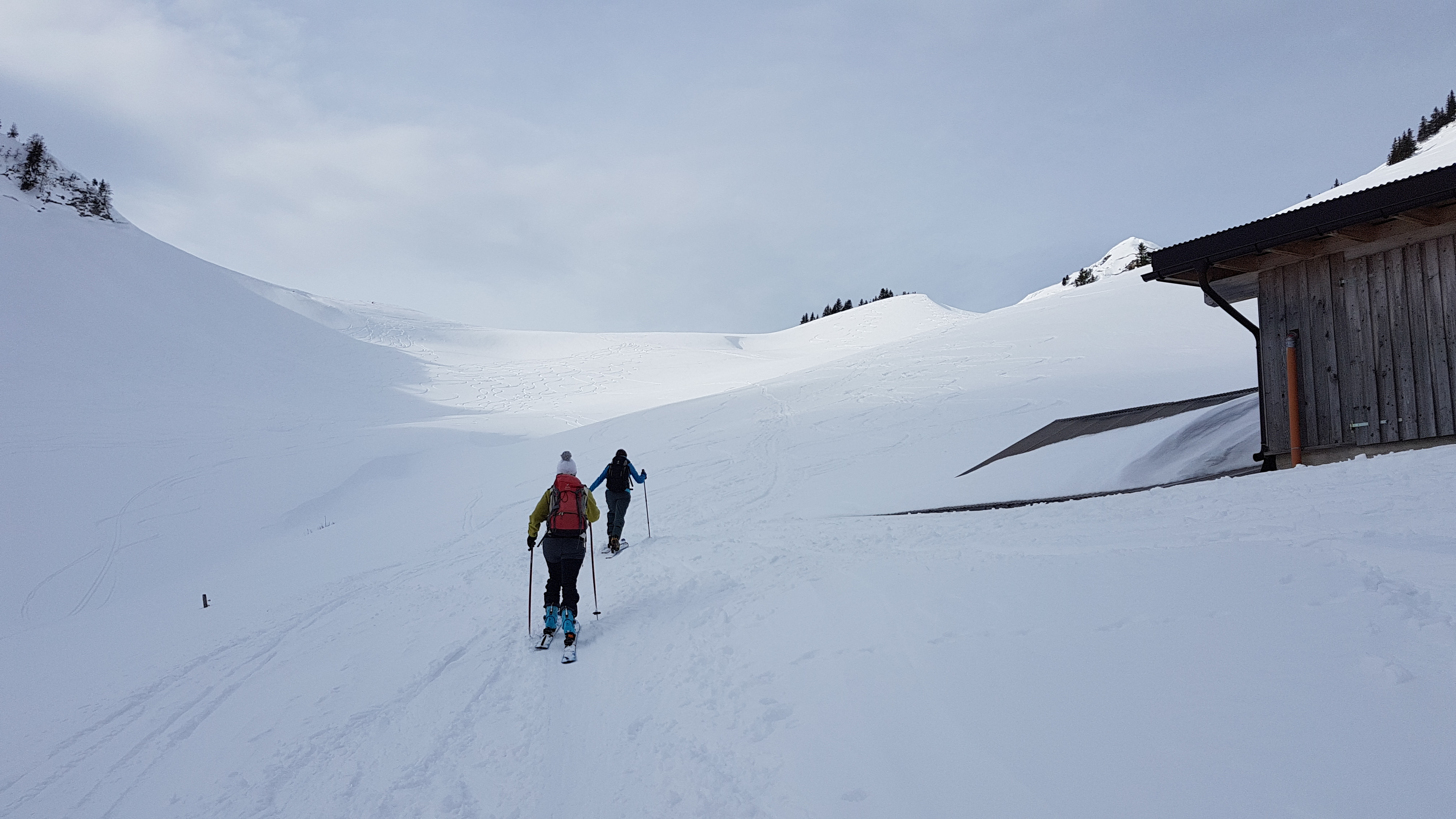 Tourenverhältnisse: Noch überwiegend gut. Auf den leicht nach Süden ausgerichteten Hängen schon sehr schwerer Schnee - bzw. in der Früh Bruchharsch. Hält man sich an die Schattenhänge (im Abfahrtssinn rechts) hat man noch ein gutes Stück recht schönen Pulverschnee. In der Schneise dann etwas schwer gewordener Pulver - jedoch hier eh schon pistennartig eingefahren.