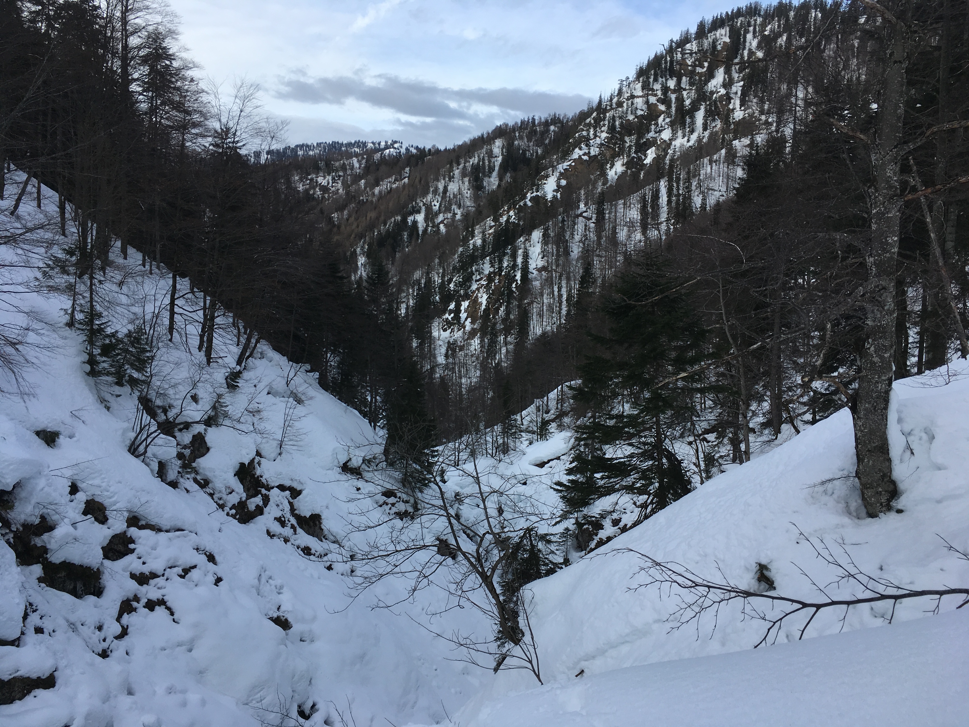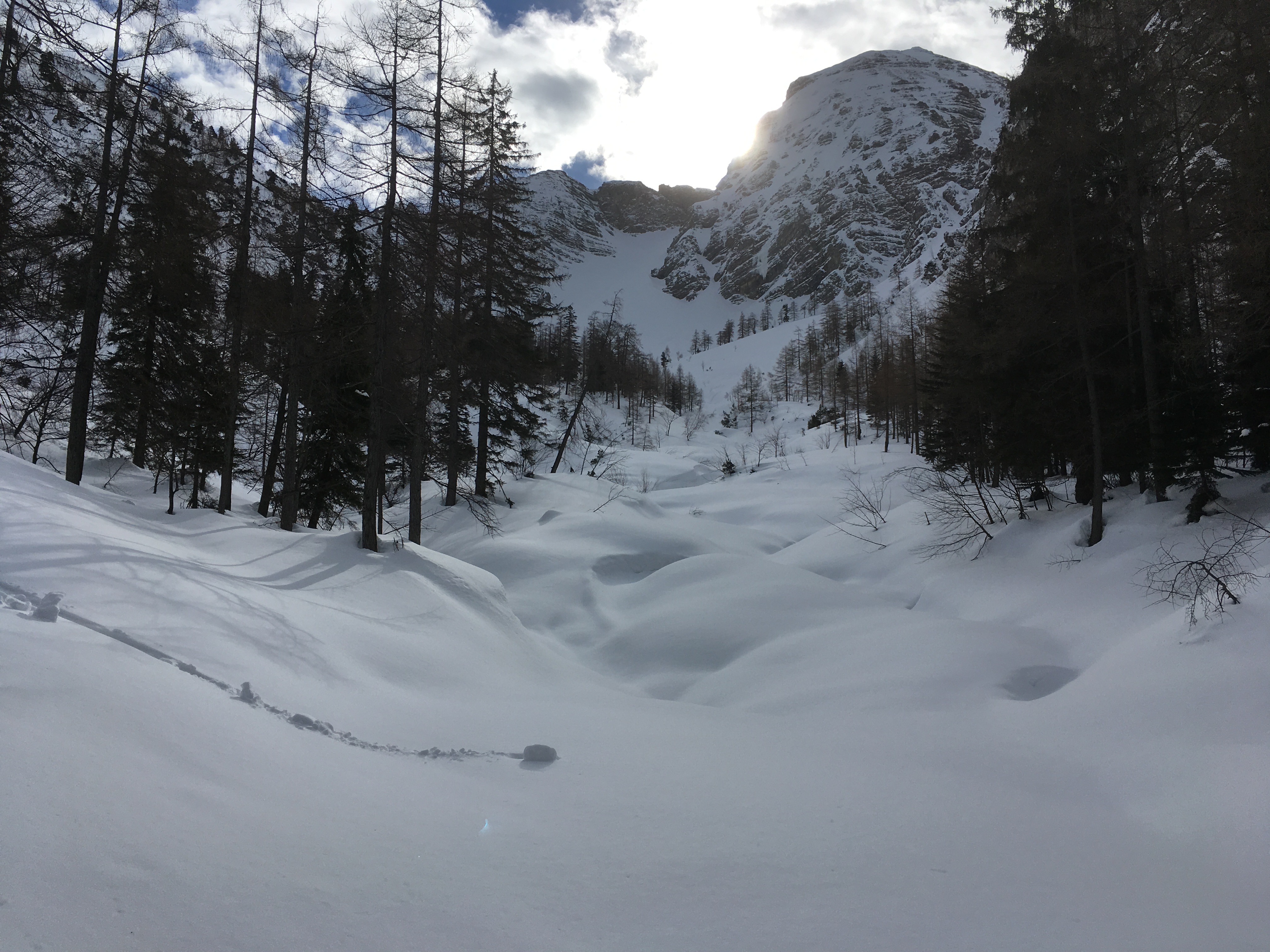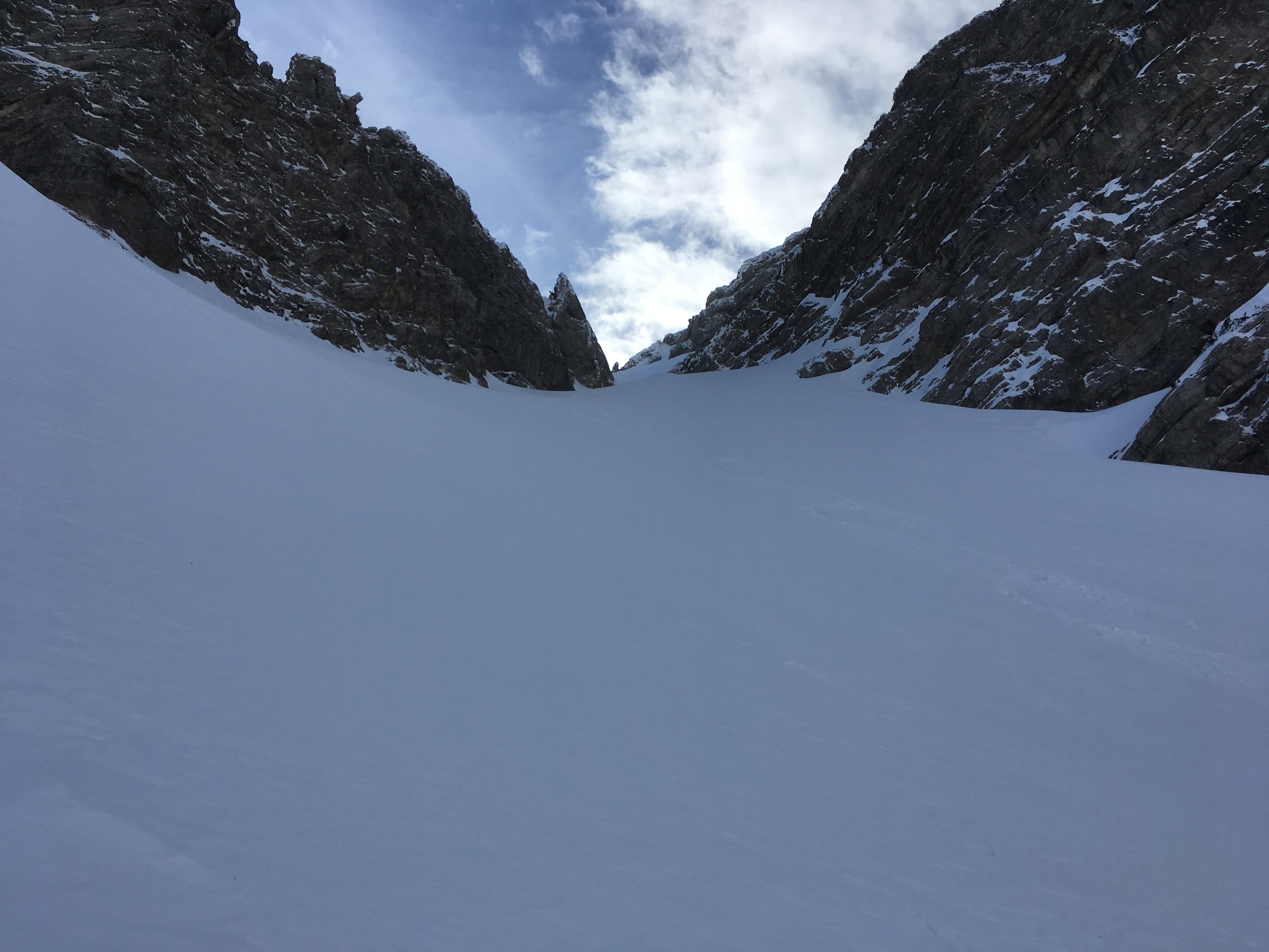 Tourenverhältnisse: recht feuchter Schnee bis ca. 1.500 m, darüber guter Pulver, am Rinnenausstieg eine noch ganz dünne Schicht Triebschnee