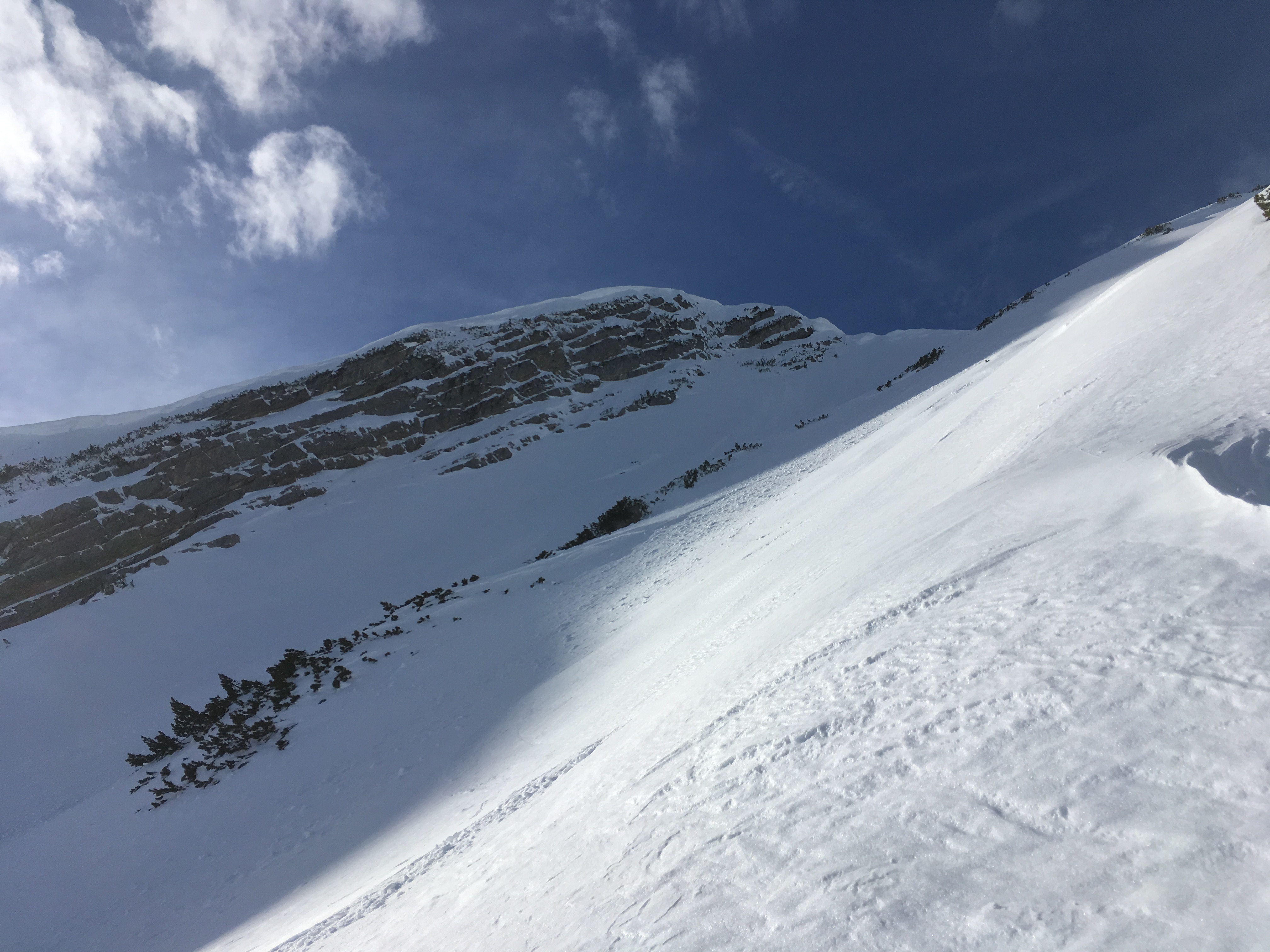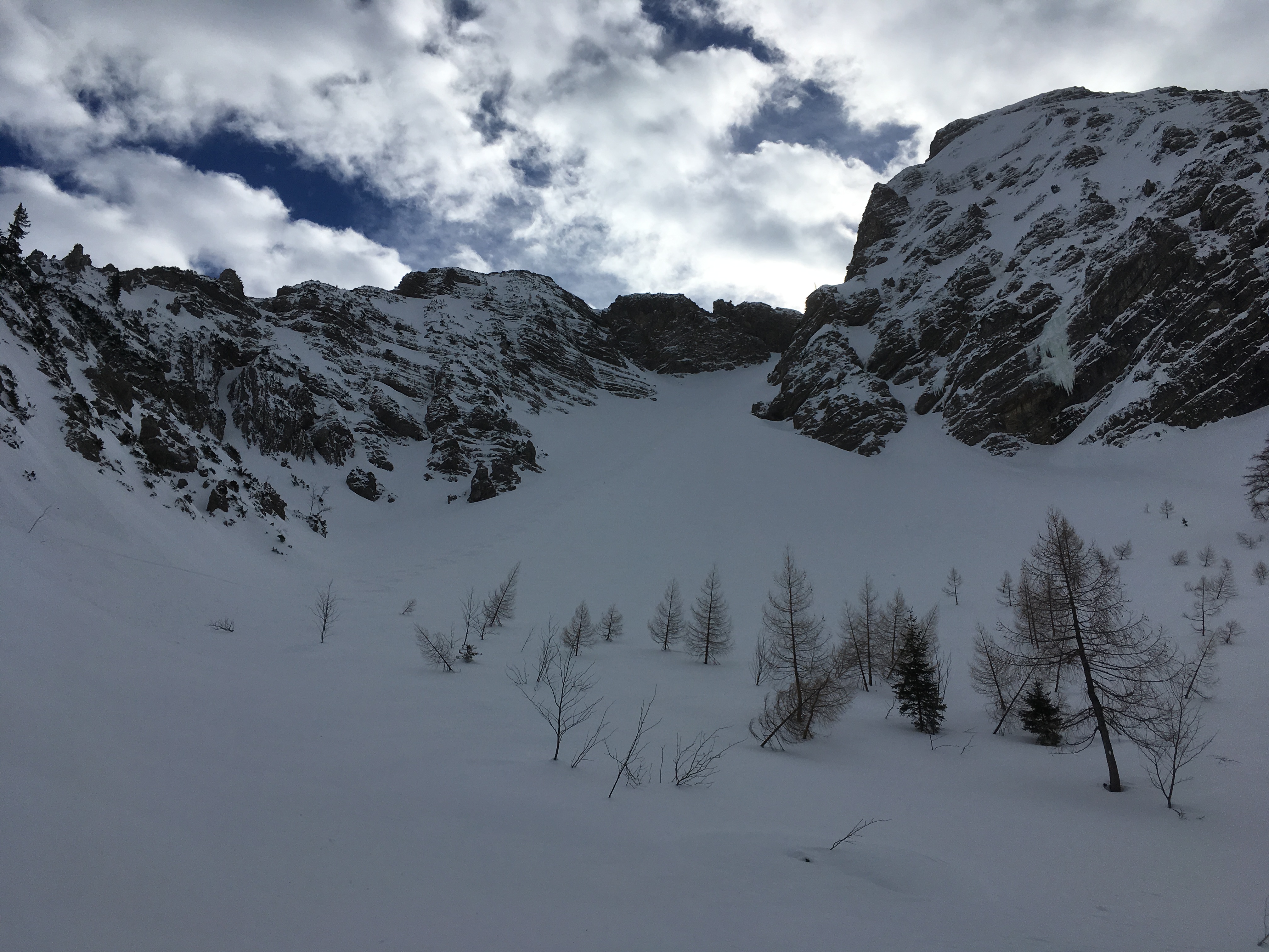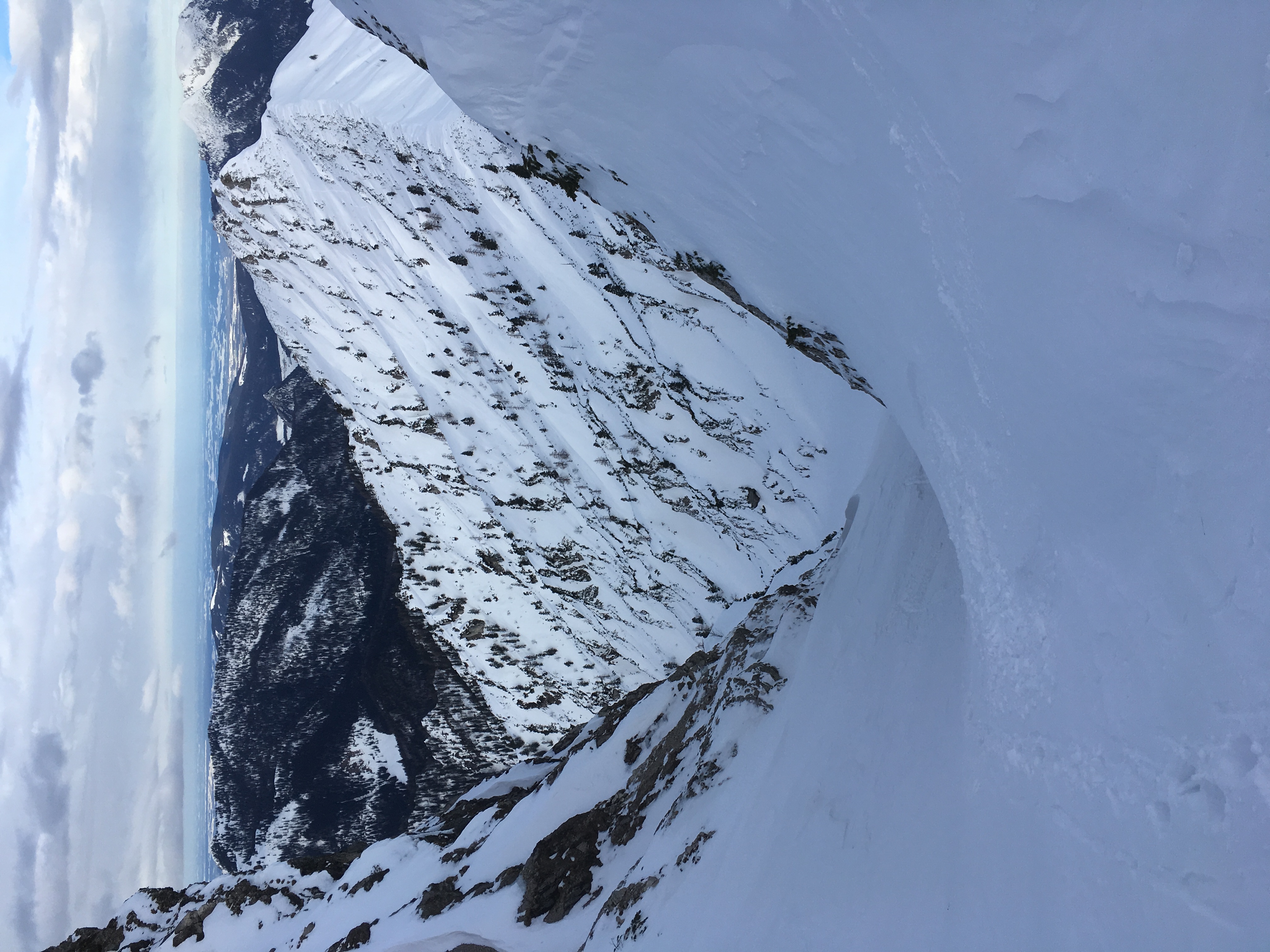 Tourenverhältnisse: recht feuchter Schnee bis ca. 1.500 m, darüber guter Pulver, am Rinnenausstieg eine noch ganz dünne Schicht Triebschnee