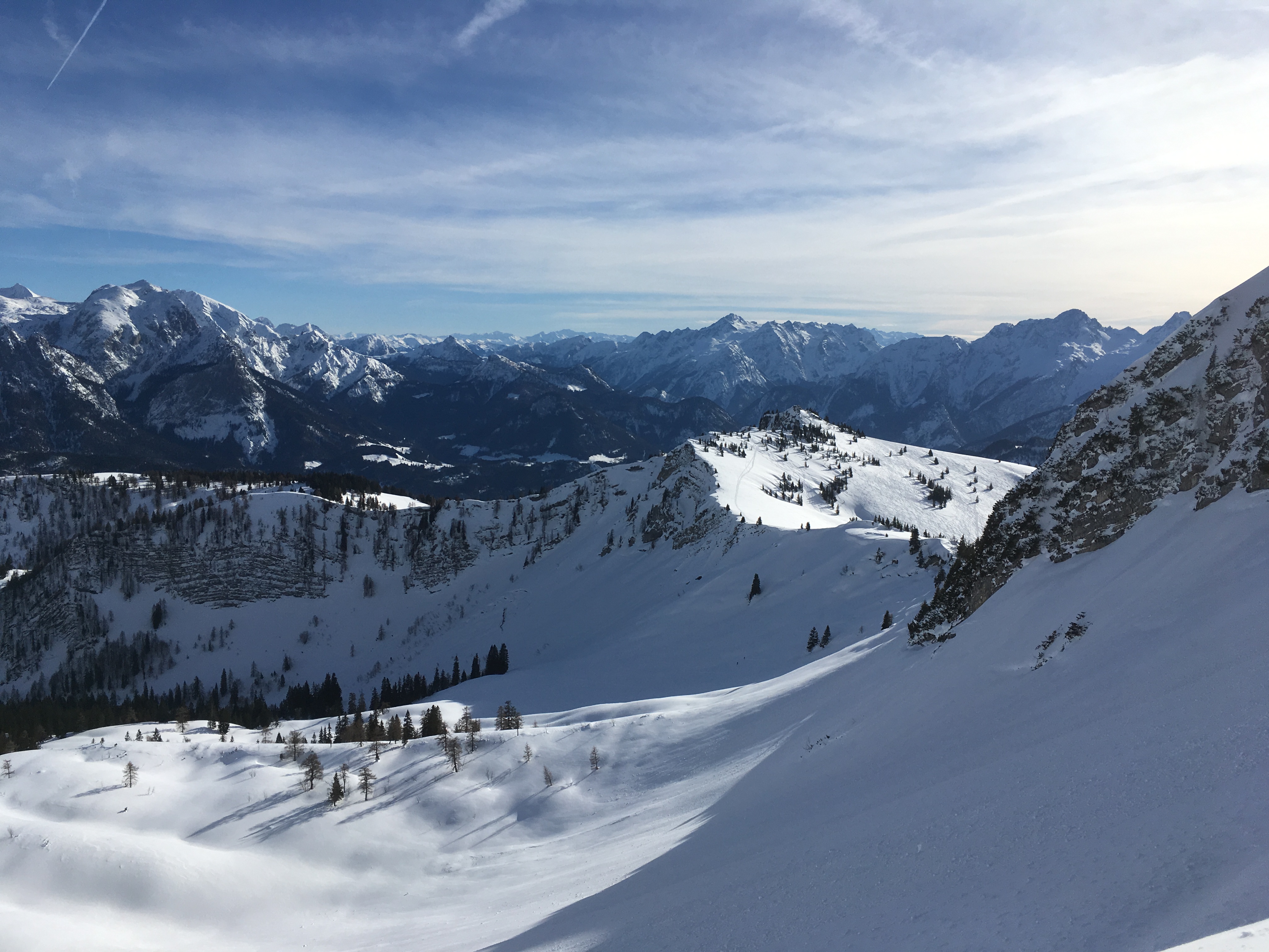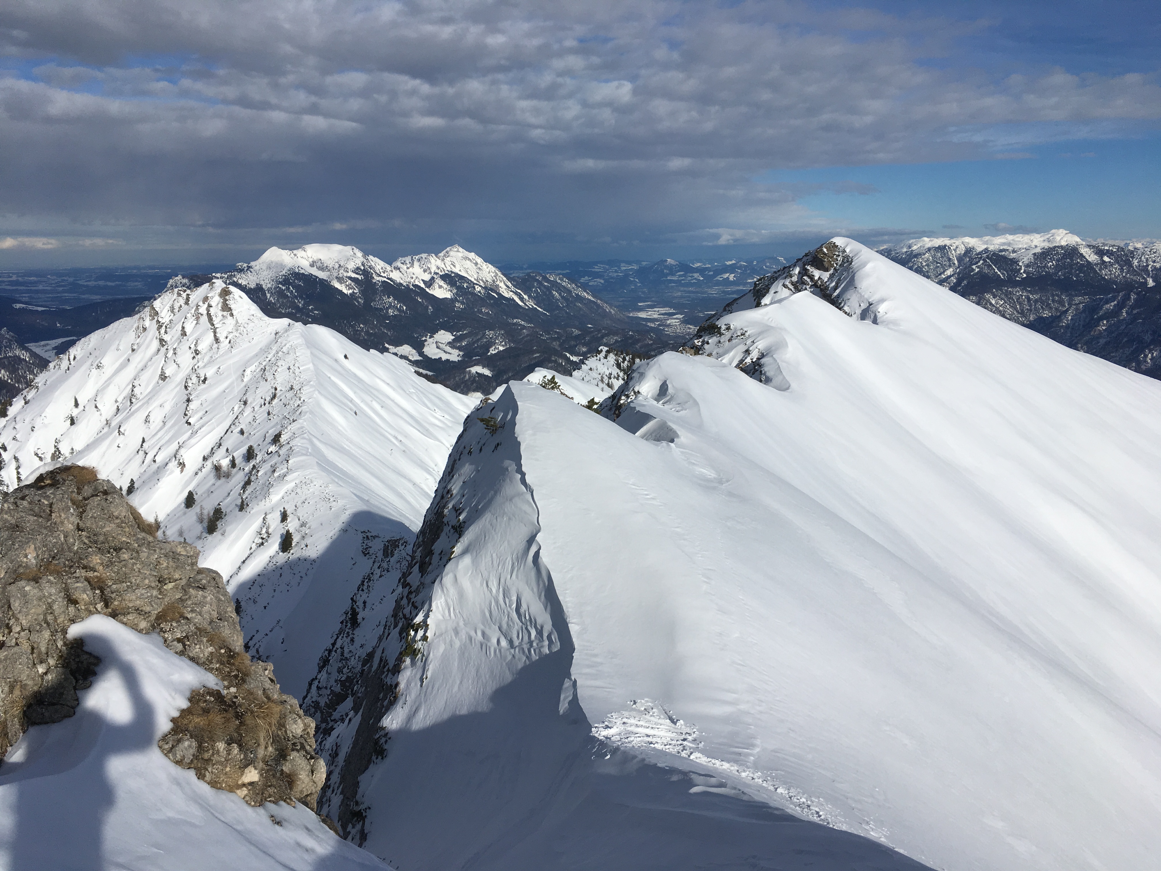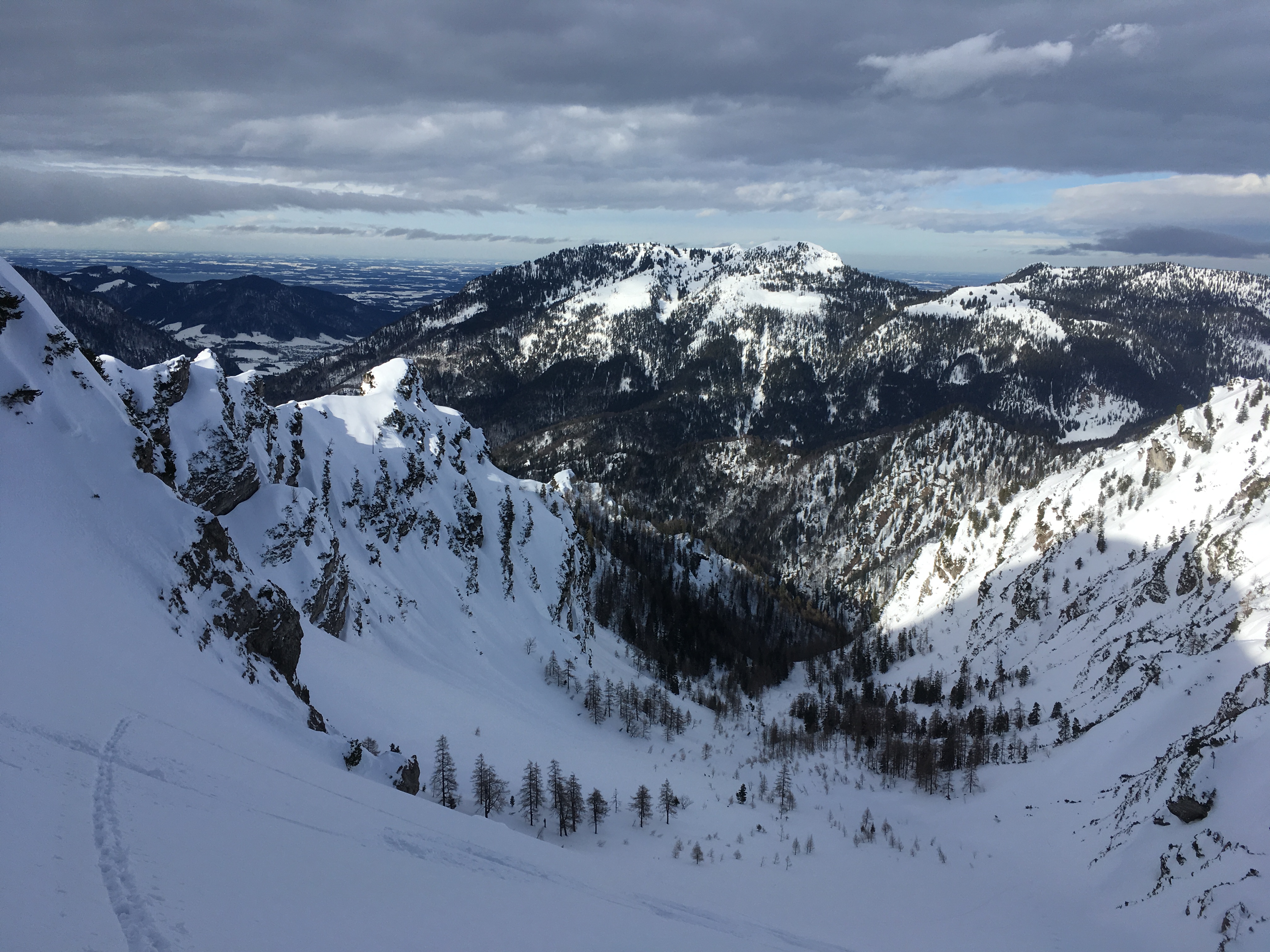 Sonstiges: Gestern ging es von Ruhpolding (Laubau) den im Winter nur selten begangenen Nordanstieg auf das beliebte Sonntagshorn. Bis zur Schwarzachenalm ist (skitauglich) geräumt. Danach musste ich zu meiner Überraschung dann alles spuren. Zunächst lange in etwa entlang des Sommersteigs in den Hinteren Kraxenbacher. Viel Kampf mit Büschen, umgestürzten Bäumen und Gräben. Wer die Tour nachmachen will, sei vorgewarnt, dass es (erst recht mit viel Schnee) wirklich mühsam und zeitaufwändig ist. Eine Stelle mit Mure ist auch nur erschwert passierbar, am besten kurz stapfen und dabei erst ab-, dann wieder ansteigen. Ab ca. 1.000 m wird das Gelände etwas skifreundlicher. Zunächst hält man sich in Aufstiegsrichtung rechts des Grabens, dann beim Wasserfall links des Grabens (Übergang nicht verpassen!). Hier sind einige Meter sehr steil. Im eigentlichen Kar wird es dann richtig entspannt, wenngleich es gestern stark stollte. Die Aufstiegsrinne ist bis auf die letzten Meter recht breit. Die Mitnahme von Harscheisen ist da grundsätzlich zu empfehlen. Auf Grund der späten Tageszeit und der ungewissen Dauer des Rückwegs (keine durchgehende Abfahrt, immer wieder geht es auch leicht mit Skiern hinauf!) habe ich dann etwas oberhalb der Scharte umgedreht und mir den Gipfel gespart.