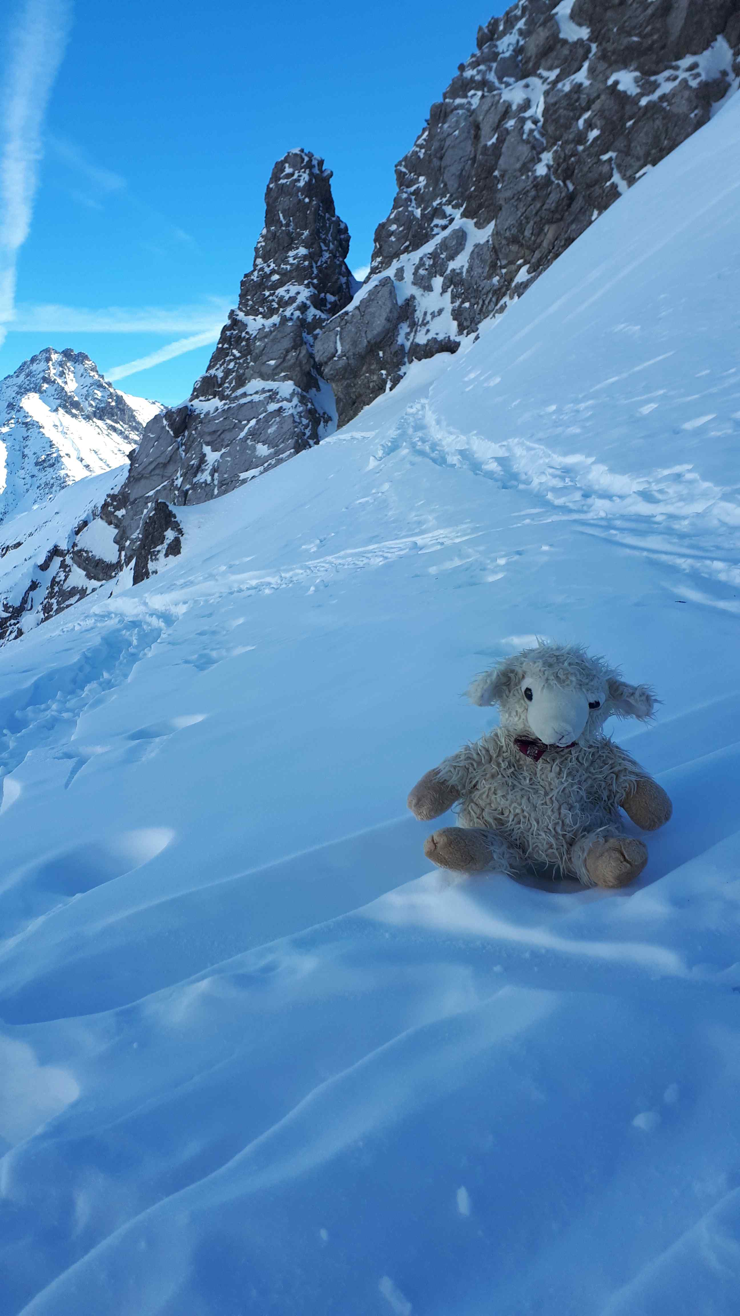 Der Pulverschnee war heute schon etwas schwerer. Die große Lawine lässt sich der Abfahrt ganz rechts ( hoch bleiben!) umfahren.