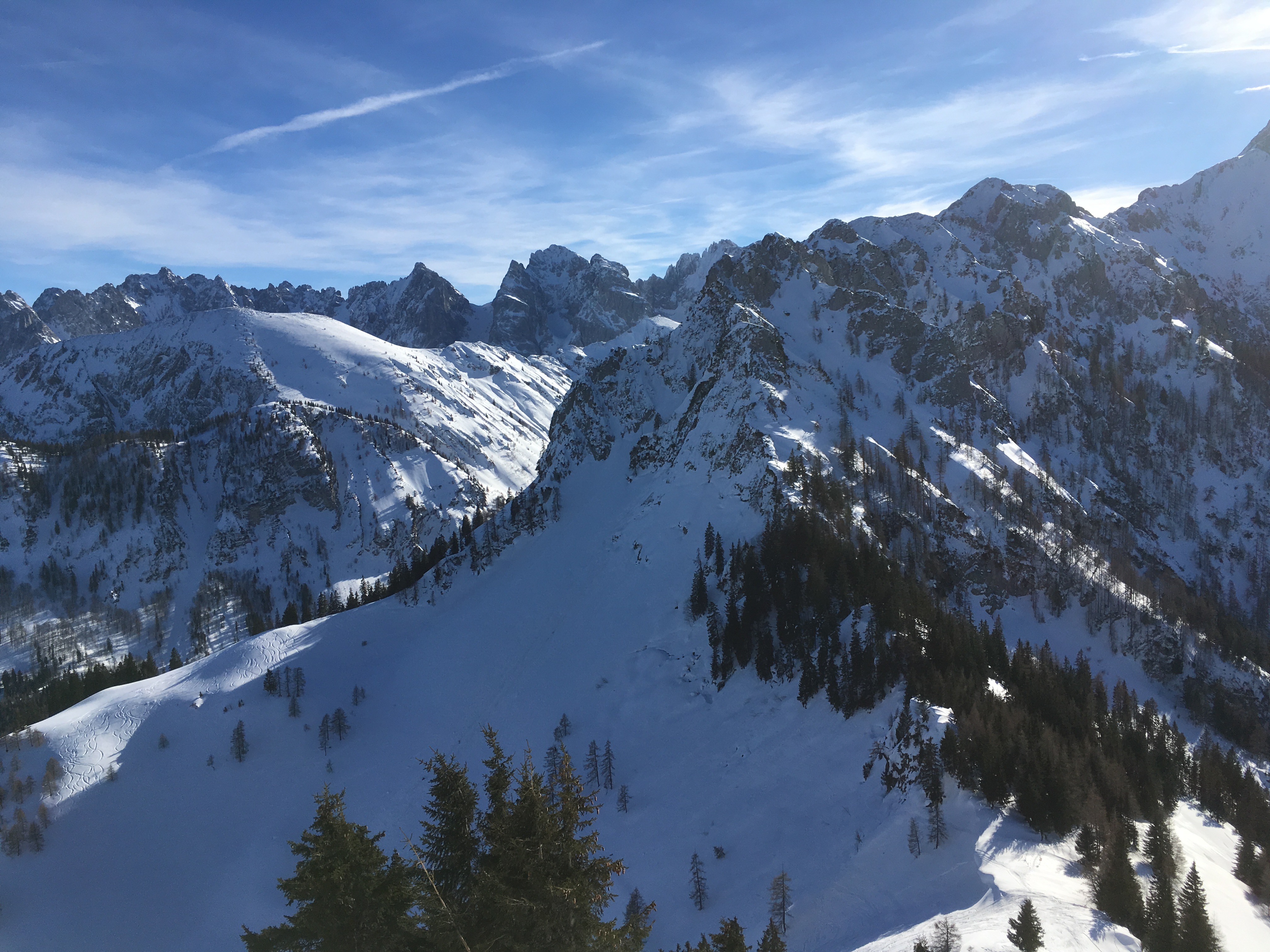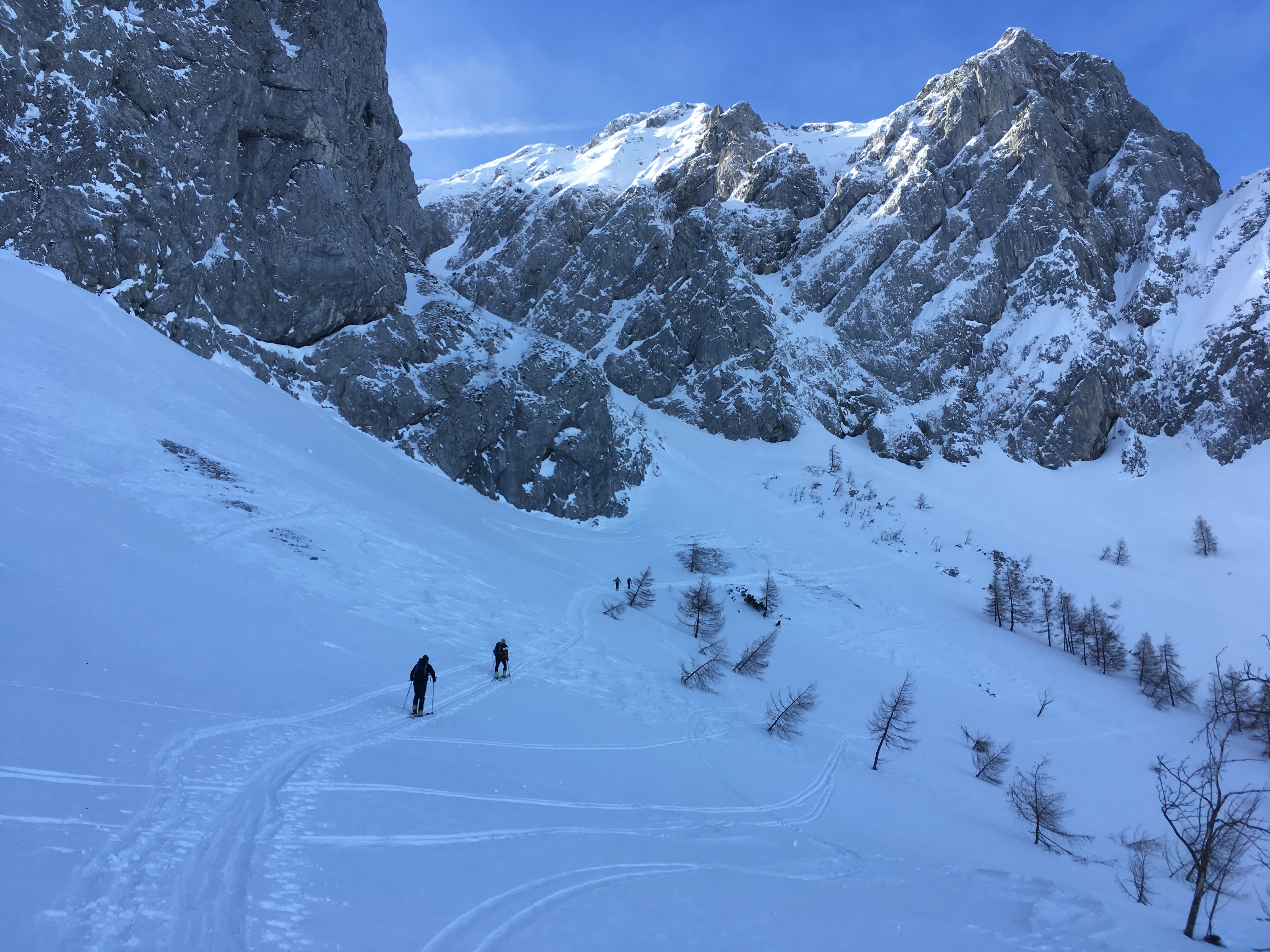 Gefahreneinschätzung: Scheiblingsteinkar geht nur bei sicherer Lawinenlage; der Westanstieg zum Heuberg ist kurzzeitig sehr steil und lawinengefährdet