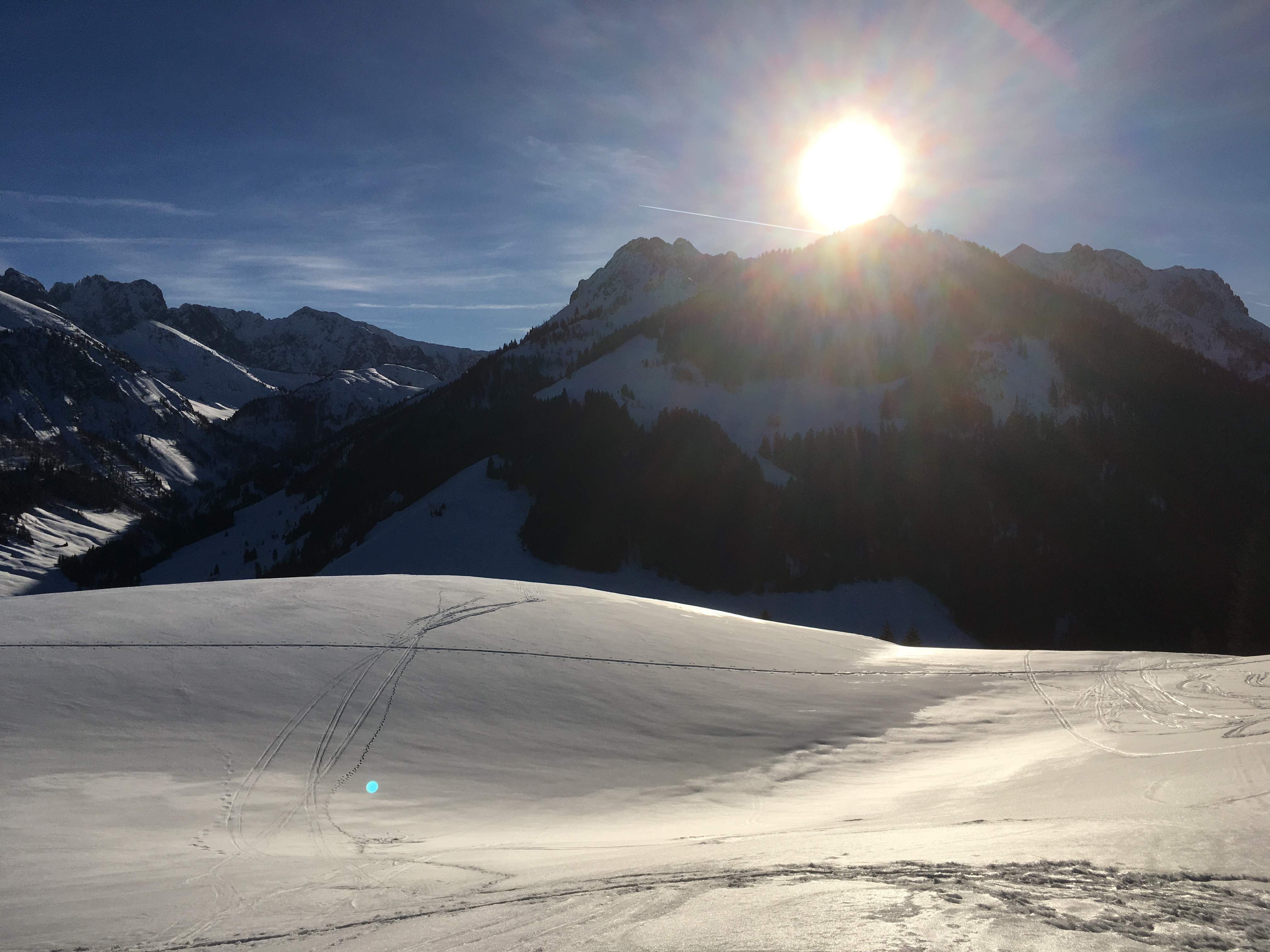 Am Nachmittag am Heuberg sehr warm, der Schnee leider eher schlecht. Am besten war es noch nach dem Gegenanstieg zum Ebersberg (firnartiger Schnee).