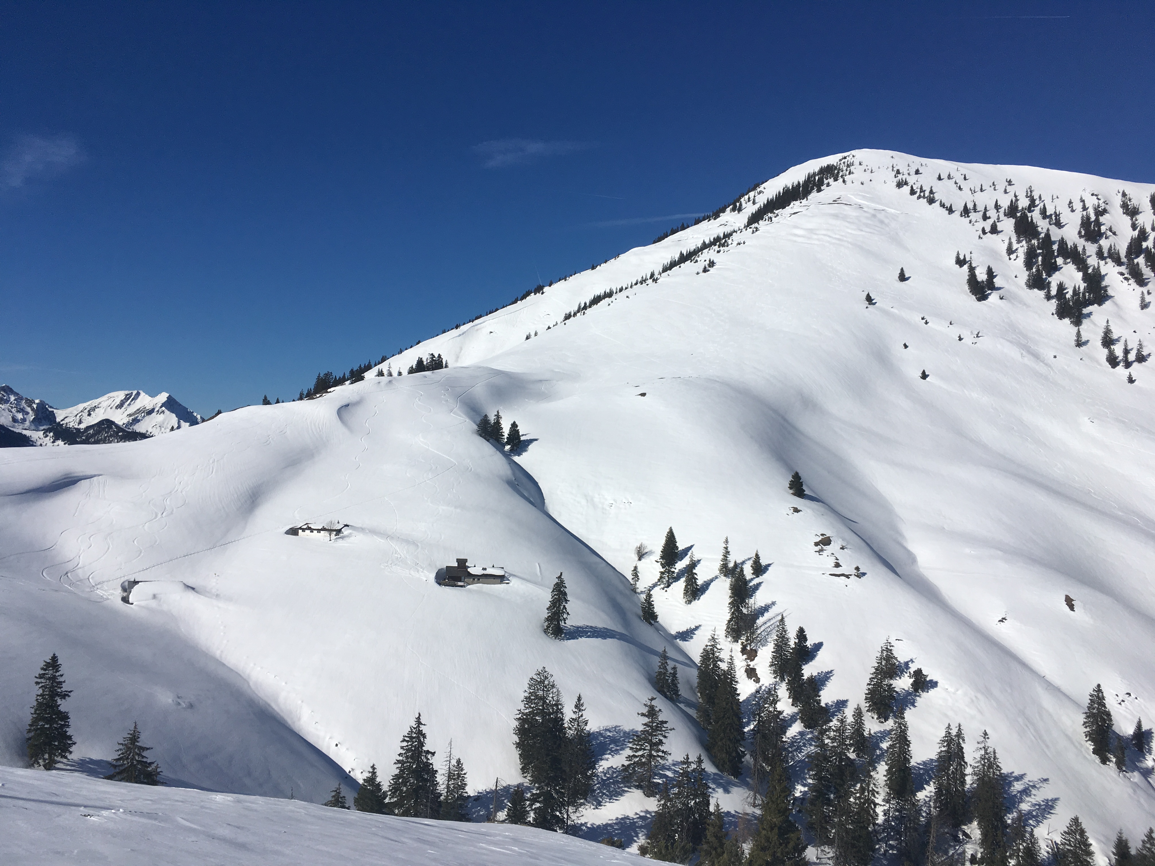 Tourenverhältnisse: nordseitig teilweise noch Pulver, aber schon stark zerfahren; südseitig grundsätzlich wohl Firn, Abfahrt um 12:30 Uhr war aber viel zu spät