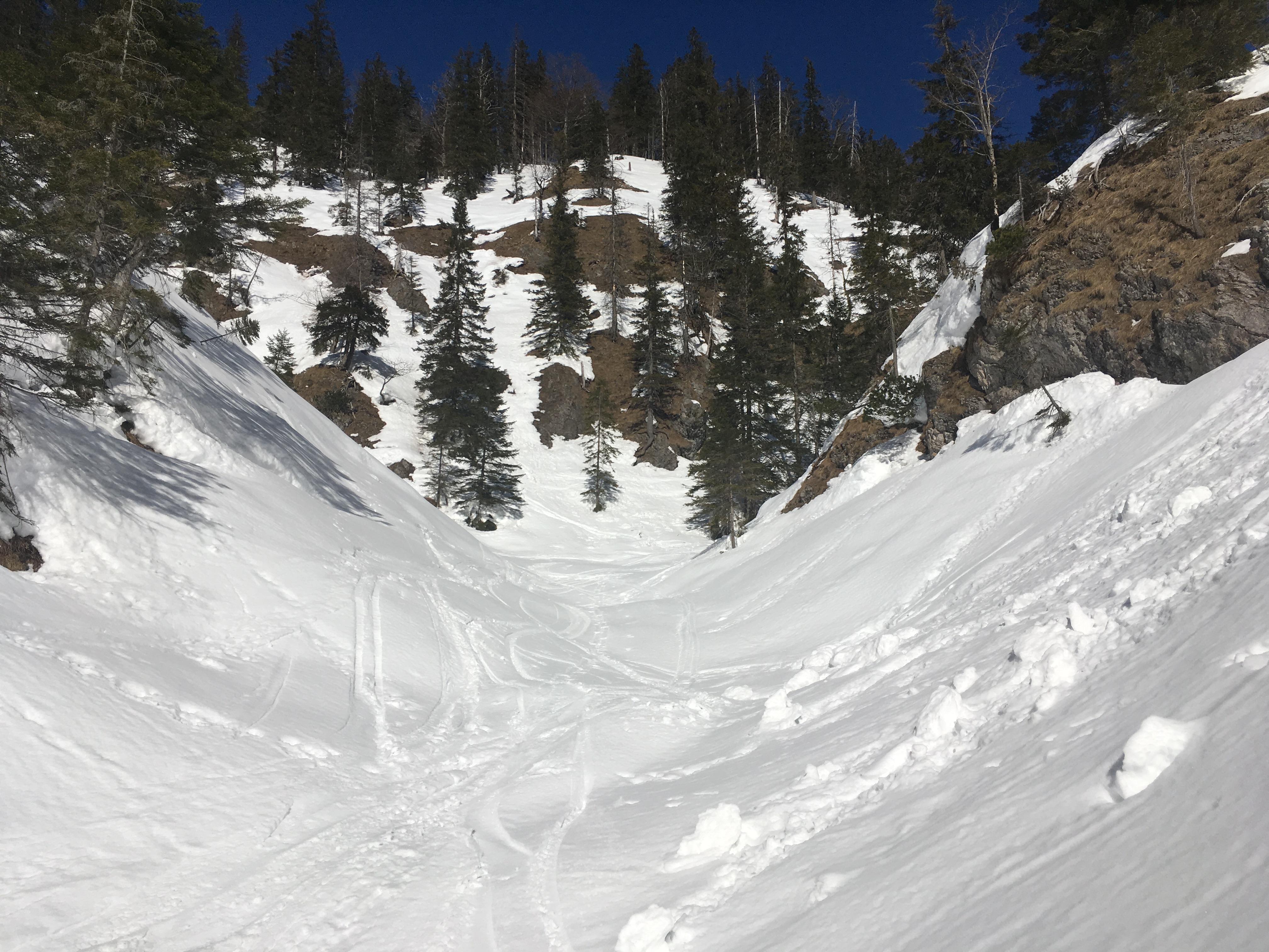 Gefahreneinschätzung: Nordanstieg gering, Südabfahrt Problem von Gleitschneelawinen (schon zwei große Anrisse im Hang) und im Bachbett Lawinen aus den Flanken