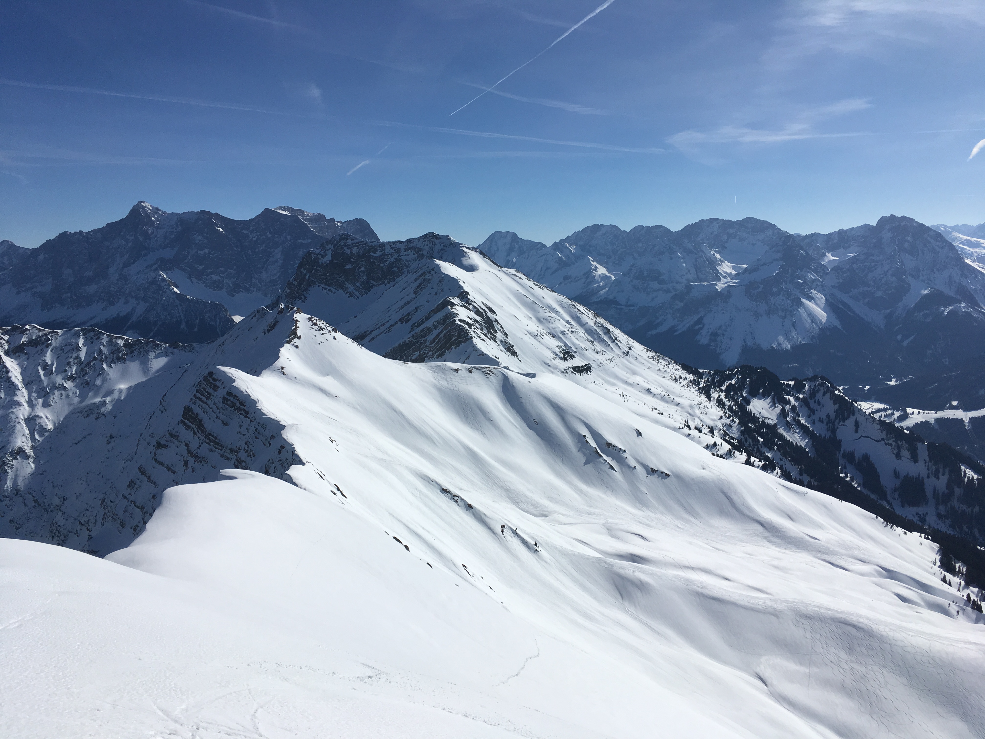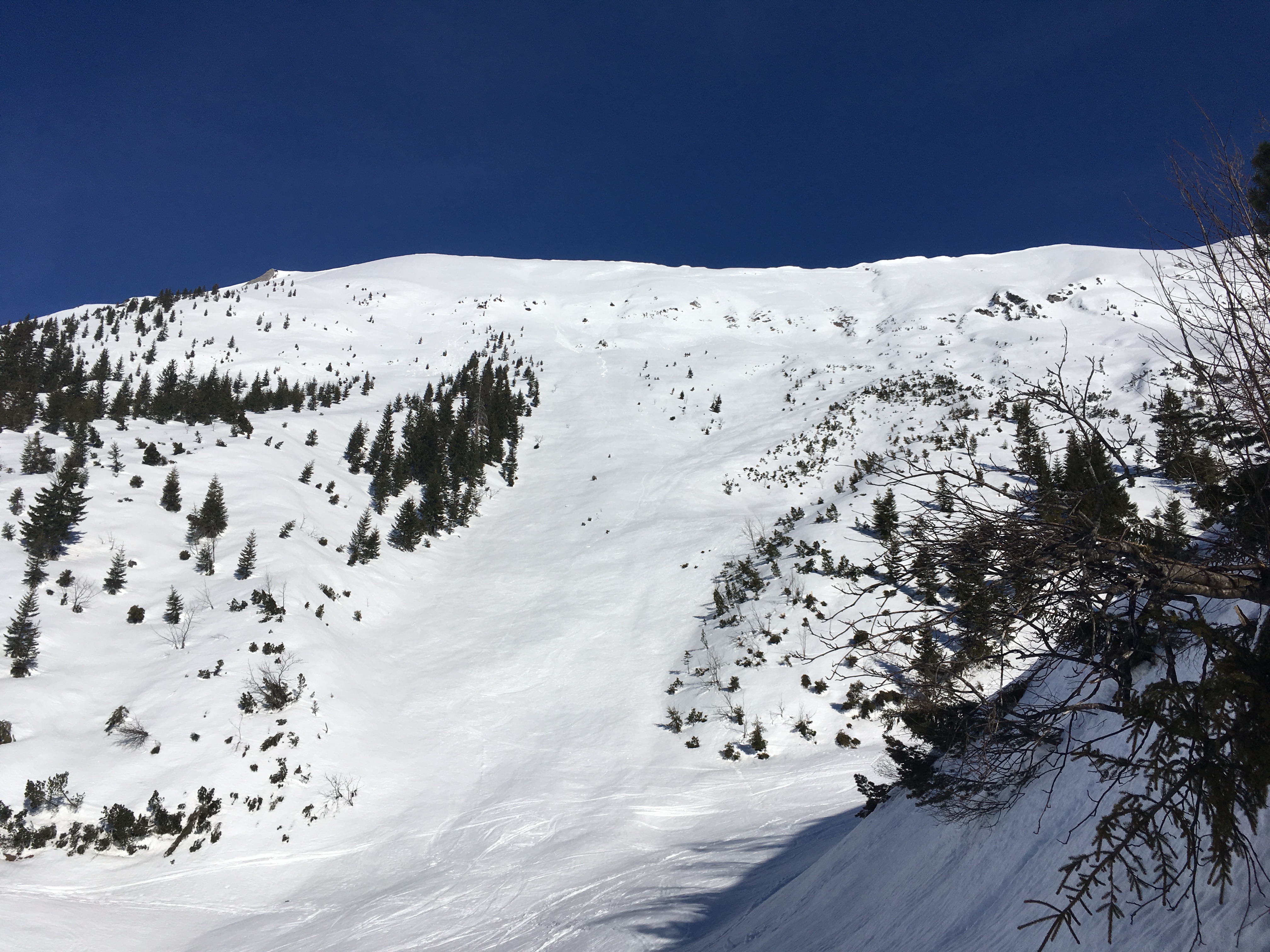 Sonstiges: Heute gab es eine verhältnismäßig kurze, weil steile Tour auf die Hochschrutte (Hauptgipfel neben dem allseits bekannten Pfuitjöchle). Im Aufstieg wählte ich zunächst die Normalroute zum Pfuitjöchle - über das Wiestal wäre es zwar etwas direkter, aber dann bewegt man sich längere Zeit in dem engen Graben, wo oberhalb noch einiges darauf wartet, als Lawine abzugehen. Bei Erreichen der Almstraße auf ca. 1.590 m dann nach links und leicht fallend zum Ausstieg des Wiestales. Ich bin dann direkt den dortigen Hang hoch (kurzzeitig sehr steil, hier stapfte ich ca. 30 Hm - zu Fuß allerdings Einsinken) und danach hoch zum Kamm und über diesen sowie zuletzt im S-Hang unter den Wächten gequert. Möglicherweise etwas besser wäre es aber, sich von Anfang an ungefähr in Falllinie des Gipfelkreuzes zu halten.