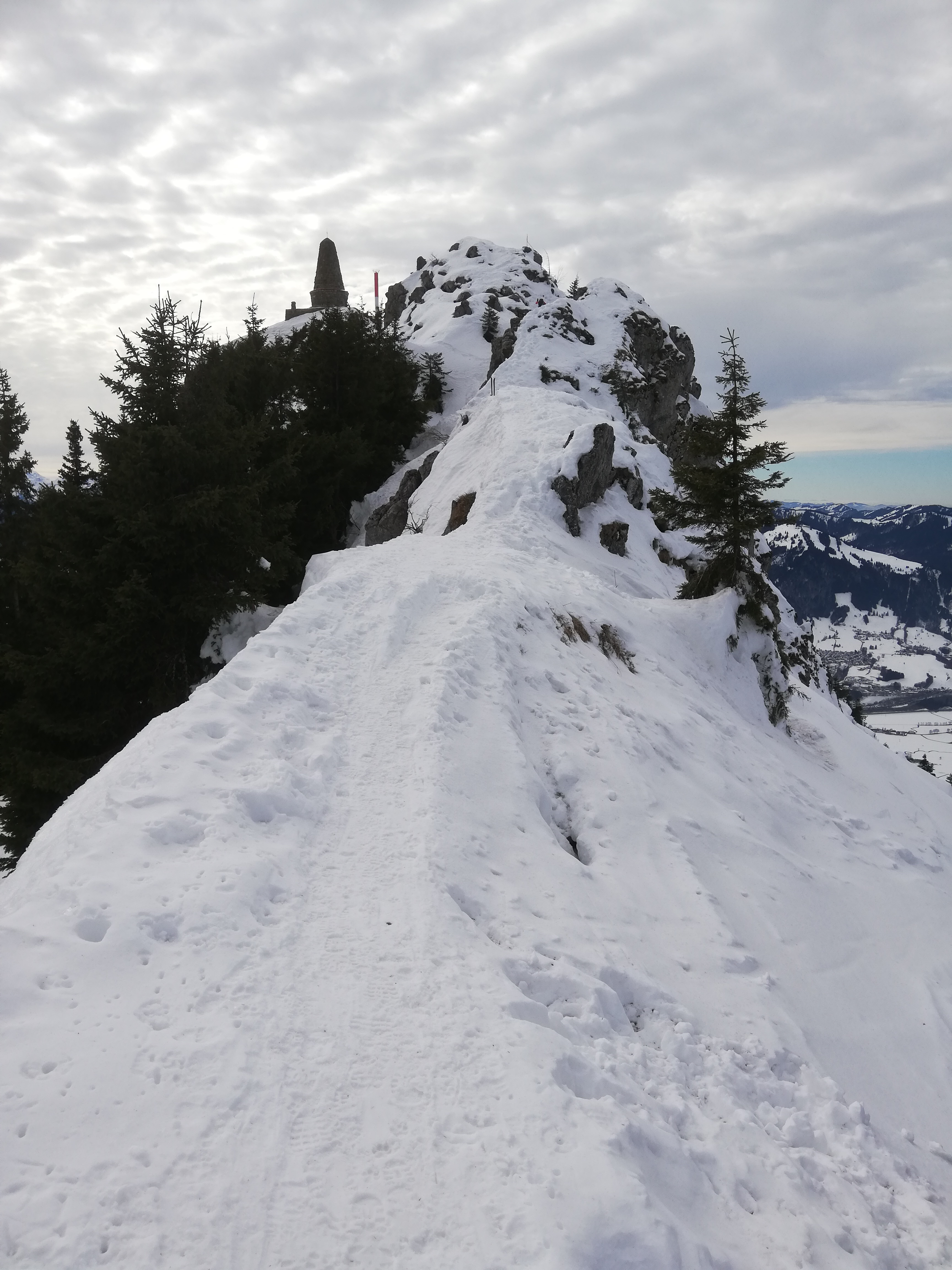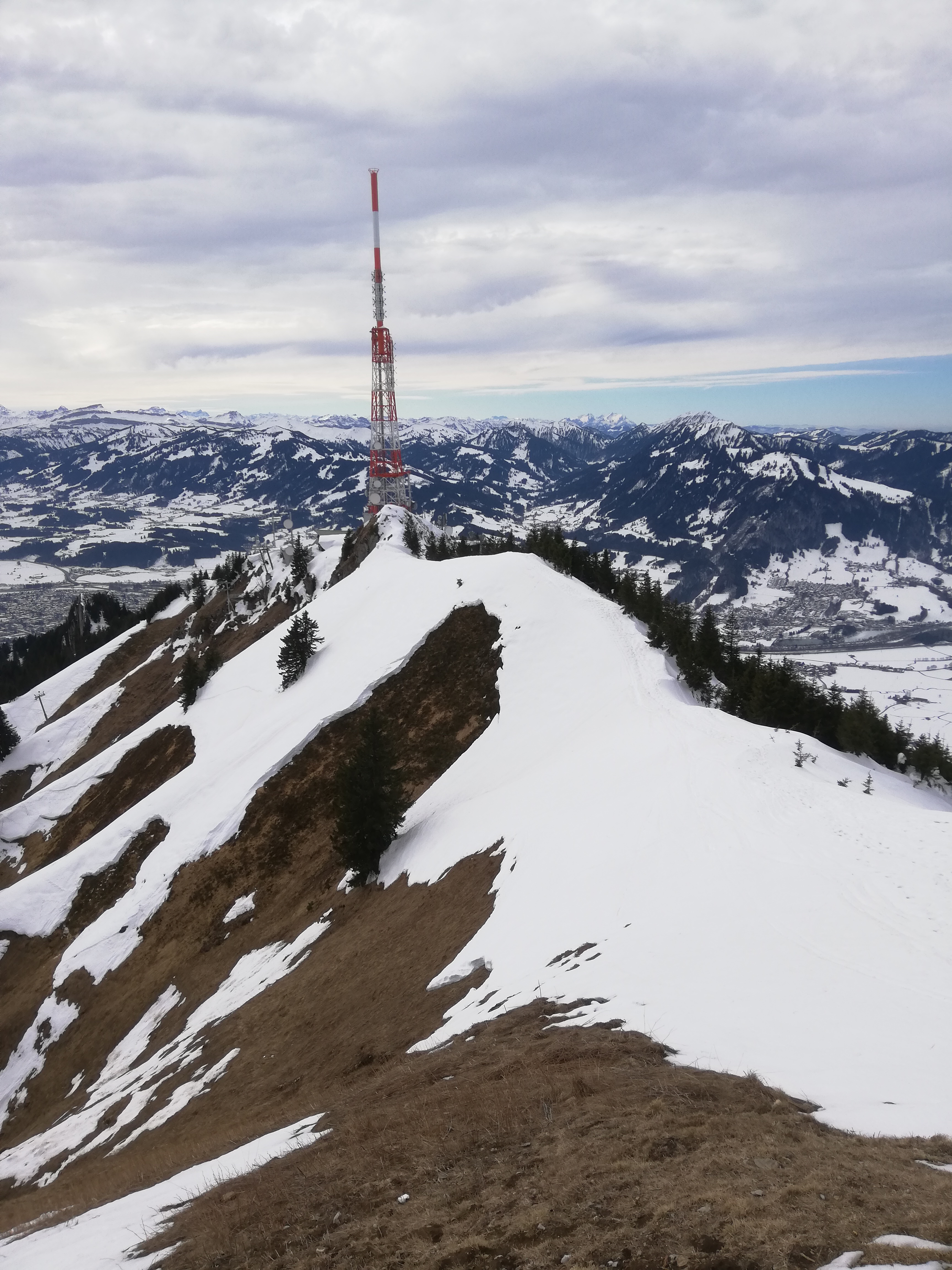 Vormittags nach frostiger Nacht tragend verharscht. Am Rücken zwischen 1550m und 1650m zeitweise starker Wind, der zum Gipfel hin aber wieder abnahm. Gipfelgrat problemlos. Bei der Abfahrt am Nachmittag oben griffiger, nach unten weicher bzw. leicht sulziger Schnee, gut zu fahren.