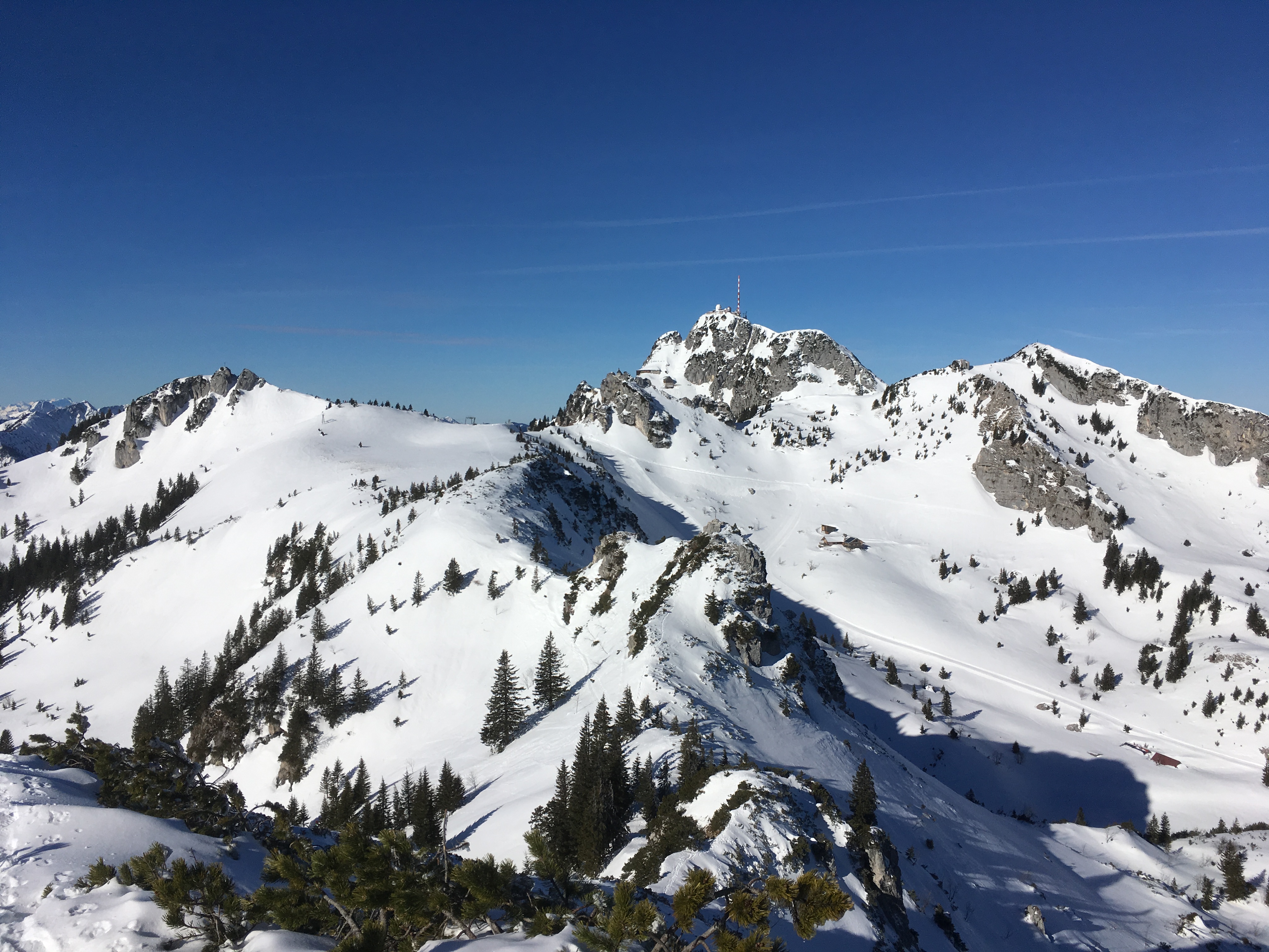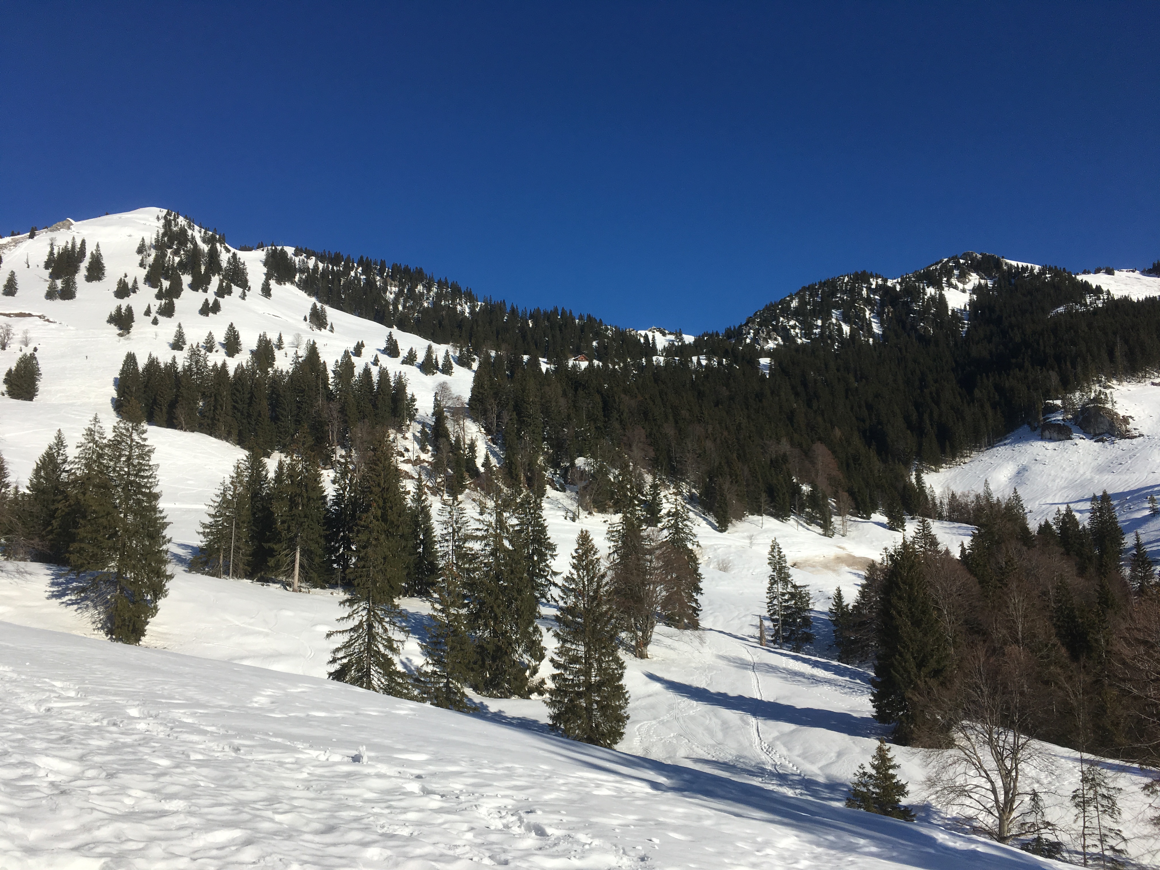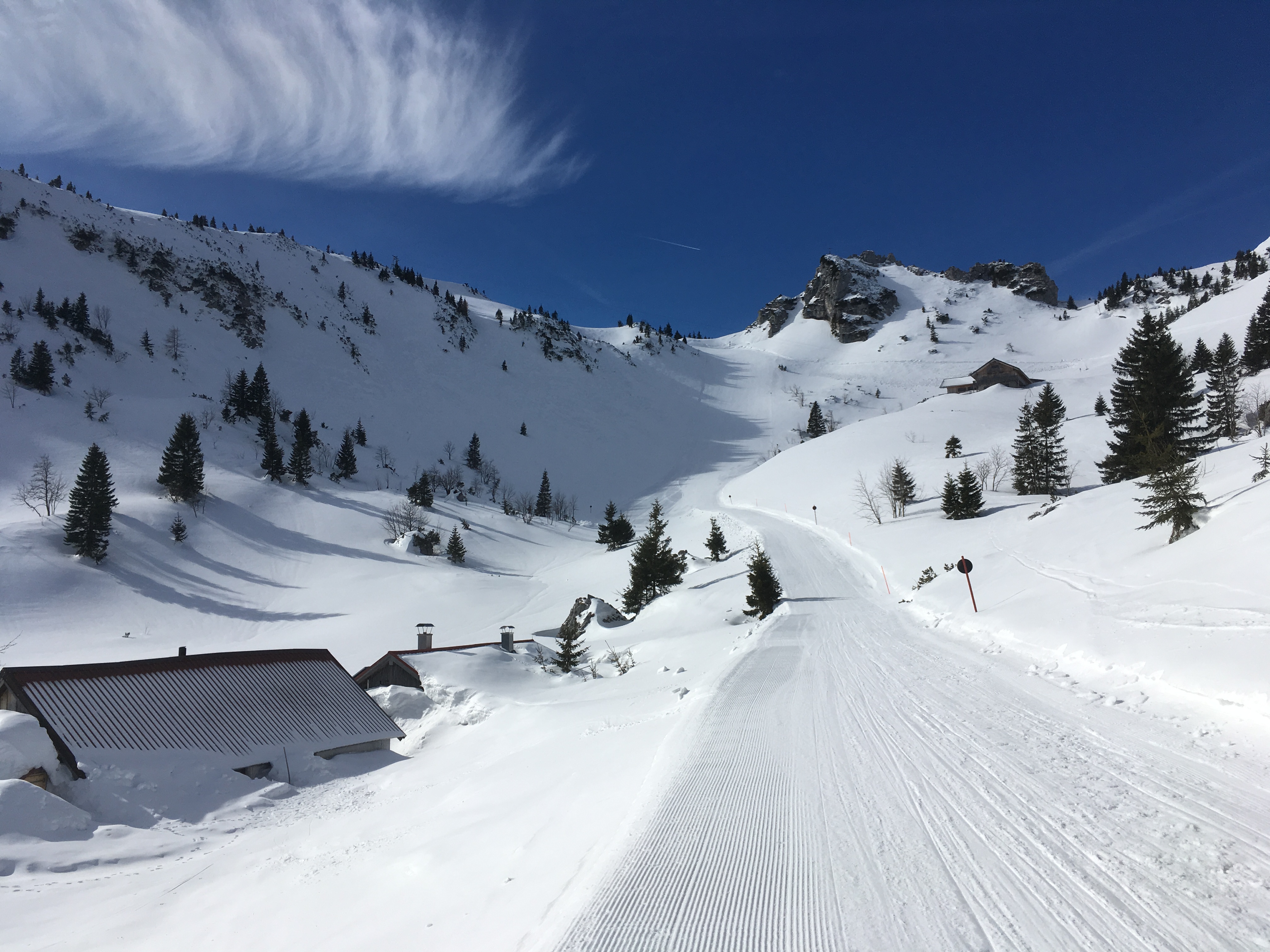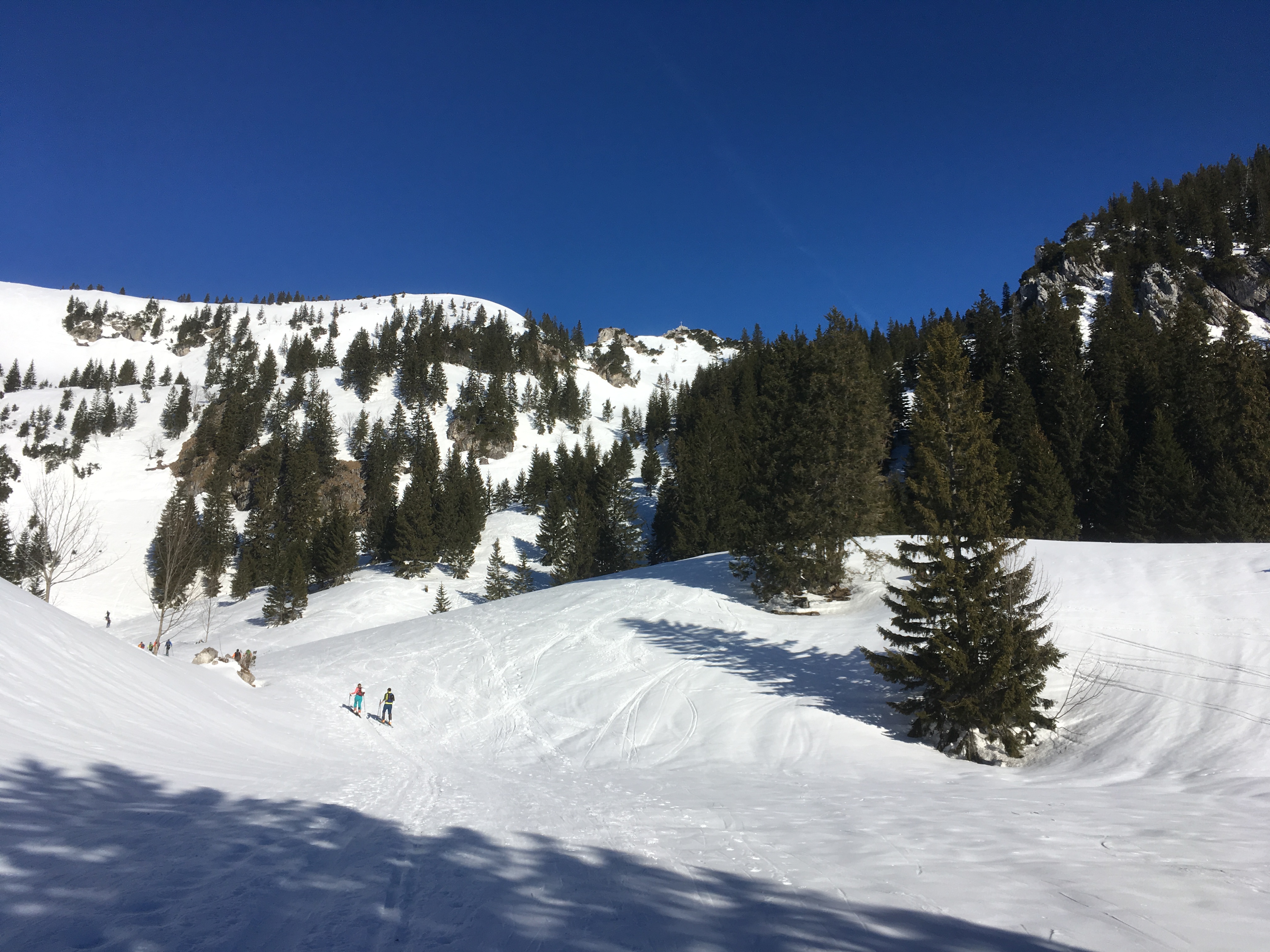 Tourenverhältnisse: sonnseitig weicht der Schnee am Vormittag auf, wegen der vielen eingefrorenen Spuren aber häufig keine idealen Firnverhältnisse; schattseitig hart oder minimal Pulver auf sehr harter Schneedecke