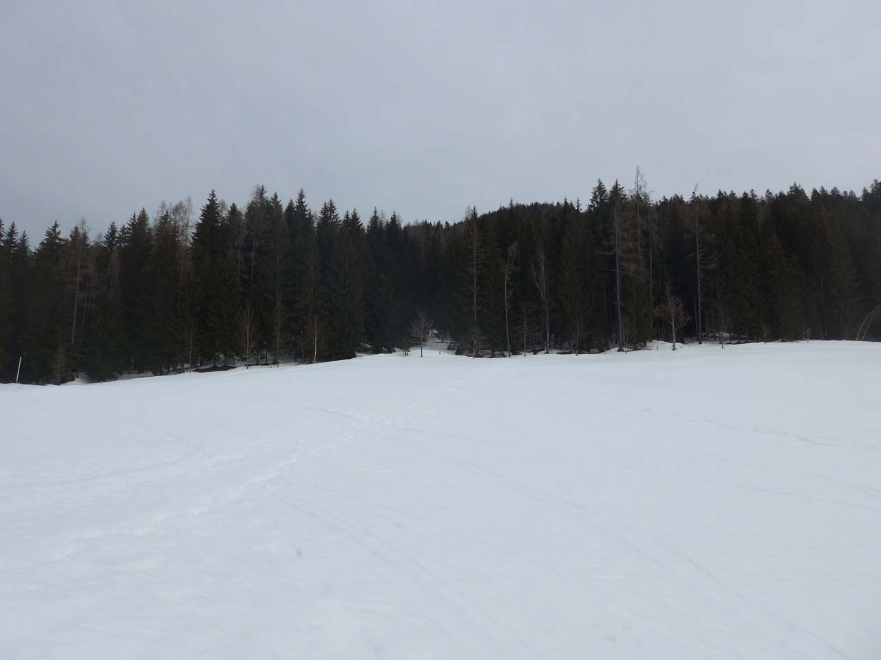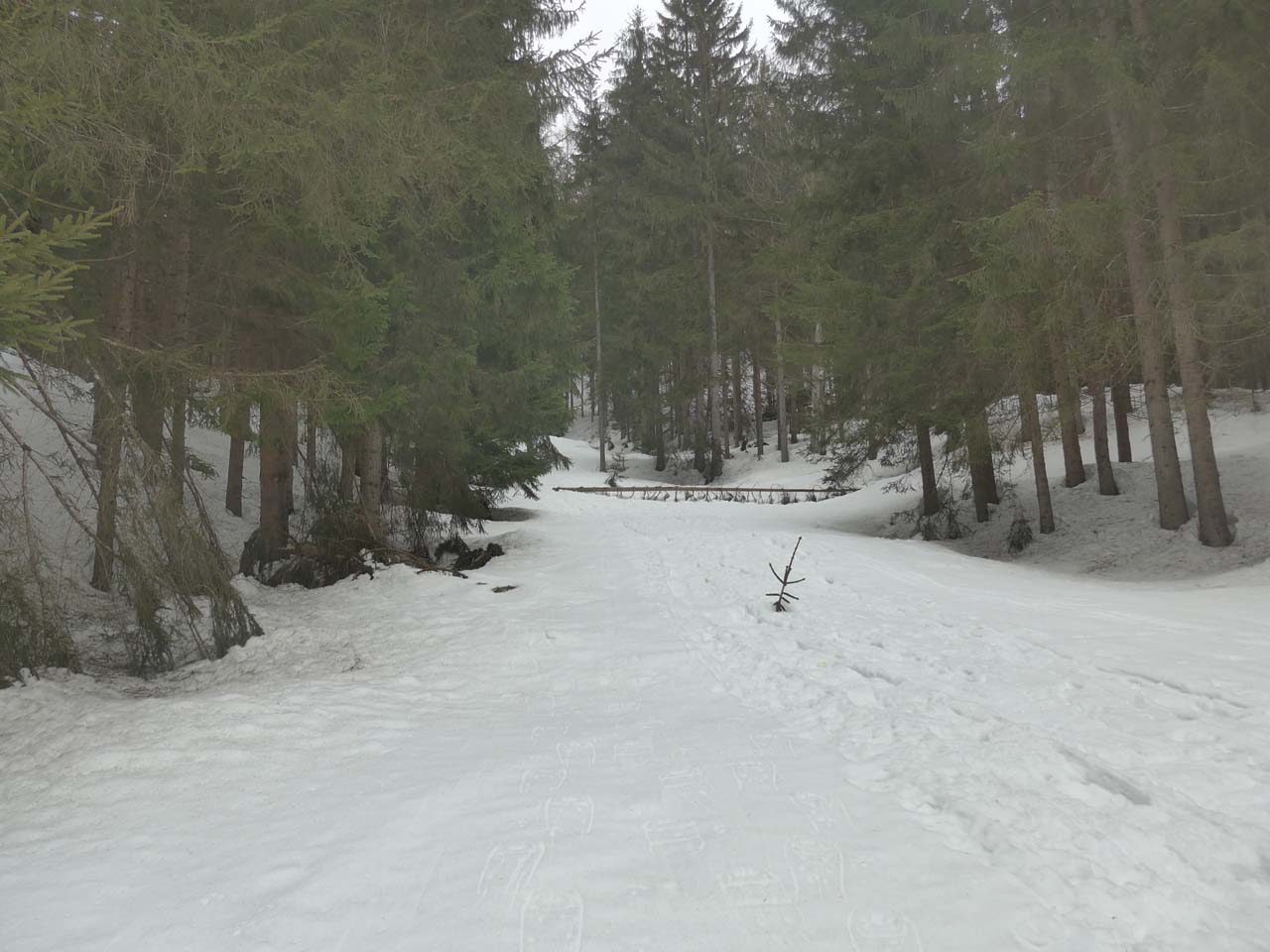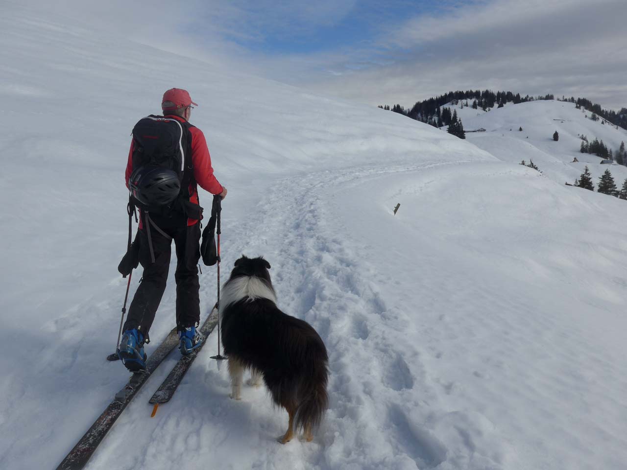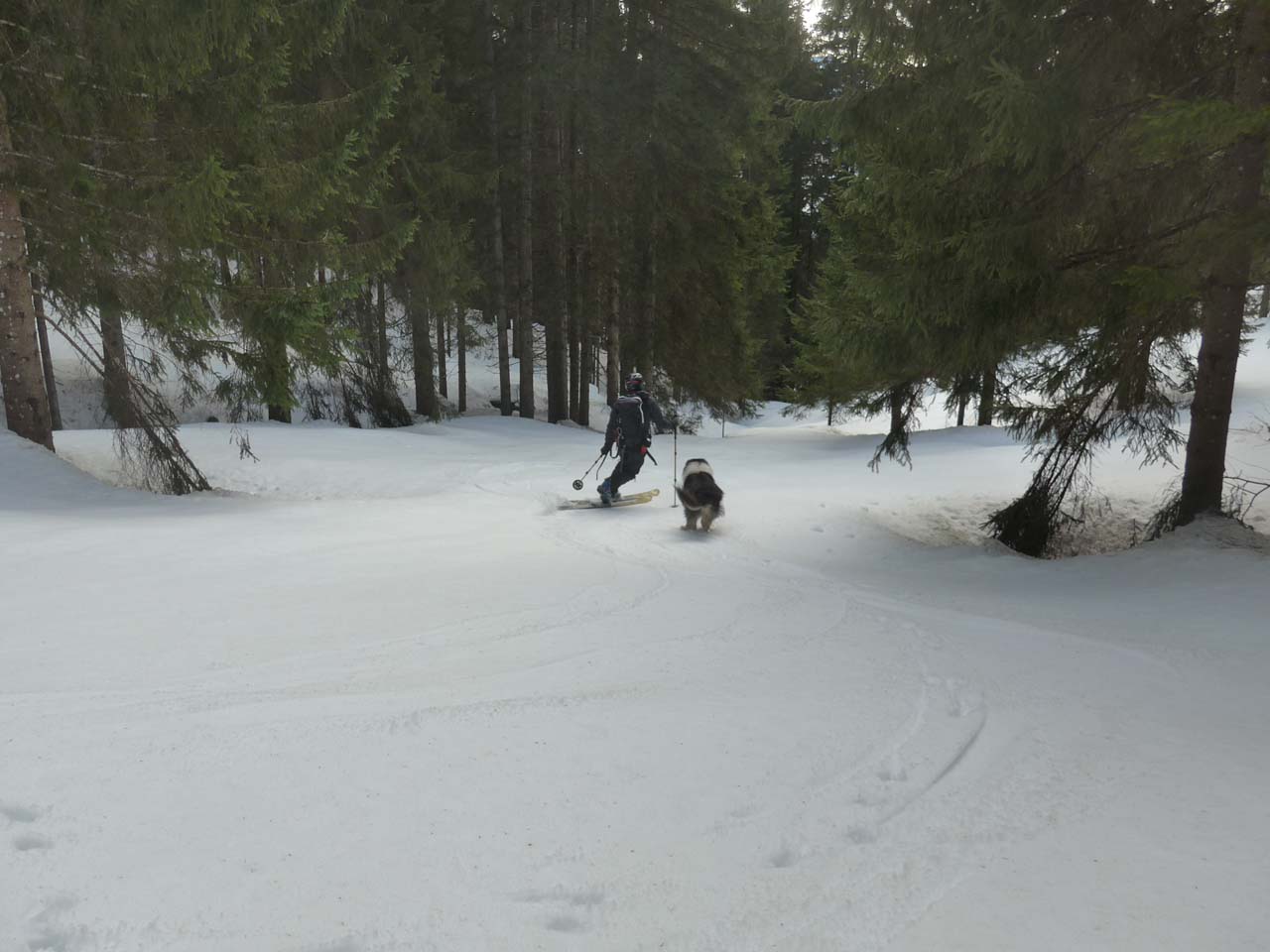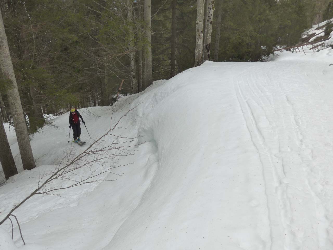Durchgängig ausreichend Schnee. Auch im Wald. Auf dem Forstweg dreimal umgestürzte Bäume die mit Schi nicht passierbar waren (raus aus der Bindung, Schi drüberwerfen, nachklettern, Schi wieder anziehen...). Im Almengelände Firn mit einer ganz leichen knusprigen Frostschicht drauf. Der Forstweg war wegen eingefrorener Fußgänger- und Schneeschuhspuren zum Teil unangenehm abzufahren. Sobald man durch den lichten Wald abfahren konnte, traumhafte Verhältnisse, 3cm Firn auf festem Altschnee.